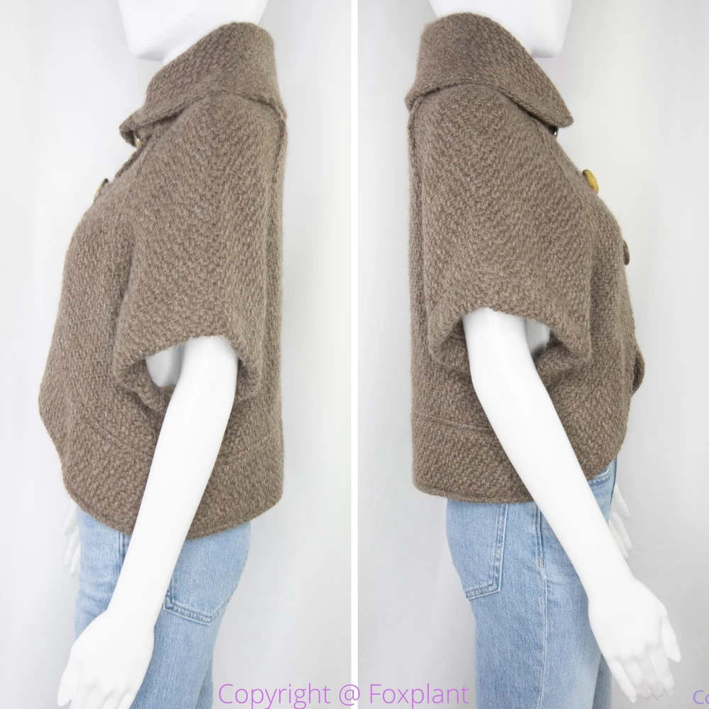 Women's Wool Alpaca button front short sleeves cardigan by John Branigan Branigan weavers Wool Alpaca Big retro button Curvy design front Poncho style Round collar Made in Ireland Materials: 85% Wool, 15% alpaca One size. Please check approx. laid flat measurements before purchasing: Back length from high point of shoulder down: 20 1/2'' Excellent condition. No noticeable flaws or stains or damages.