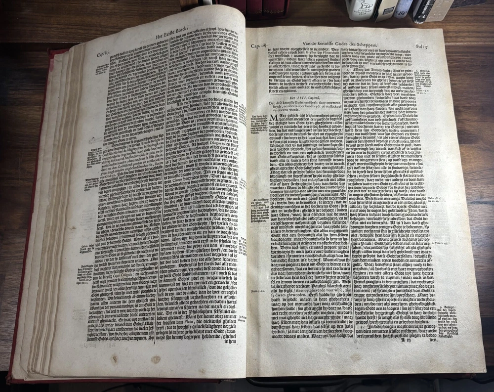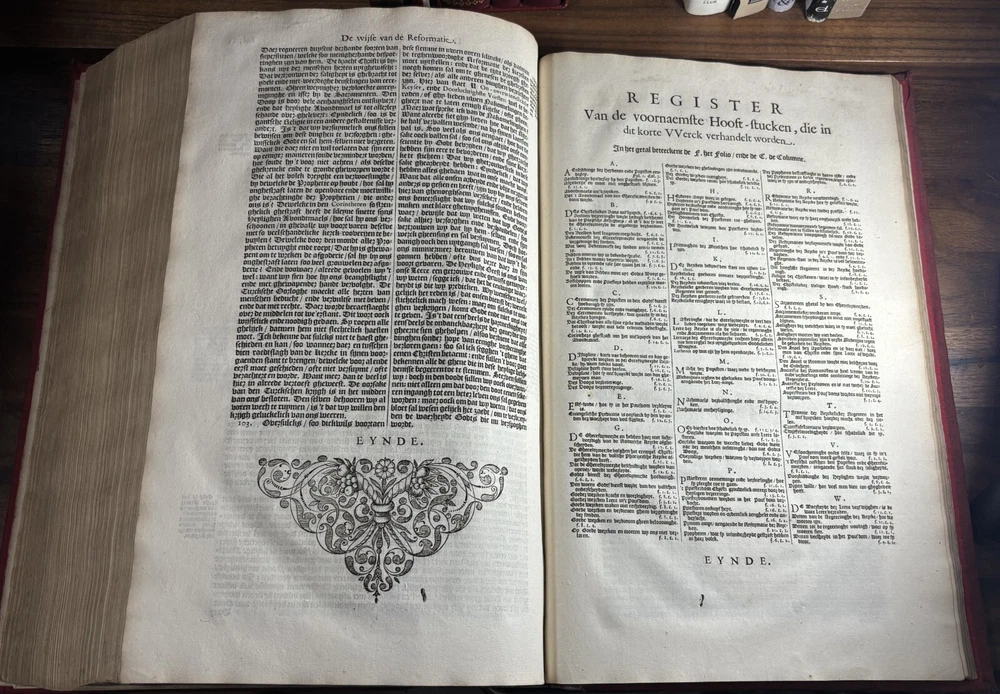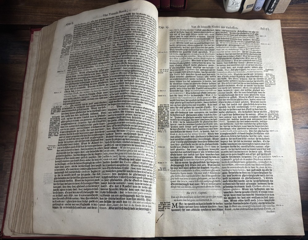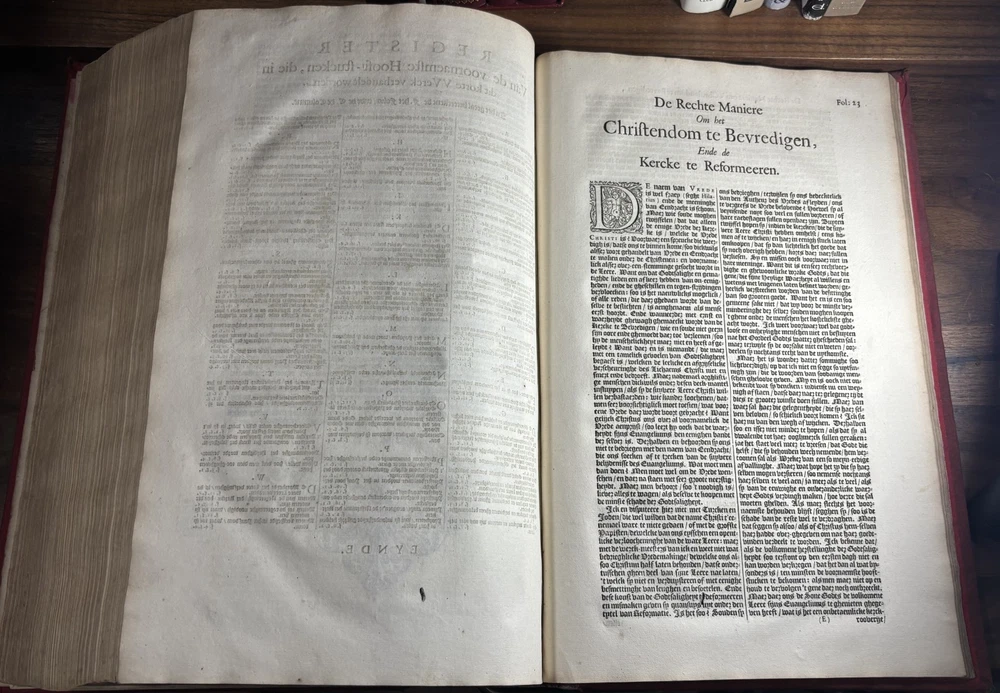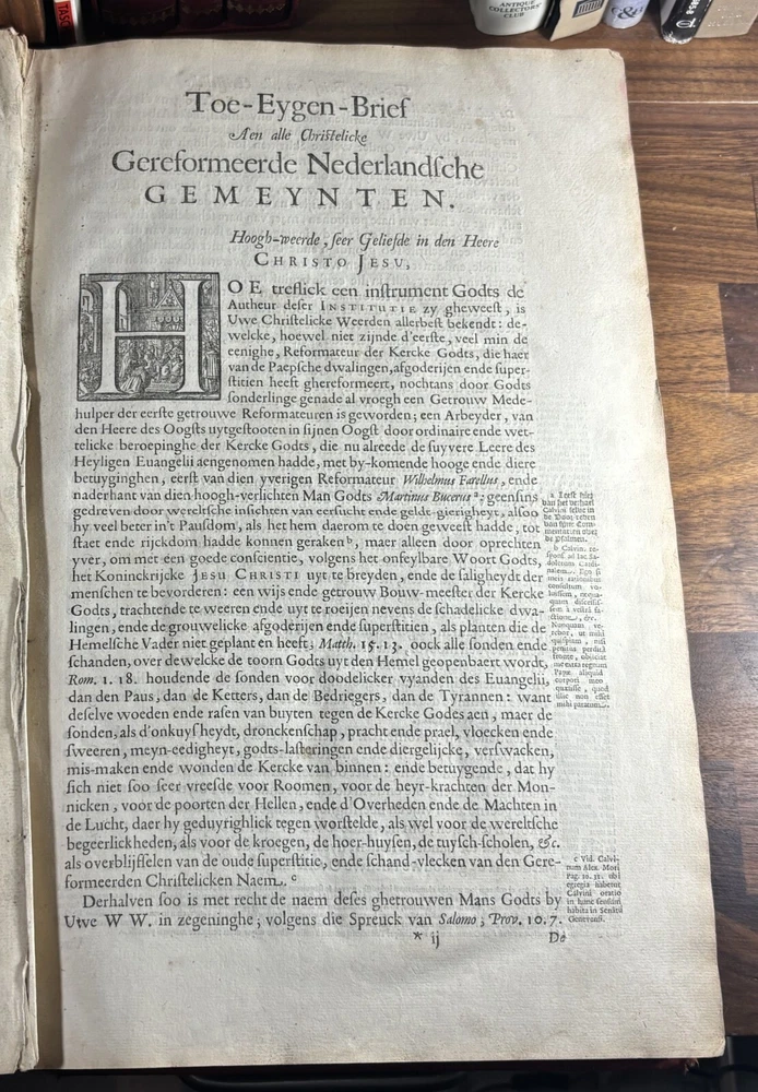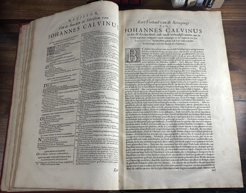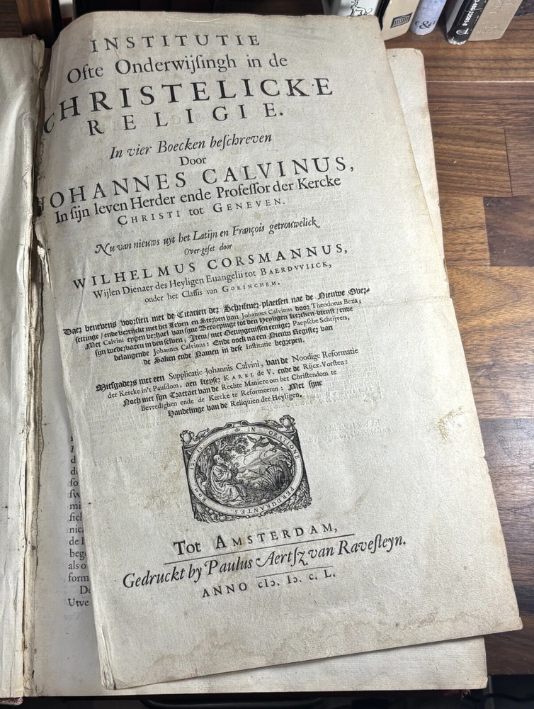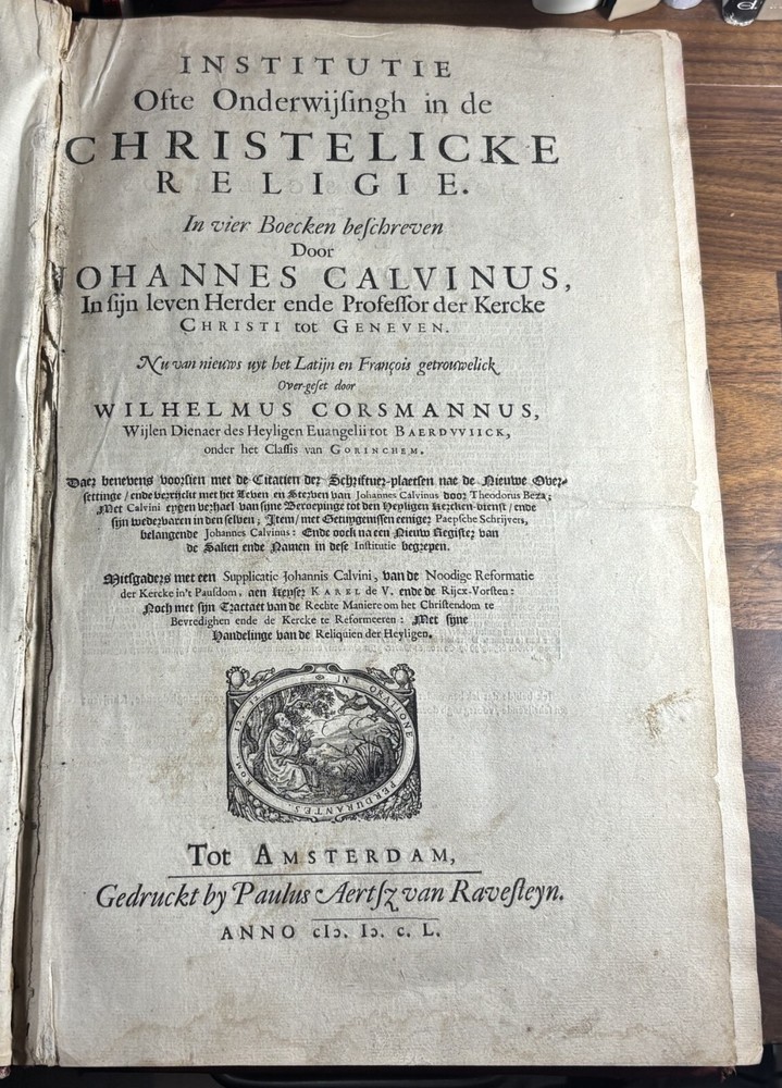 John Calvin's Institutes or Instruction in the Christian Religion, Dated 1650 Overview: Title: Institutie ofte Onderwijsingh in de Christelicke Religie. In vier boecken beschreven door Johannes Calvijn. Nu van nieuws uyt het Latijn en François getrouwelick over-geset door Wilhelmus Corsmannus. Origins and history – John Calvin’s Masterwork: John Calvin (1509–1564), a French theologian and reformer based in Geneva, first published his Institutes in 1536 , originally in Latin. Over the next two decades, Calvin greatly expanded the work—eventually producing a four-book version in 1559 that became the definitive edition. The Institutes provided a clear and systematic defense of Protestant theology. It responded to critics of the Reformation and aimed to educate both laypeople and clergy in Reformed doctrine. Calvin explained topics like the nature of God, the Trinity, the sacraments, justification by faith, Christian liberty, and predestination. Dutch Context – Why This Translation Matters: The Netherlands was a center of Calvinist thought during the Reformation and early modern period. This 1650 edition reflects the continued influence of Calvinism in Dutch society, particularly after the Synod of Dort (1618–1619) , which had established Calvinist orthodoxy in the Dutch Reformed Church. Wilhelmus Corsmannus , the translator, was a Reformed minister in Baardwijk and Gorinchem. He translated the Latin version to make Calvin’s ideas accessible to Dutch-speaking readers. The printer, Paulus Aertsz van Ravesteyn , was an active Amsterdam publisher of theological and scholarly works in the 17th century. The Book’s Role: This translation played a major role in educating Dutch pastors, elders, and students in Reformed theology. It reinforced Calvinism as the official theological standard in the Dutch Republic and helped unify Reformed churches. The book also served as a catechetical and polemical tool —used to contrast Protestant teachings against Catholic doctrine. Dimensions: Weight - 2.16KG Height - 37cm Width - 23.5cm Thickness - 6.5cm Damage: Wearing along the spine Title page is partially off (Please see photos above) Occasional stain Very rare foxing can be found.