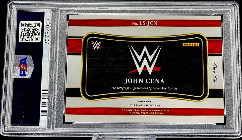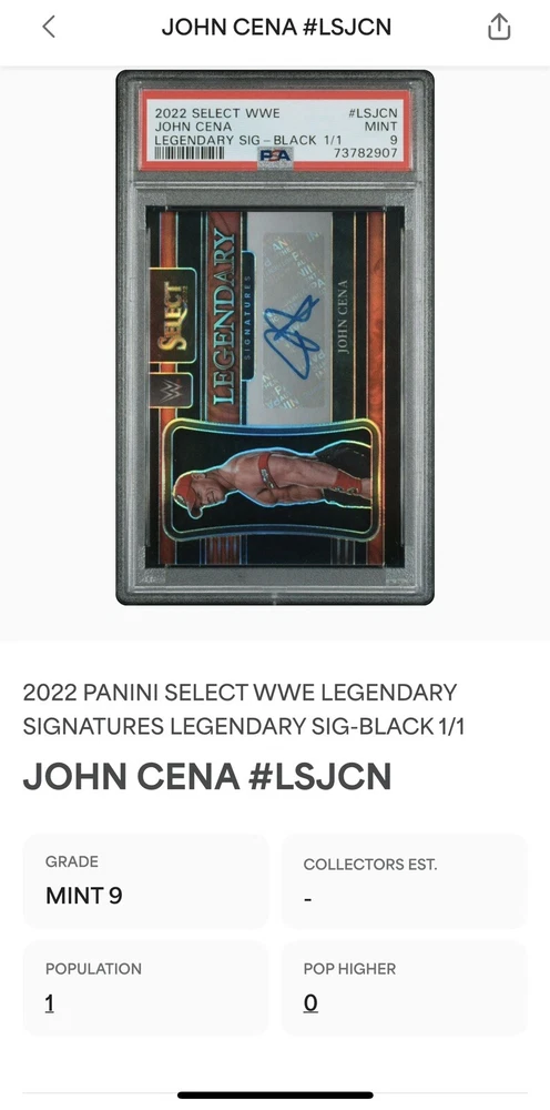 John Cena 2022 Panini Select WWE Legendary Signatures Prizm BLACK 1/1 AUTO PSA 9 One of One. Only copy ever made. SLABS1-lGgrindandgradecards On the 20th anniversary of John WWE debut, Panini released this landmark card featuring the 16-time WWE champion, actor, and philanthropist. In conjunction with his debut in 2002, Cena began work with the Make-A-Wish Foundation, and last July, Cena set a Guinness world record by granting his 650th wish. “I can’t say enough how cool it is to see the kids so happy, and their families so happy. I truly want to show them that it’s their day,” Cena said. “I just drop everything. I don’t care what I'm doing.” Make-A-Wish said no celebrity has received more wish requests than Cena, who also granted the organization’s 1,000th wish in 2012. Considering Cena’s decorated career in the ring, few are surprised by his popularity with Make-A-Wish. From classic matches against Shawn Michaels in 2007 and Randy Orton in 2009 to his battles against The Rock and Brock Lesnar in 2012 to his defeat of AJ Styles in 2017 to eclipse Ric Flair’s championship record, Cena has produced memorable match after memorable match. Away from the ring, Cena recently starred in The Suicide Squad and plays the lead character in the HBO Max spinoff series, Peacemaker. Later this year, he returns to the Fast & Furious franchise in Fast X and will voice a character in the Teenage Mutant Ninja Turtles: Mutant Mayhem film. As a pop culture icon, demand for his cards will likely come from more than only WWE fans. His Prizm Black 1/1 recently sold for $17,100 in a BGS 9.5 . In 2022 Panini captured the WWE’s exclusive licensing rights late in 2021, and Cena’s scarcest cards from the landmark year will go down as some of the most important modern WWE cards in the industry. Get this one-of-a-kind WWE Select Legendary Signatures Cena 1/1 Black Prizm Auto, and with PSA 9 for the only copy ever made, you bidder may consider locking this rare card for one of the greatest wrestlers of all time away in your collection for the next 20 years.