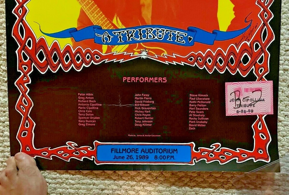 ORIGINAL FROM THE SHOW FIRST PRINTING CONCERT POSTER FROM THE JOHN CIPOLLINA (OF QUICKSILVER MESSENGER SERVICE AND ABOUT 100 OTHER BANDS) TRIBUTE CONCERT HELD AT THE FILLMORE AUDITORIUM ON JUNE 26, 1989 ALSO INCLUDED ORIGINAL GUEST PASS FROM THE SHOW!!!! (PASS IS UNPEELED WITH BACKING INTACT) THE BOTTOM OF POSTER LISTS THE ARRAY OF GUEST MUSICIANS FROM THE GRATEFUL DEAD, QUICKSILVER, JEFFERSON AIRPLANE/STARSHIP, COUNTRY JOE AND THE FISH, AND PRETTY MUCH EVERY BAY AREA MUSICIAN ARTWORK BY ALTON KELLEY (AND HIS WIFE MARGUERITE) POSTER ON HEAVY POSTER STOCK MEASURES 20 X 30 INCHES IN VERY GOOD CONDITION (HAS SOME CREASING FROM ROLLING - NO RIPS TEARS OR HOLES) GUARANTEED AUTHENTIC - ITEM GUARANTEED AS DESCRIBED - (PLEASE SEE MY FEEDBACK PROFILE - MUCHO POSITIVE SATISFACTION RATING !!!) - -BUYER PAYS SHIPPING CHARGES (I use USPS ---- POSTERS COST $ 10.00 )- SHIPPING OCCURS WITHIN TWO DAYS OF YOUR PAYMENT - - PLEASE FEEL FREE TO E-MAIL ME WITH ANY QUESTIONS PRIOR TO BUYING - - - - - BUYER AGREES TO PAY FOR ITEM WITHIN 7 DAYS OF CLOSE OF SALE - PLEASE CHECK MY "ME" PAGE PLEASE SEE MY OTHER AUCTIONS FOR MORE ORIGINAL 1960'S - 90'S ROCK AND ROLL MEMORABILIA............................ THANKS AND STAY IN TOUCH