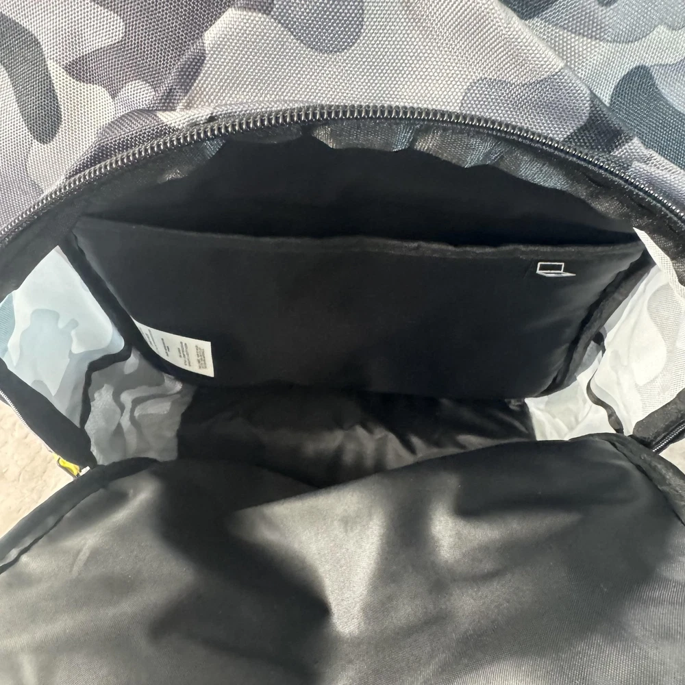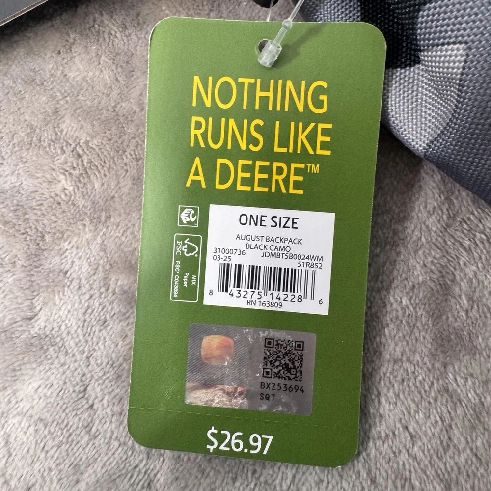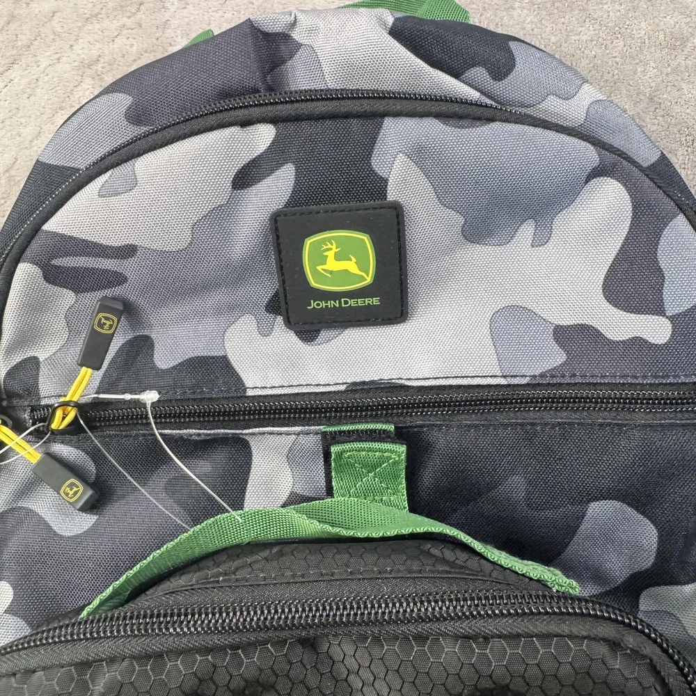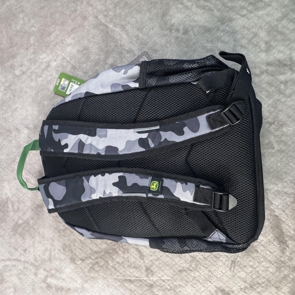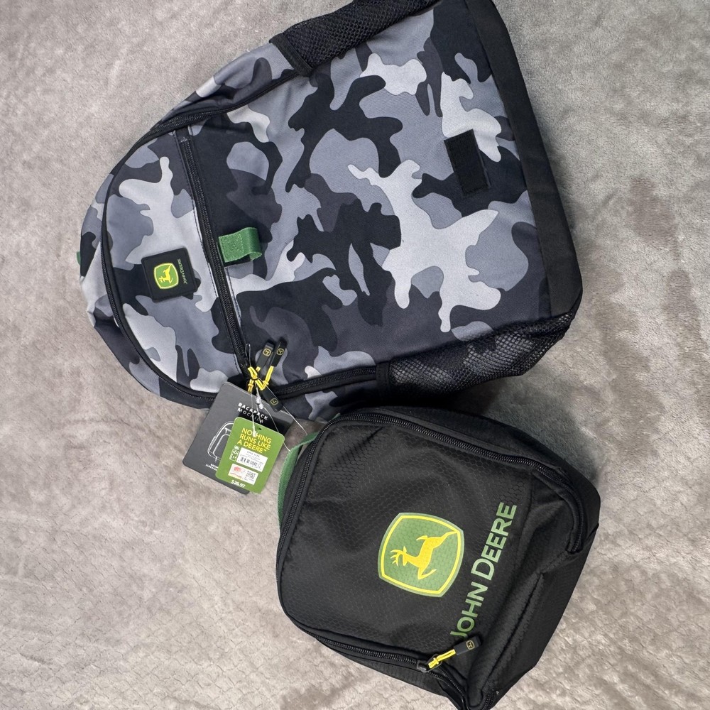 Brand: John Deere Style: August backpack and detachable lunch bag set in a black and gray camo pattern with black front pocket and green/yellow John Deere logo accents. Color: Black camo with green trim and yellow logo details. Size on tag: One Size; capacity 23 L. Materials: 100% polyester shell; label yarn made from 100% recycled polyester materials. Style/Model code: JDMBT5B0024WM; RN 163809. UPC: 843275142286. Details: Adjustable shoulder straps, padded back panel, top carry handle, dual mesh side water bottle pockets, large main compartment with padded media/laptop storage sleeve, front zip pocket, and matching detachable lunch bag that mounts on the front of the backpack. Lunch bag features: Insulated lining to help keep food fresh, front John Deere logo, zip closure, and top handle. Actual Measurements (printed on hang tag): Backpack H17 x W11.75 x D6 inches; lunch bag H9.75 x W8.25 x D3.5 inches.