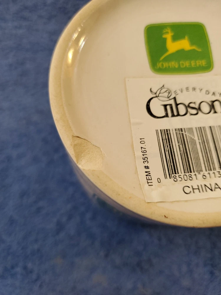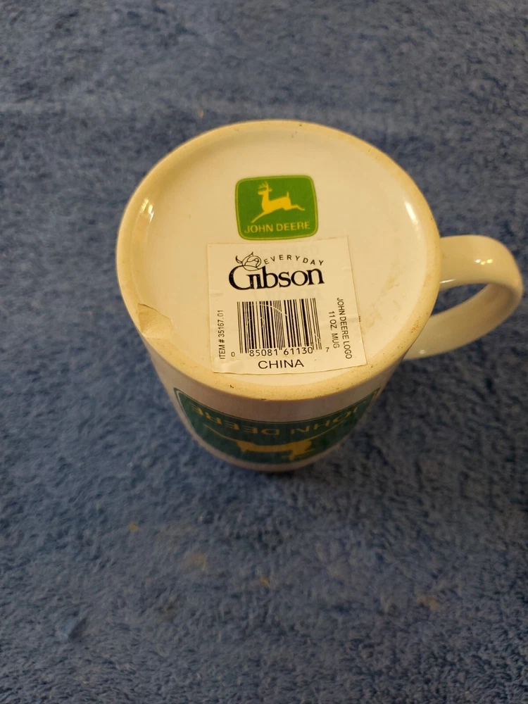 John Deere Licensed Product White Coffee Tea Mug Cup by Gibson Farmers Farm. There is a small chip on the bottom of the mug. Please see pictures. WILL SHIP IN STURDY BOX. WE WILL COMBINE SHIPPING ON MULTIPLE ITEMS IF POSSIBLE. PLEASE CHECK OUT OUR OTHER ITEMS. THANKS FOR LOOKING.