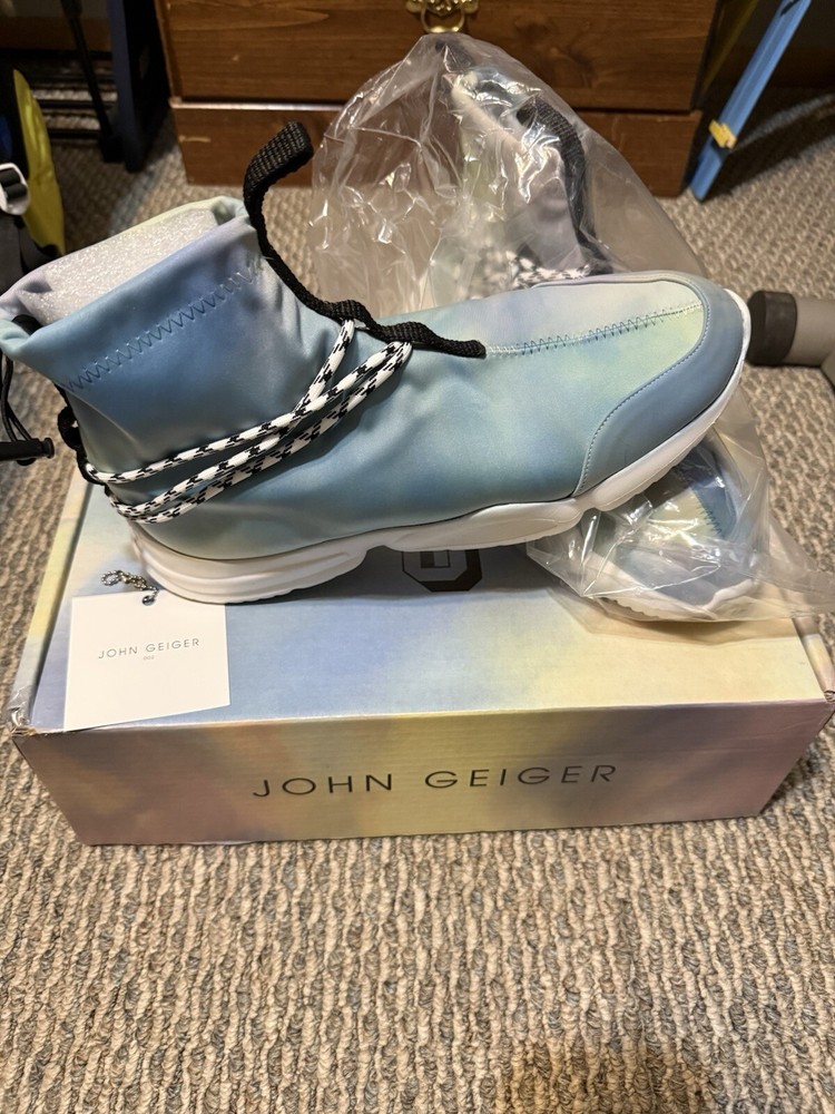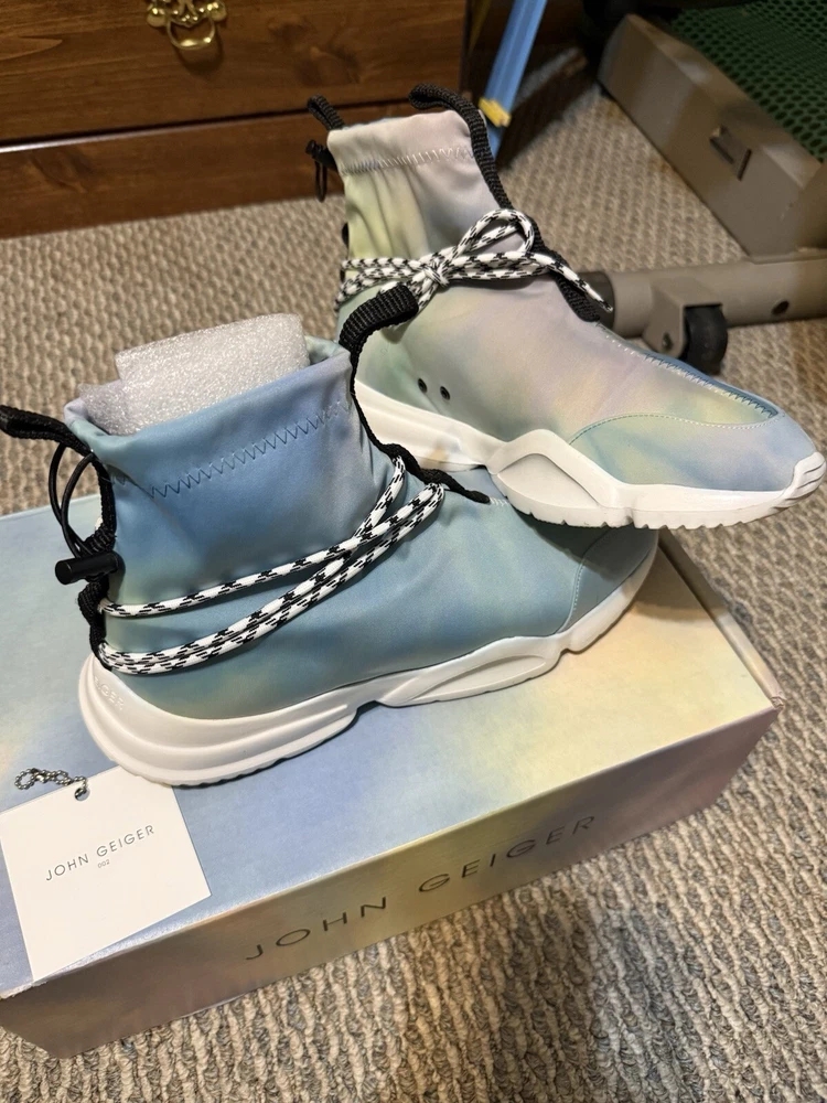 This John Geiger 002 Coachella sneaker in size 11 is a pre-owned athletic shoe for men. In great condition with box. Worn once! It features a unique tie dye design that was individual to each sneaker set when released. Low quantity of this shoe produced! Great material and adds a rare piece to any collector’s closet.