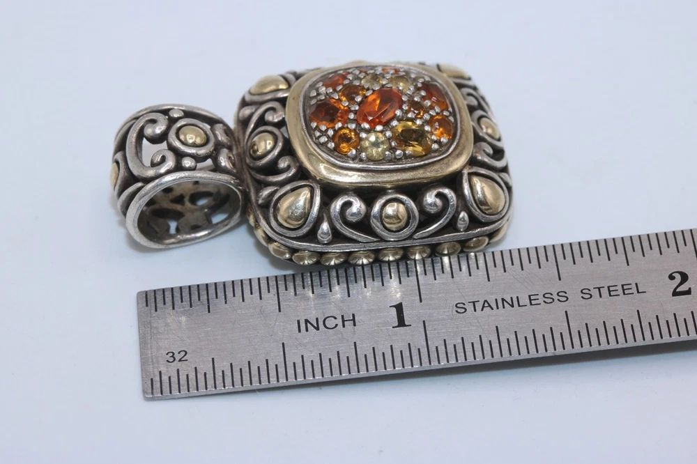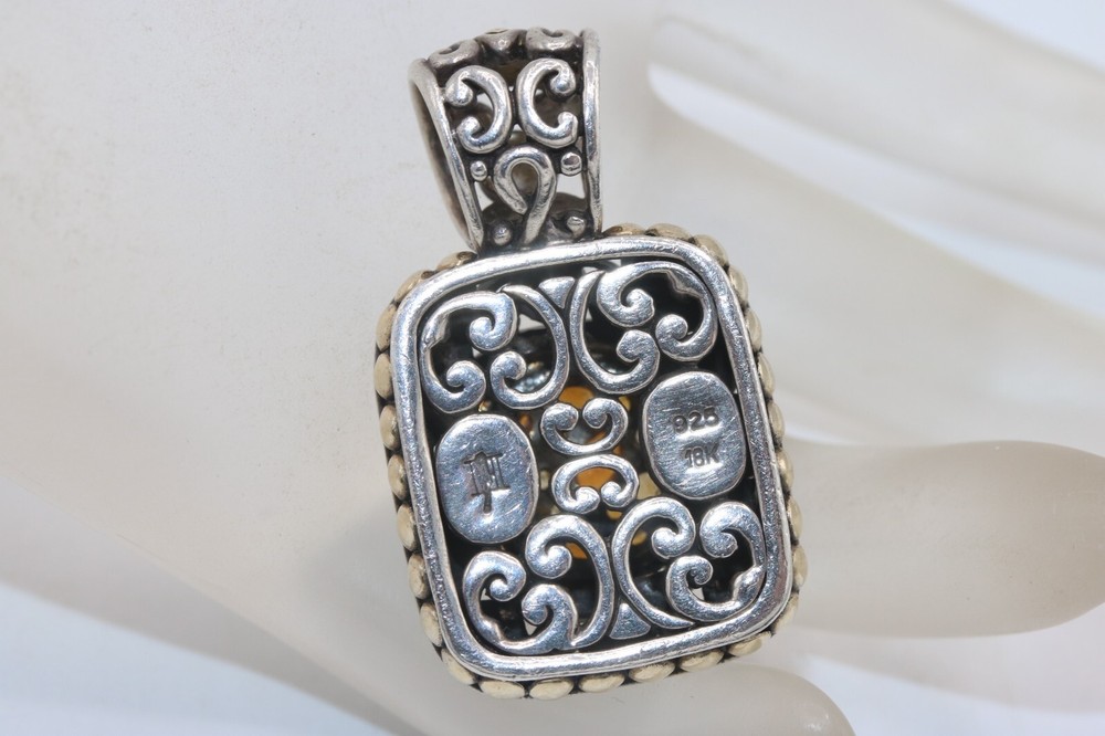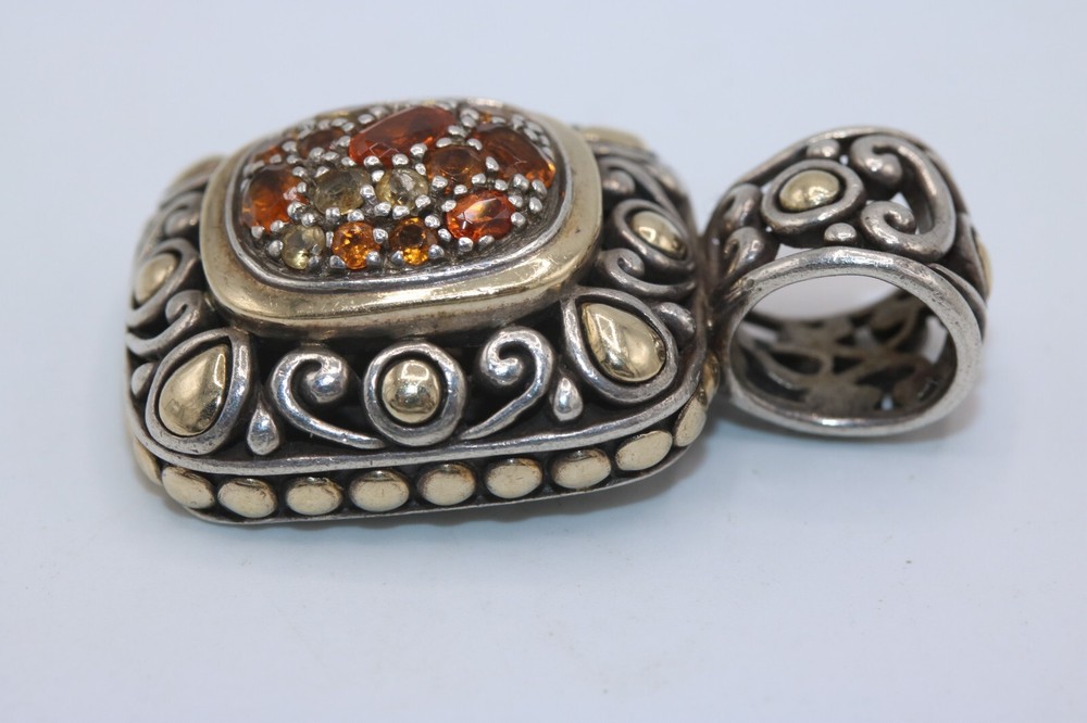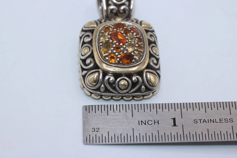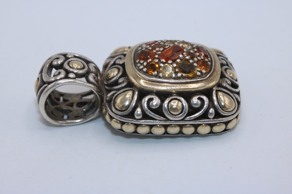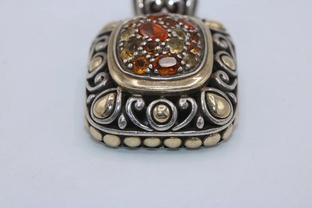 John Hardy 925 Sterling Silver 18K Gold Citrine Cluster Batu Slide Pendant Metal: Sterling Silver / 18K Yellow Gold Weight: 16.4 Grams Stones: Citrine (different shades) Measurement: Pendant is 1.4" long x 0.8" wide. Bale fits up to a 6mm chain. Hallmarks: "JH 925 18K" Should you have any further questions please feel free to e-mail. Thank you!