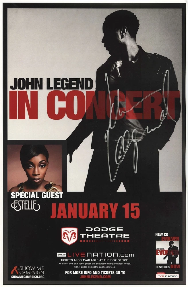 This listing is for an 11 X 17 John Legend limited edition autographed gig Poster that was signed by John Legend. This signed item was obtained at the January 15, 2009 concert by our RNRW staff and would make a great addition to any John Legend music collection., Unfortunately there are many questionable autographed items out there so do your due diligence before purchasing from anyone. We have many other rare John Legend collectible items in the Rock-N-Roll Warehouse so if there is something you are looking for do not hesitate to contact us. You can verify this item by going to the James Spence Authenication website and put in the JSA # R67859 to verify the accuracy of this listing. Rock-N-Roll Warehouse is one of Ebay’s most reputable sellers since 1998. We have one of the largest selections of music memorabilia including vintage band guitar picks, concert backstage passes, concert t-shirts, drum sticks and autographed items. RNRW only deals in official band merchandise and does not sell counterfeit, novelty or bootleg items. We only has a small portion of our overall inventory listed so if there is something you are looking for or have questions about any of our products don't hesitate to send us a message Please view our other eBay listings for more great music memorabilia and rare concert collectibles. Unless noted in the listing description, you are purchasing ONE (1) item only. Added scans may show the front and back of the listed item or additional products that we have in inventory. Rock-N-Roll Warehouse does it's best to describe each and every item correctly. If you feel an item description is not accurate just send us a friendly note and we will look into your concerns. At any time if you are ever unhappy with the quality of any of our items just contact us and we will do our best to rectify all issues with your transaction. Please read all description, payment & shipping info prior to purchasing. TOP $$ PAID FOR VINTAGE COLLECTIONS
