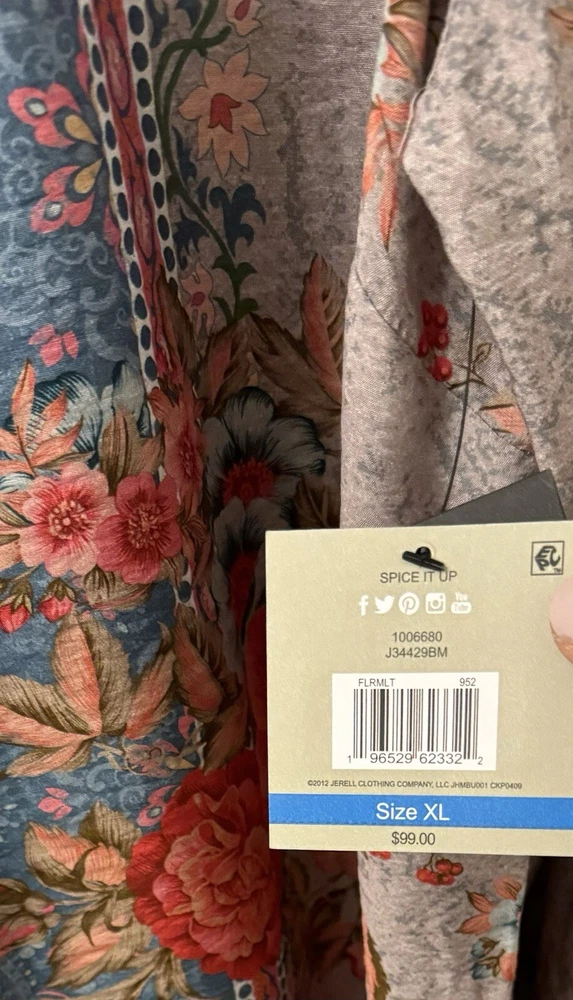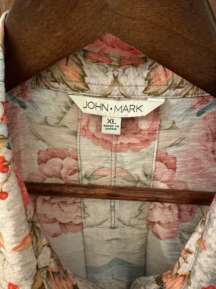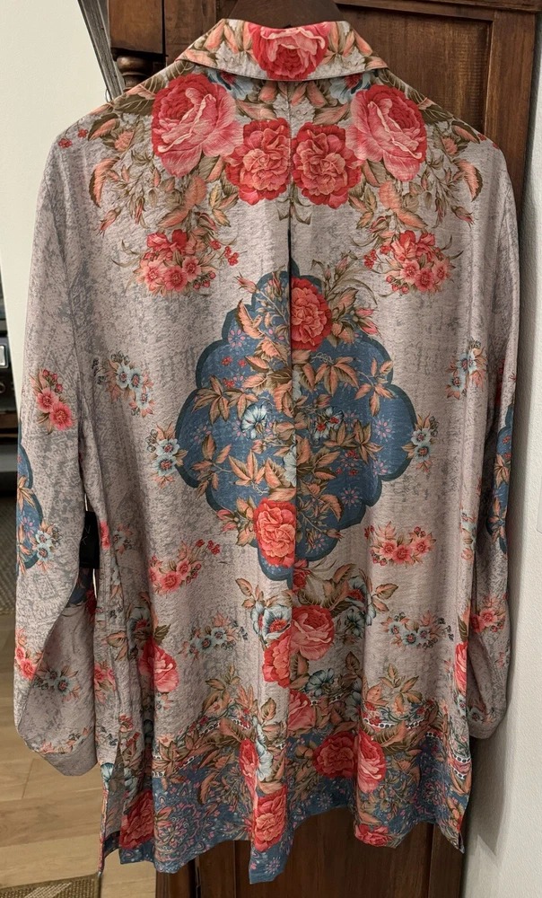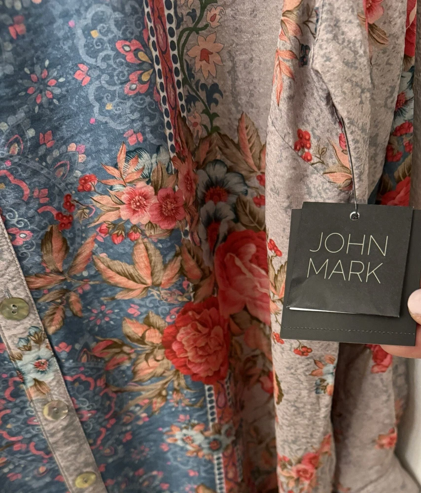 This chic John Mark Women's Floral scarf print with Roll-Tab Long Sleeve Sheer Tunic is versatile allowing for effortless pairing with your favorite jeans or leggings, making it a go-to for laid-back yet stylish look. With its roll-tab sleeves and sheer viscose material, this tunic blends comfort with a touch of elegance. Crafted to fit beautifully in a size small, the tunic features a classic button closure that adds a timeless touch to its contemporary style. From John Mark, this top features: floral scarf print point collar neckline Long roll tab sleeves center front button closure approx. 32-32.5" length rayon/nylon machine wash/tumble dry Measurements: Back Length 32.5 " (from top seam under the collar to bottom of hem); Width: 23" (from armpit to armpit); Sleeve 26" (from shoulder seam to end of cuff) Color: We photograph items as accurately as possible; however, colors may vary depending on your monitor and the lighting.