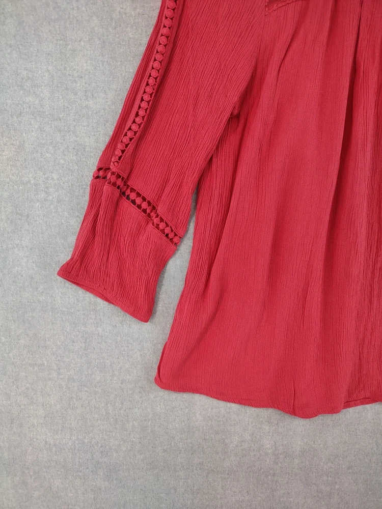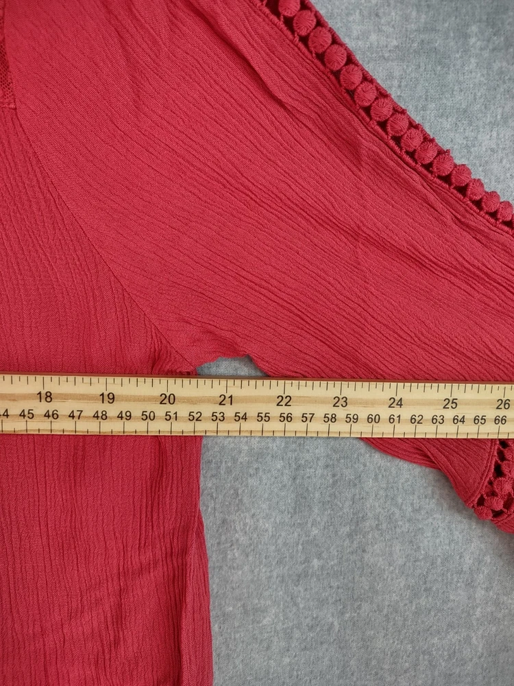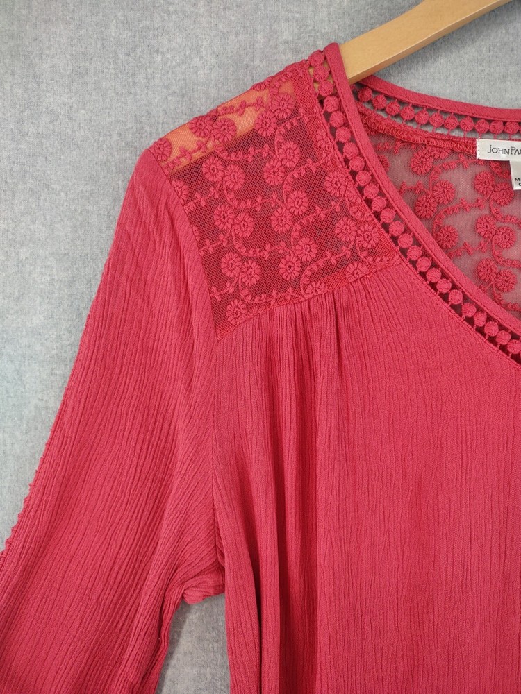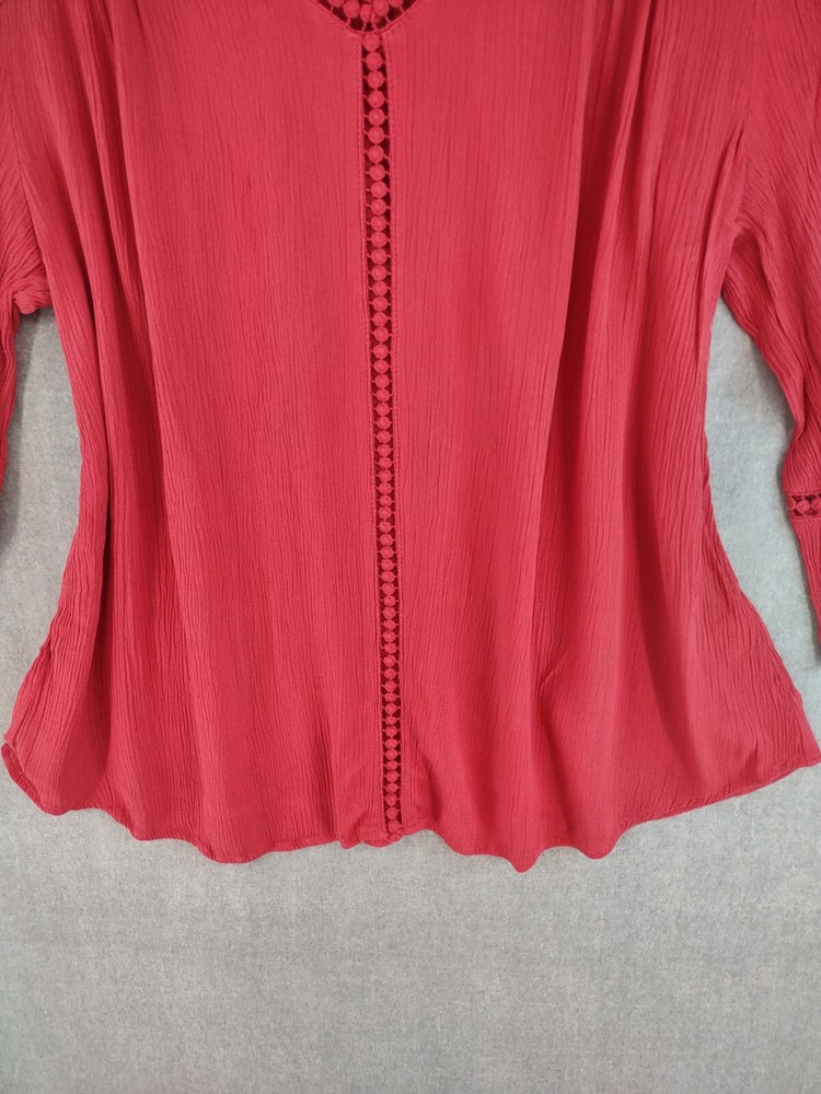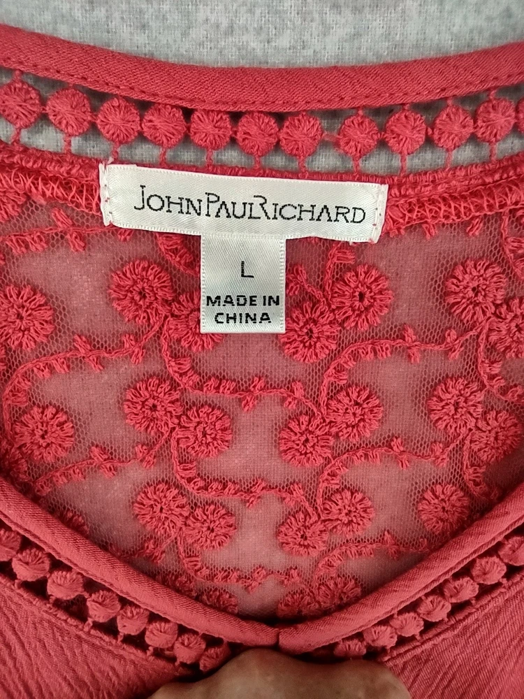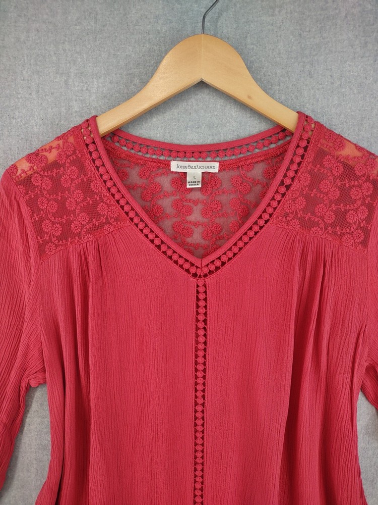 JOHN PAUL RICHARD Crinkle Rayon Crochet V-neck Tunic Top Womens Large Red Bohemian LENGTH: Measured from the top of the shoulder to the hem. WIDTH: Underarm to underarm, measured flat from left to right. SLEEVE LENGTH: Measured from the underarm to the hem. It is always best to compare the measurements above with a top that fits you comfortably. CONDITION - Excellent pre-owned condition. See the photo gallery to view this items measurements and condition. SHIPPED - USPS First Class Mail RETURNS accepted, must be returned within 30 days in original condition to receive a full refund. SHIPPING AND HANDLING We ship all packages within five business days Monday through Friday except Holidays. Consolidated shipping is available for multiple purchases. Thank you for helping our planet and buying previously owned and loved items. I am grateful for your business. Enjoy! Check out our eBay store and follow us. There are new listings daily. CUSTOM SKU: Disclaimer: While we make every effort to capture the most accurate depiction of every item when photographing, colors may vary from screen display to in person therefore we cannot guarantee "exact shade" on any item. Message us if you have questions.
