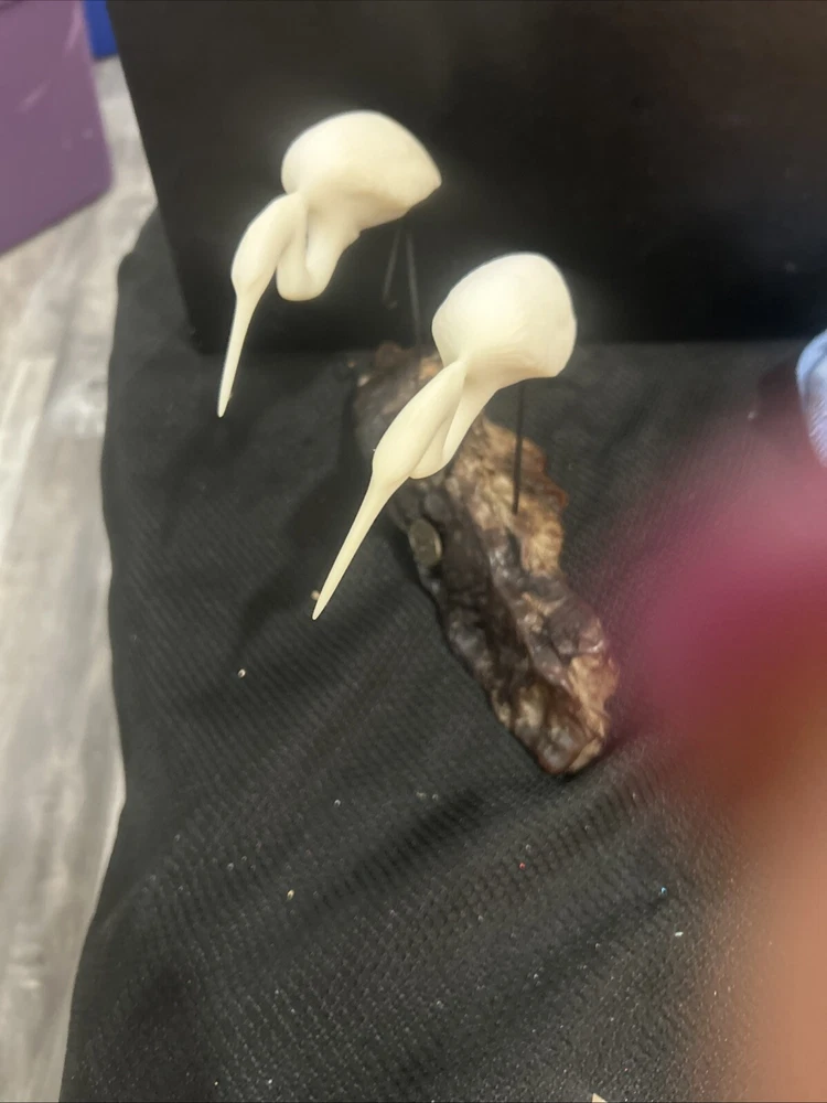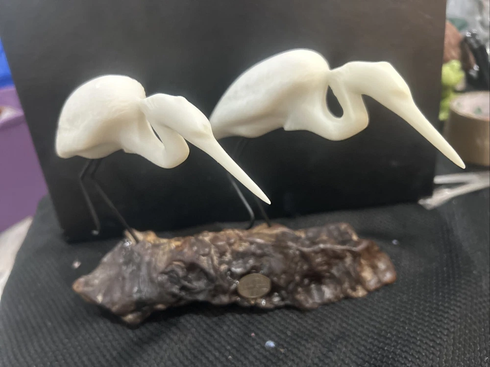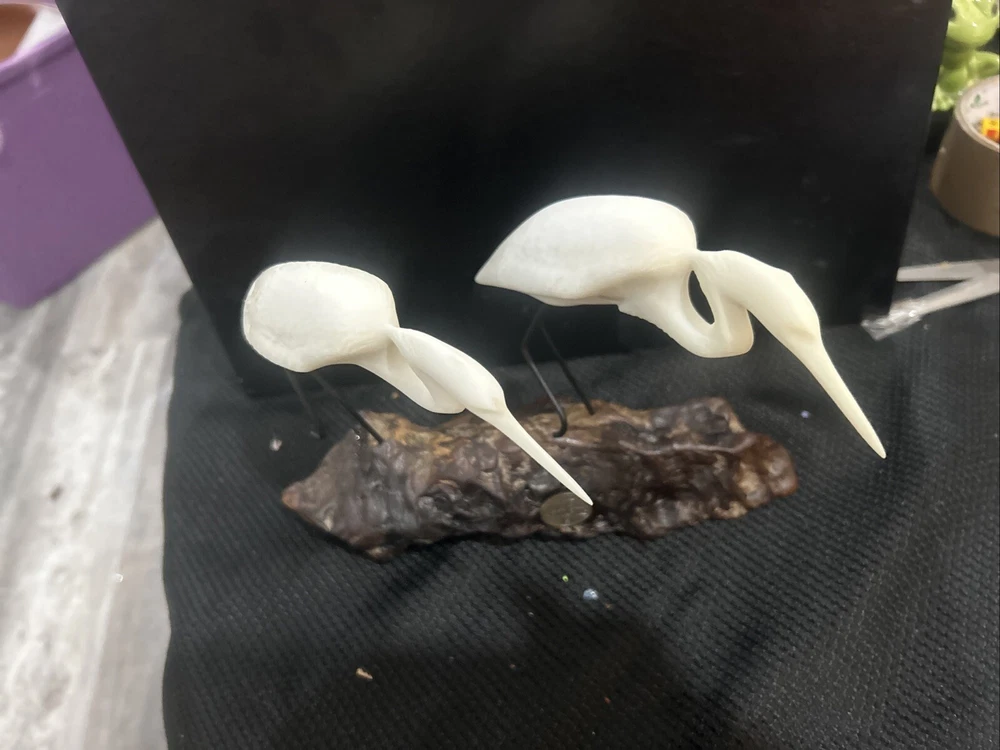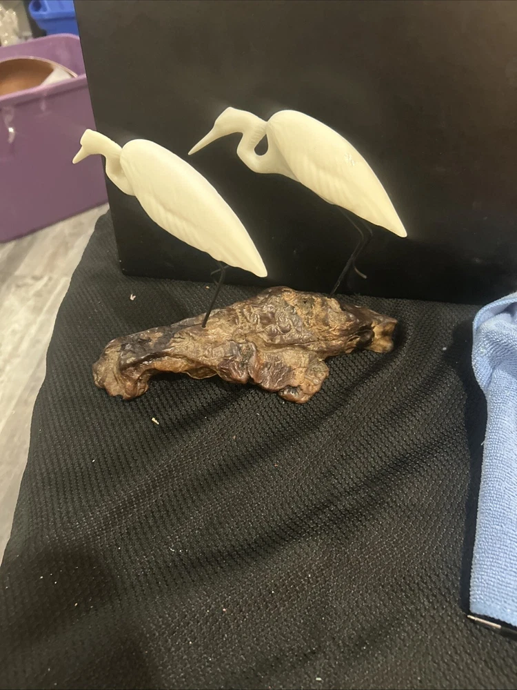 This John Perry sculpture features two white resin pelicans mounted on polished burlwood, measuring 10 inches in length, width, and height. Handmade in the United States, this limited edition piece showcases a realistic carving of pelicans in a nautical theme. Signed by the artist, John Perry, this sculpture combines wood and resin materials in a medium-sized statue format, making it a unique and artistic addition to any collection.