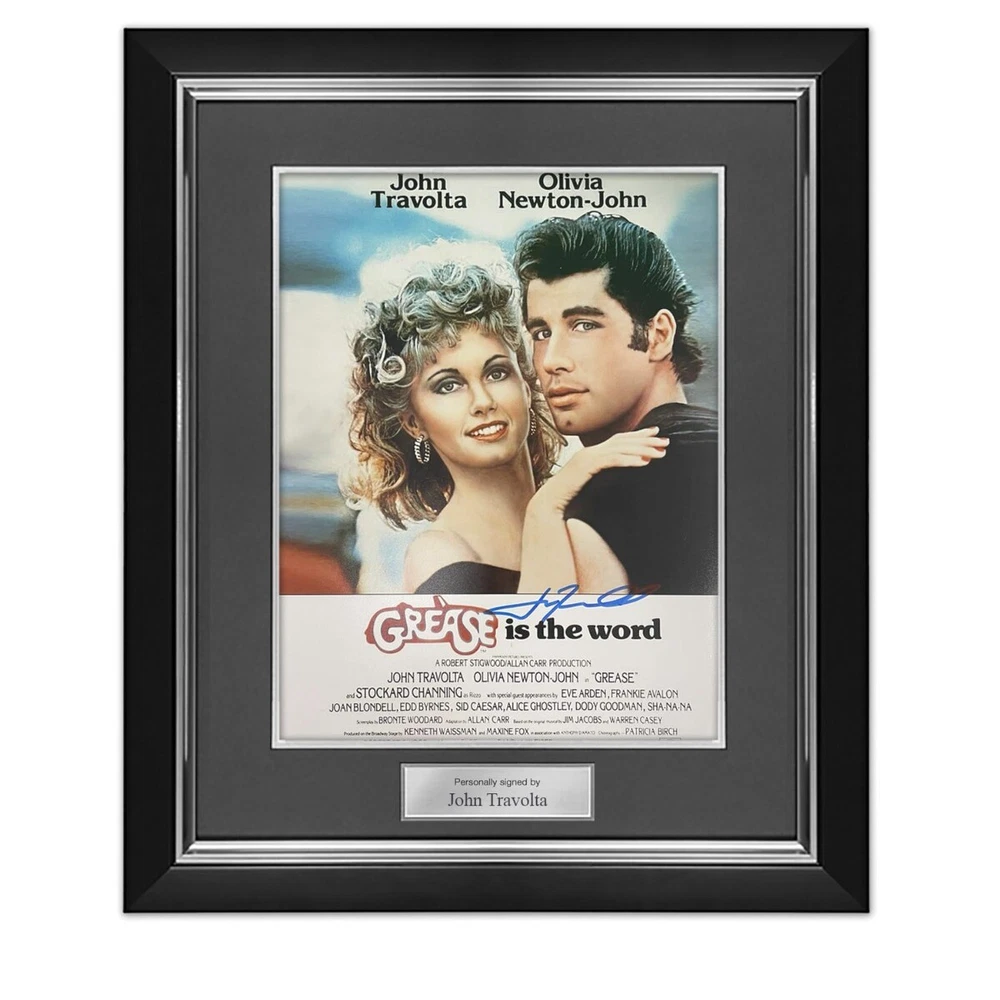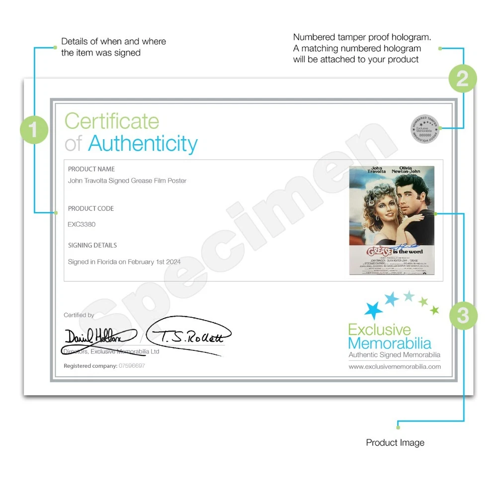 12 x 16 inches poster, signed by John Travolta. In deluxe black frame with silver inlay. Approximate size: 588 x 486 mm / 23 x 19 inches / This film poster was signed by John Travolta on February 1st, 2024 in Florida. Released in 1978, Grease became an immediate box office success and fan favourite. Making more than $394 million worldwide, it remains the fourth highest-grossing live-action musical of all time. Travolta portrayed Danny Zuko alongside Olivia Newton-John, who played Sandy Olsson. John Travolta Signed Grease Film Poster. Deluxe Frame Product code: EXC3380DFS Product details 12 x 16 inches poster, signed by John Travolta. In deluxe black frame with silver inlay. Approximate size: 588 x 486 mm / 23 x 19 inches Overview This film poster was signed by John Travolta on February 1st, 2024 in Florida. Released in 1978, Grease became an immediate box office success and fan favourite. Making more than $394 million worldwide, it remains the fourth highest-grossing live-action musical of all time. Travolta portrayed Danny Zuko alongside Olivia Newton-John, who played Sandy Olsson. Certificate of Authenticity This product is supplied with a Certificate of Authenticity featuring a numbered hologram that matches an identical hologram affixed to your product. This ensures that the certificate can only be used to authenticate the item for which there is a corresponding number. If anyone attempts to remove either hologram it will destruct, so it is impossible to transfer the holograms to other items. Our company number and details are included on the certificate, with details of when and where the product was signed. Please note that the product image displayed here and reproduced on the certificate is a stock photo and not necessarily a picture of the item you will receive. Because all our products are hand signed, the signature and placement on the item you receive might vary slightly. Payment and delivery We send all items by DHL Express with tracked delivery. You will be responsible for any duties payable. Until payment is cleared the item will remain for sale to other buyers on ebay and other channels. Why buy from Exclusive Memorabilia At Exclusive Memorabilia we understand that authenticity is the number one consideration for any customer when shopping with us and that is why we unconditionally guarantee the authenticity of all our signatures. To protect your investment, all our items come with a Certificate of Authenticity, which includes the details of the signing session plus a photo of the player signing one of the product line at the signing session. The certificate guarantees the authenticity of your product. For your peace of mind, our company details are printed on the certificate. Details of Exclusive Memorabilia Ltd are registered with Companies House and our company number is 07596697. The owners and directors of Exclusive Memorabilia Ltd have been working in the signed sports memorabilia industry since 2002. During that time we have arranged dozens of signings with the likes of Pele, Maradona, Leo Messi and Cristiano Ronaldo. We specialise in football memorabilia and boxing memorabilia . This means that the majority of items we stock are from closed signing sessions that a director from Exclusive Memorabilia has attended, and witnessed the items being signed. The remainder are bought from a handful of trustworthy companies with whom we have been dealing for a number of years, and who we know to have the same standards as ourselves. All our signatures come from arranged signing sessions where the player is paid a fee for their services. Many of the older players appreciate the extra funds, while many of the younger players have charitable foundations or favoured charities who are the beneficiaries of the fees. Because we have worked with the players and their agents for many years, they trust us, and often recommend us to each other personally. We never accost players outside training grounds as we don't believe this is the correct way to do business. Furthermore, the quality of a signature from a signing session is usually much better than one grabbed outside a training ground through a car window. We always take a photograph of the sportsman signing one of each product and we reproduce this photo on the Certificate of Authenticity. For logistical reasons it is impossible to photograph every item being signed - no company does this - but showing that the sportsman was present and signing items is, we believe, the best way to demonstrate the legitimacy of your products. Occasionally we buy items from other traders, who have not taken signing pictures, in which case there will be no signing picture on this page and none included on the certificate. Should you have any questions then please don't hesitate to contact us. ► Watch footage from our signings [isdntekvideo] Ebay Shopfront Add to favourite sellers Subscribe to ebay newsletter to hear about special offers and discounts Signed Football Memorabilia Signed Football Shirts Signed Football Photos Signed Football Boots Signed Arsenal Signed Barcelona Signed Chelsea Signed Celtic Signed England Signed Everton Signed Liverpool Signed Manchester United Signed Newcastle United Signed QPR Signed Rangers Signed Real Madrid Signed Tottenham Hotspur Signed West Ham United Signed Boxing Memorabilia Signed Cricket Memorabilia Signed Darts Memorabilia Signed Formula 1 Memorabilia Signed Horse Racing Memorabilia Signed Rugby Memorabilia Other Signed Sport Memorabilia