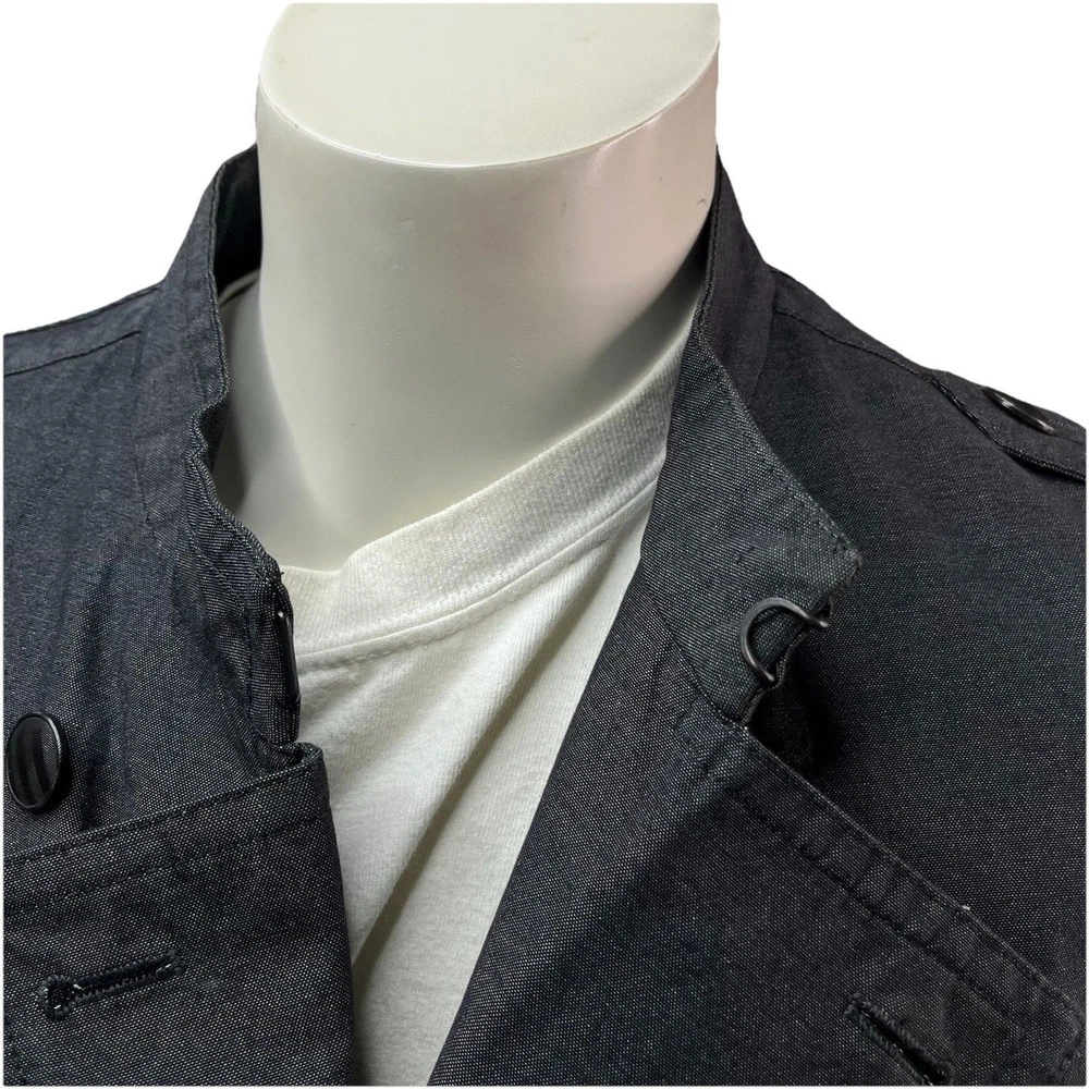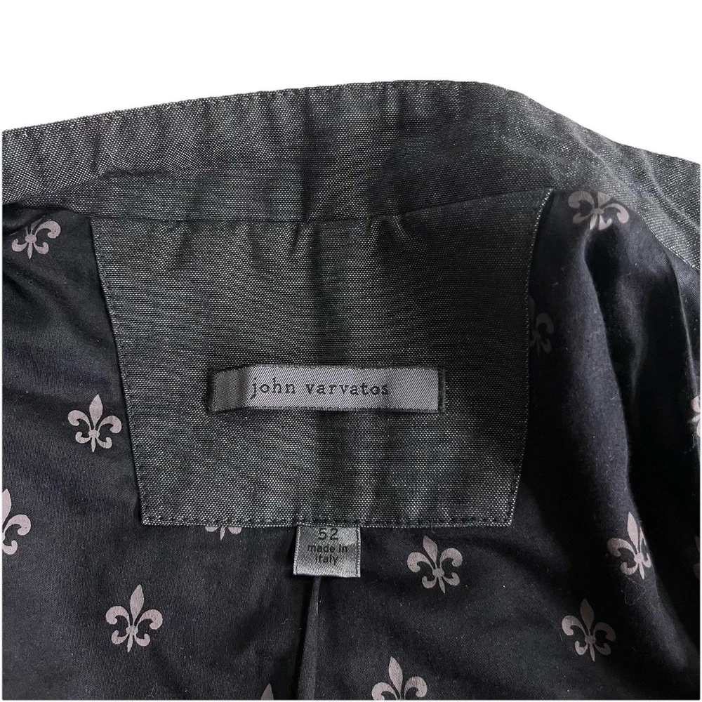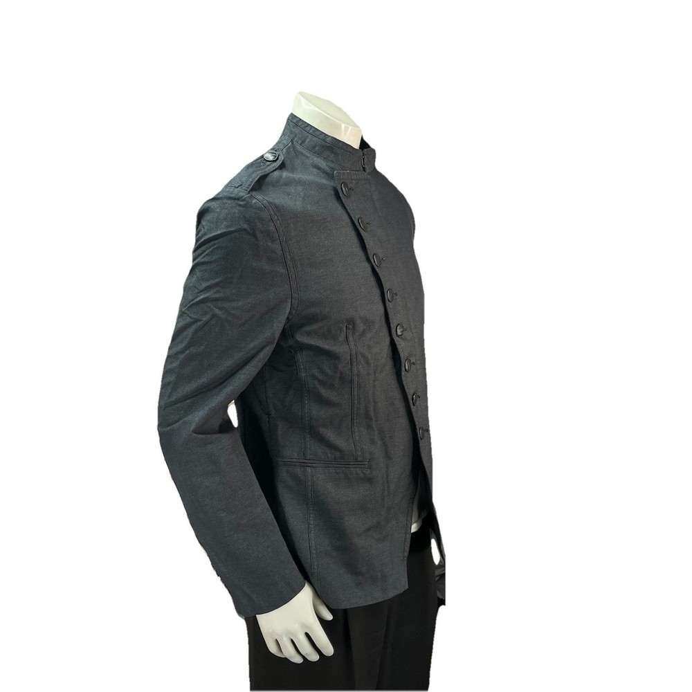 The John Varvatos Men's Asymmetrical Military Jacket in size 42 is a stylish and versatile piece perfect for a casual occasion. Made with a solid cotton outer shell in a sleek gray color, this jacket features a button closure, stand-up collar, and a military-inspired design. Crafted in Italy, this jacket showcases a unique half-lined fler de lis pattern and embodies themes of USA, biker, and motorcycle culture. Ideal for the modern man looking for a regular fit with a touch of edgy style, this jacket from John Varvatos is a standout addition to any wardrobe.