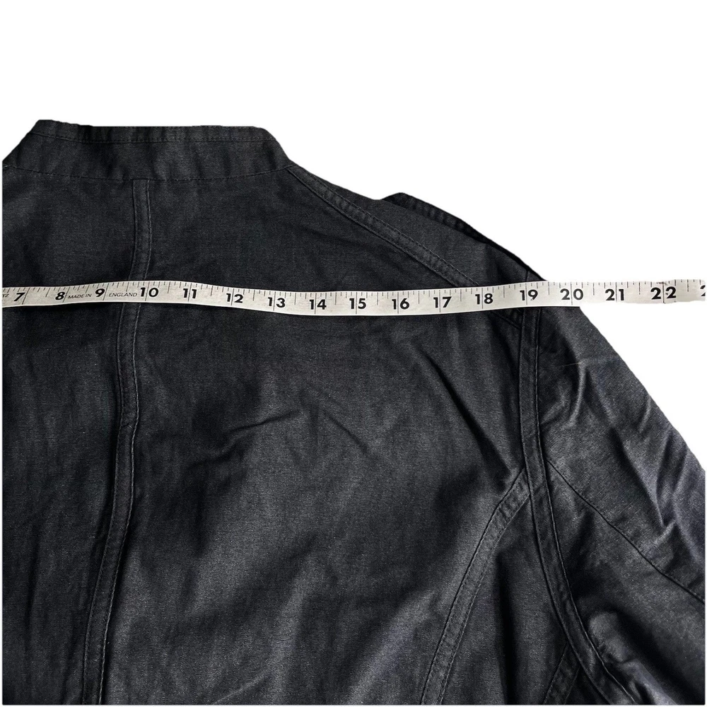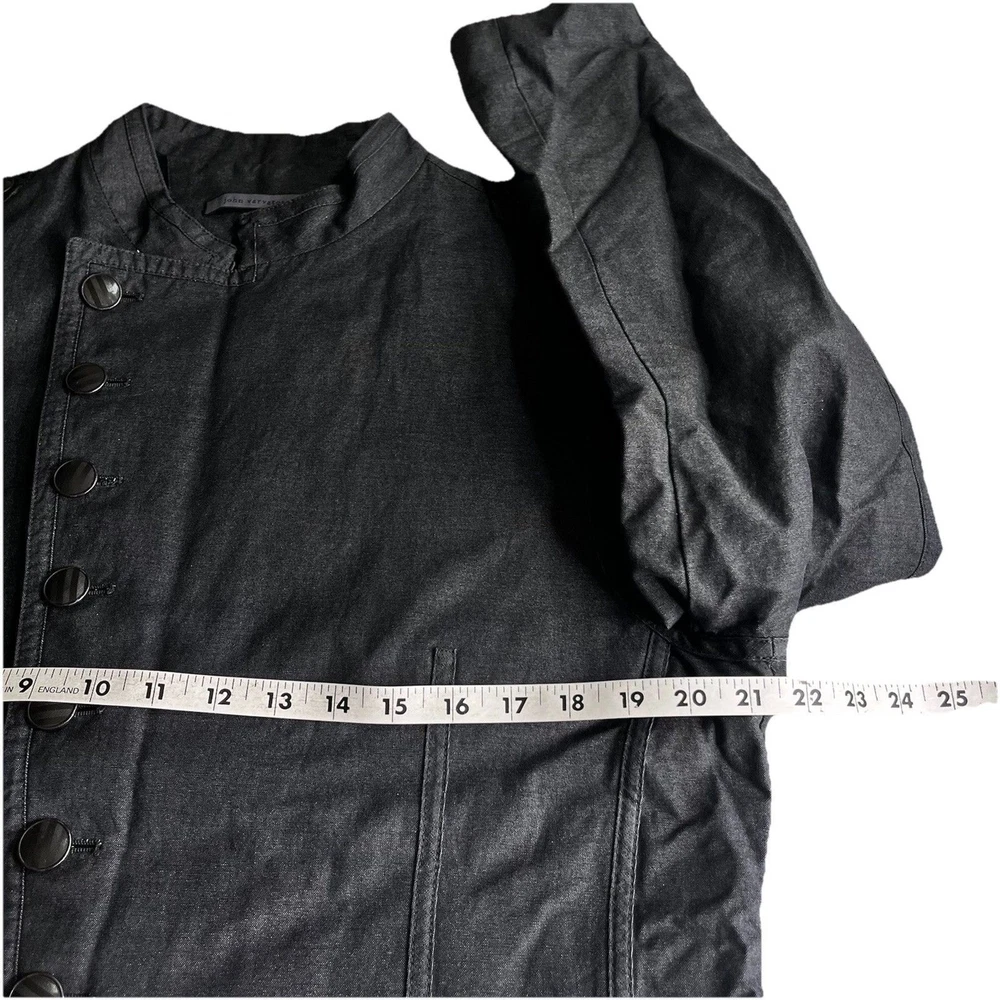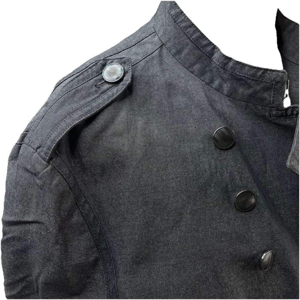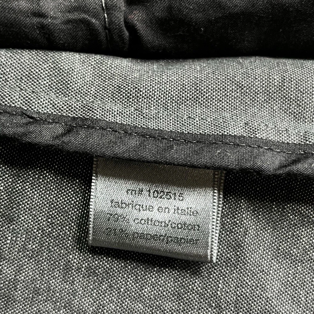 The John Varvatos Men's Asymmetrical Military Jacket in size 42 is a stylish and versatile piece perfect for a casual occasion. Made with a solid cotton outer shell in a sleek gray color, this jacket features a button closure, stand-up collar, and a military-inspired design. Crafted in Italy, this jacket showcases a unique half-lined fler de lis pattern and embodies themes of USA, biker, and motorcycle culture. Ideal for the modern man looking for a regular fit with a touch of edgy style, this jacket from John Varvatos is a standout addition to any wardrobe.