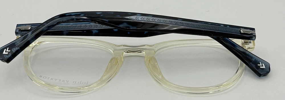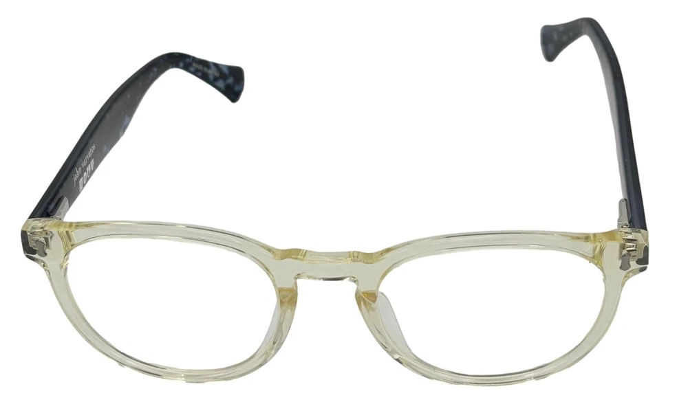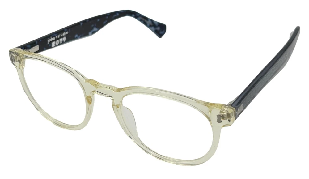 John Varvatos Eyeglasses Square Mens Yellow Crystal Plastic Eyewear Frame V416. 49mm Molded Plastic Nose Pads, Thin Plastic Blue Temple Detail, Size: 49. 21. 145, Height: 42mm ,Made in Japan, John Varvatos finish blue plastic temples, Ships with a John Varvatos Eyewear Case and Cleaning Cloth Spring Temples JV Finished Temple Tips Ships with a John Varvatos Eyewear Case Regular Retail: $425.00 You Pay $99.99 The only one or two we have or will get You can take this to your doctor and have you prescription put in and save a ton on money You Pay Only $99.99 Now