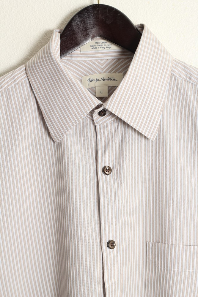 The John W. Nordstrom Men's Dress Shirt in size Large features a classic collared neckline and button closure, perfect for both casual and business occasions. Made of 100% cotton, this shirt comes in a stylish blue, white, and brown striped pattern, adding a colorful touch to any outfit. With long sleeves and a regular fit, this shirt is machine washable for easy care and maintenance. The barrel cuff style and John W. Nordstrom branding further enhance the timeless appeal of this dress shirt.