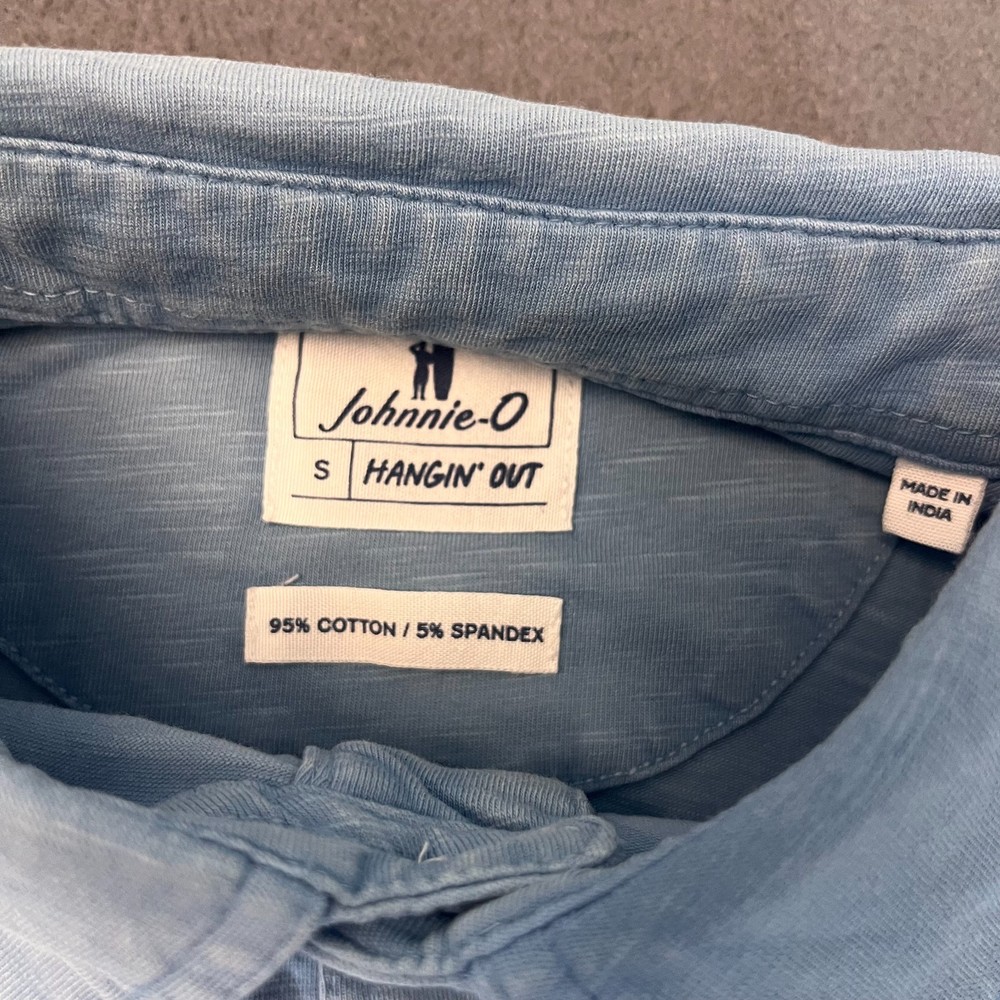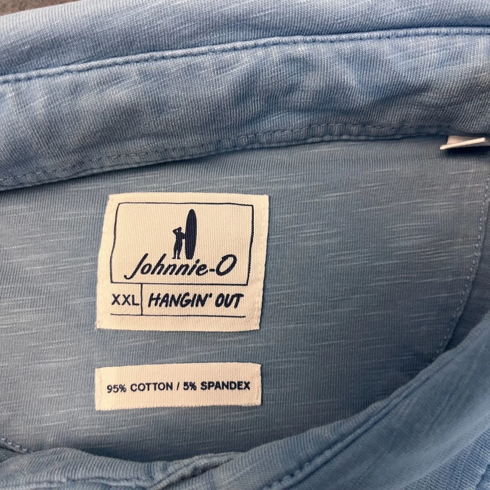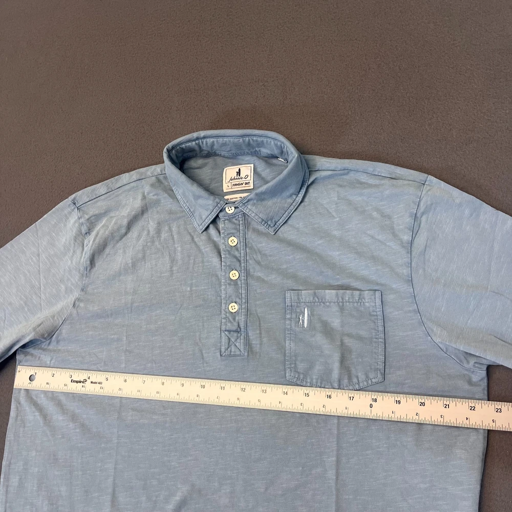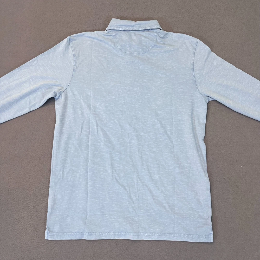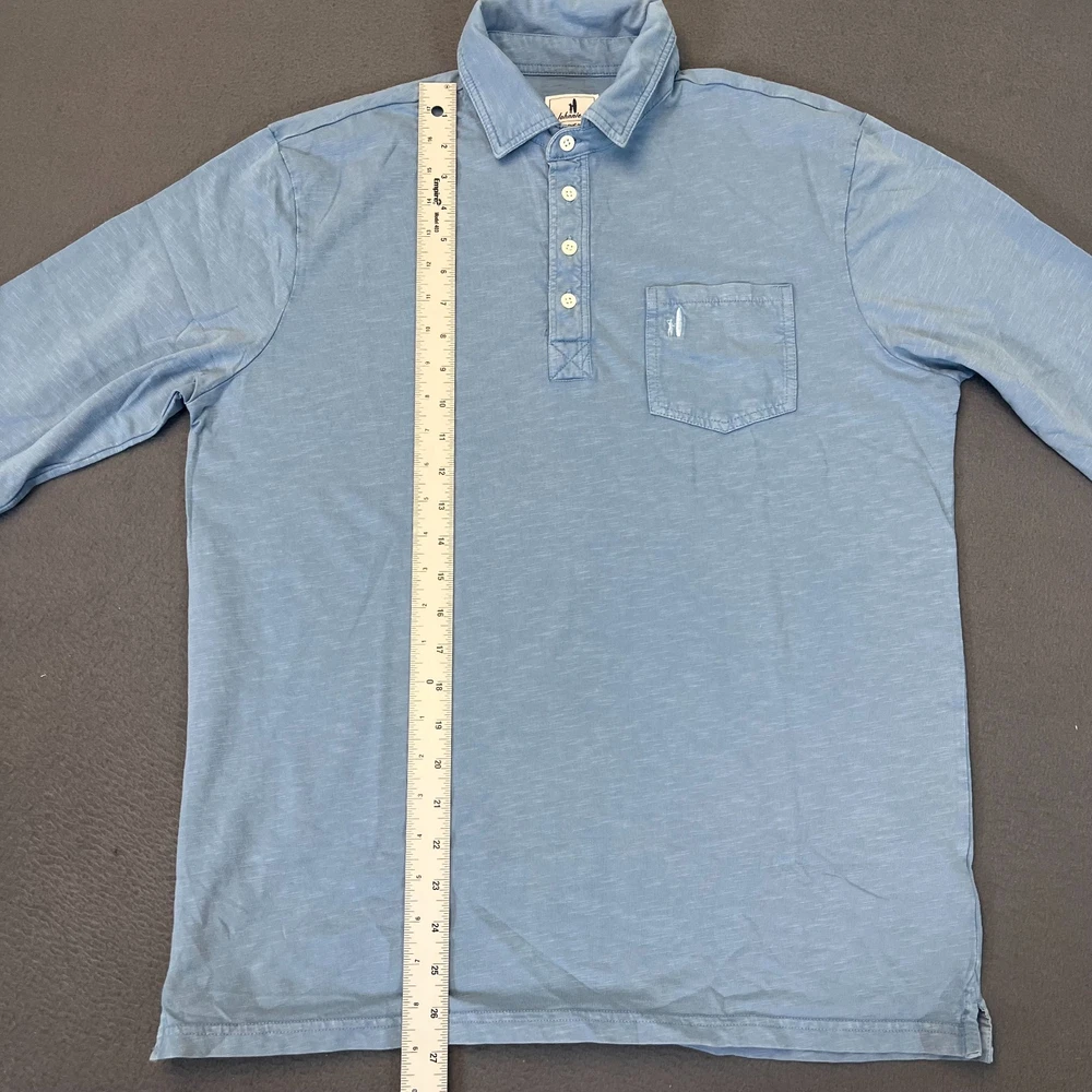 Measurements are approximate S - Chest 38 in, Front Length 27 in M - Chest 42 in, Front Length 27 in L - Chest 44 in, Front Length 28 in XL - Chest 46 in, Front Length 29 in XXL - Chest 50 in, Front Length 39 in The Johnnie-O Hanging Out Polo Shirt is a stylish and versatile addition to any man's wardrobe. Made from a comfortable blend of spandex and cotton, this Maliblu blue Malibu long sleeve polo features a classic collared neckline and logo accents. Perfect for various activities such as walking, beach outings, or even golf, this lightweight and stretchy shirt is machine washable for easy care. With a nature-themed design and a hint of California coastal style, this polo is suitable for all seasons and can be dressed up or down for any occasion.