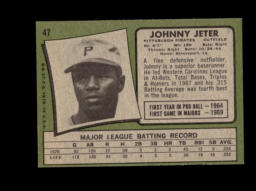 Excellent Pittsburgh Pirates Johnny Jeter #47 Topps 1971 sports Baseball Most days I put cards up all day long. I have a very large inventory concentrating mainly on the 70s With plans to fill in the gaps throughout the 50s and 60s as well. If you type the team name on my site you will pull up every card in that team same way with the year I have almost every card through the 70s up all the time. Good luck and enjoy the store