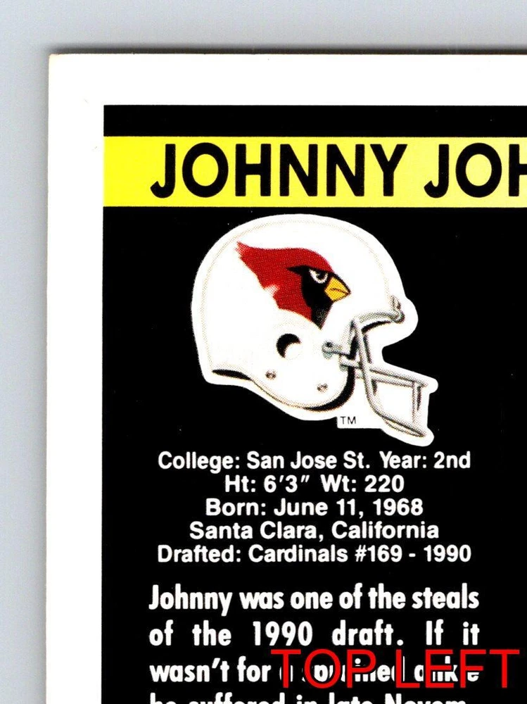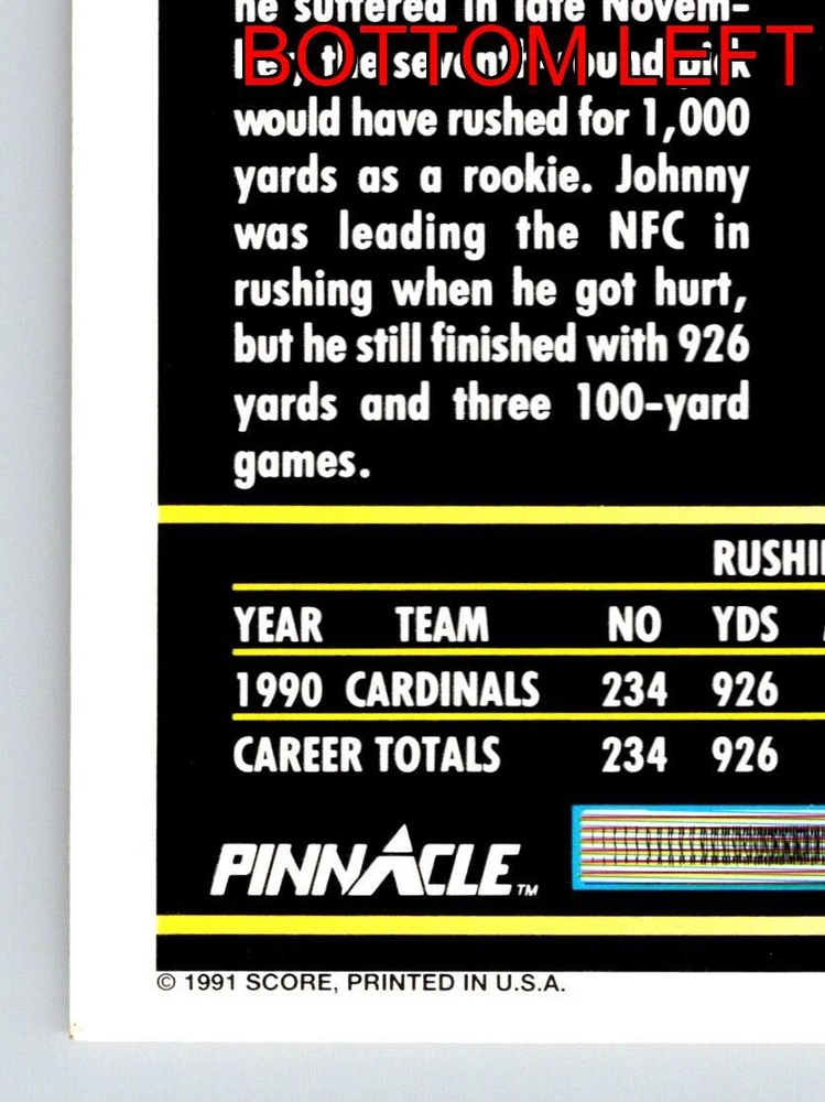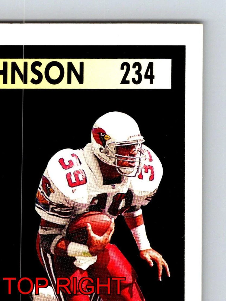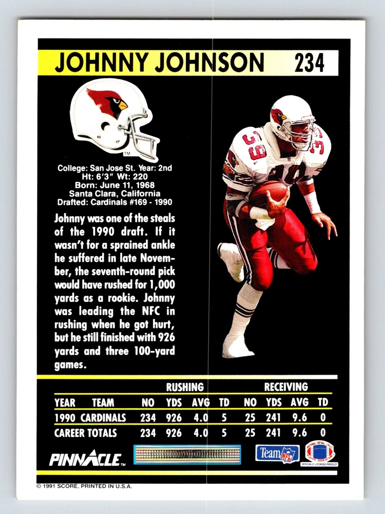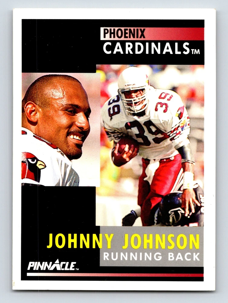 Item Description Title: Johnny Johnson Running Back Phoenix Cardinals Pinnacle 1991 Card 234 Sports Memo Description: This sports trading card highlights Johnny Johnson; a remarkable running back for the Phoenix Cardinals. It is part of the 1991 Pinnacle set; celebrated for its detailed design and premium card quality. Showcasing Johnson in dynamic action poses; this card emphasizes his physicality and dedication in the field. The front features Johnny's charismatic presence and determination as he navigates the game with skill. The reverse side provides insightful statistics; emphasizing his impressive performance during his rookie year; despite a late-season ankle injury. Johnny's stats highlight his ability to achieve 926 rushing yards and 241 receiving yards; marking him as a standout from the 1990 draft. Born on June 11; 1968; in Santa Clara; California; Johnson has proven to be an asset for the Cardinals; making this card a valuable collectible for fans and sports enthusiasts. MRSP: $4.99 Sport: Football Player/Athlete: Johnny Johnson Season: 1991 Manufacturer: Pinnacle Parallel/Variety: Unknown Set: Pinnacle Football 1991 Team: Phoenix Cardinals League: National Football League (NFL) Card Number: 234 Counter: 69 Folder: FOOTBALL1224A02