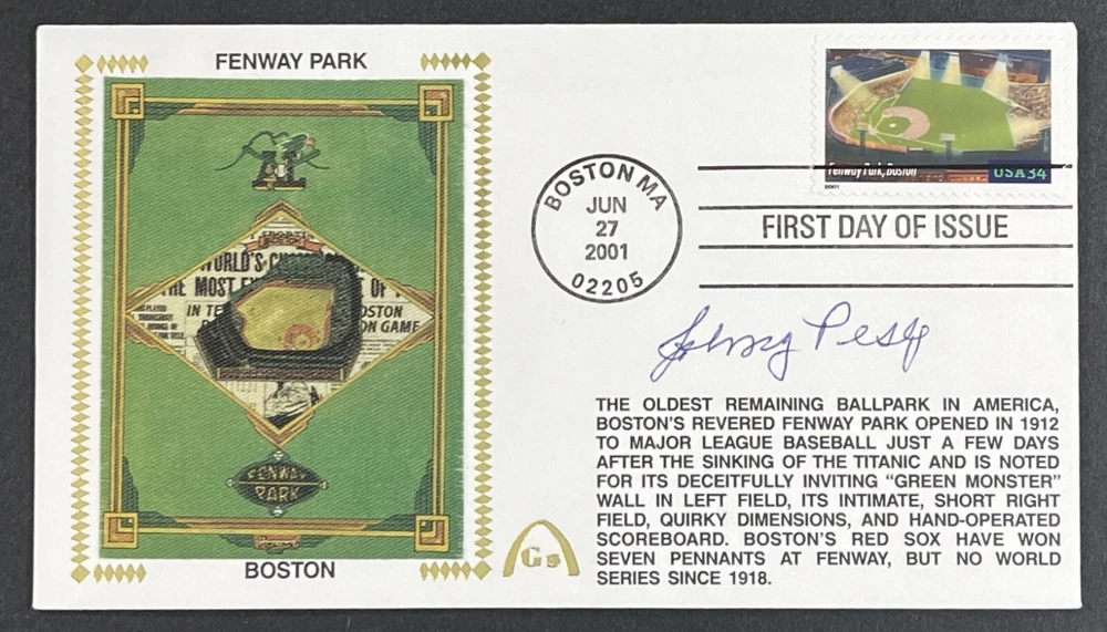 Items in the 8:00 pm Eastern group are (subjectively) in better condition. 8:05pm EDT are the second tier, and 8:10 and 8:15 will have more noticeable imperfections. ------------------------------------------------------------------ Player(s): Johnny Pesky Event: Fenway Park USPS Stamp – Legendary Playing Fields – First Day Of Issue – First Day Cover Postmark: June 27, 2001 in Boston, MA Bio: Boston Red Sox, Detroit Tigers & Washington Senators You are bidding on a Gateway Stamp Cachet that has been personally autographed by Johnny Pesky. This limited edition, collectable & philatelic envelope cannot be reproduced beyond the original inventory of postmarks. ---------------------------------------------------------------------- The condition of items in this store can vary greatly. Please double-check the provided images for imperfections before placing substantial bids. Only less-common blemishes or those difficult to see in the photos may be noted in the “Item specifics” section. Please double check all images provided to ensure you are comfortable with the product. Questions are always welcome! SHIPPING: Includes bubble protected envelope, hand-cut styro-board protection, and plastic top-loader for even more protection. Standard Shipping & Handling is $3.99 to the United States. Combined shipping for multiple items at no charge. All scheduled auctions in this store end on Sunday evenings. Each 5-minute interval will contain several auctions (usually 6-12 items). Mistakes in auction scheduling do occur from time to time, but the expected scheduling of items will be from 8:00 until 8:10 PM (Eastern Time). Note: Many of the items that we offer on eBay have a starting price of around 90% OFF the retail price.