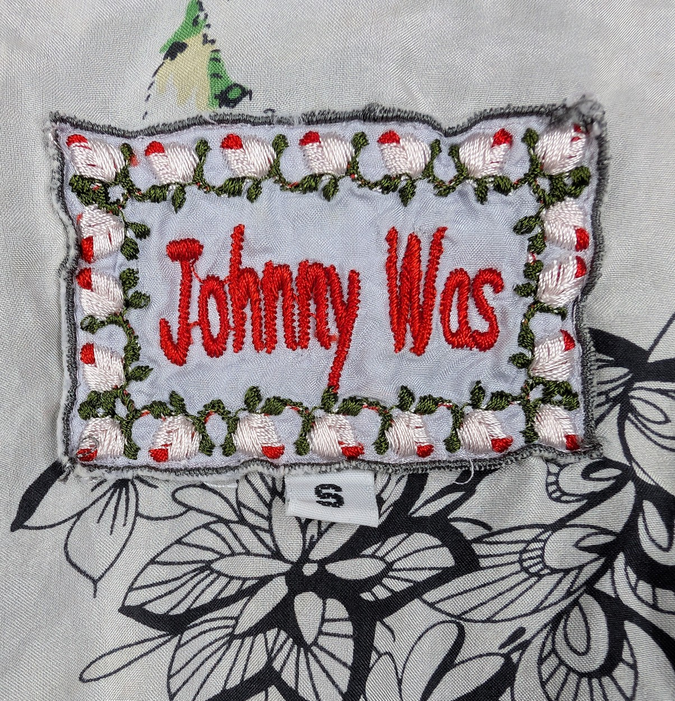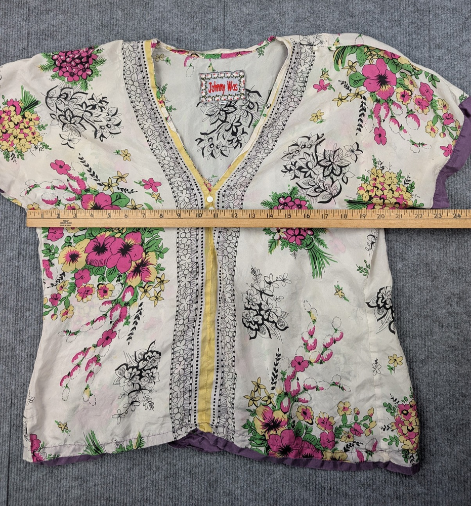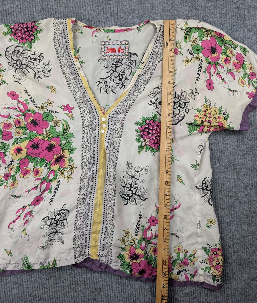 The Johnny Was Blouse is a women's small silk lightweight top featuring a coastal floral design. It has a relaxed fit with a V-neckline, short sleeves, and a pullover closure. The ivory color and woven fabric make it a stylish and versatile option for casual occasions during the summer and spring seasons. The brand, Johnny Was, is known for its artsy and unique designs, making this blouse a fashionable choice for those looking for a blend of coastal and bohemian style in their wardrobe.