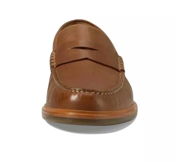 This is a Johnston & Murphy Lyles men's penny loafer in tan full grain Venetian moc style. It features a solid pattern, round toe shape, and slip-on closure. The shoe is made with leather upper, lining, and insole materials, and has a rubber outsole. The shoe width is M and the size is 9. This is a dress shoe that is suitable for formal occasions.