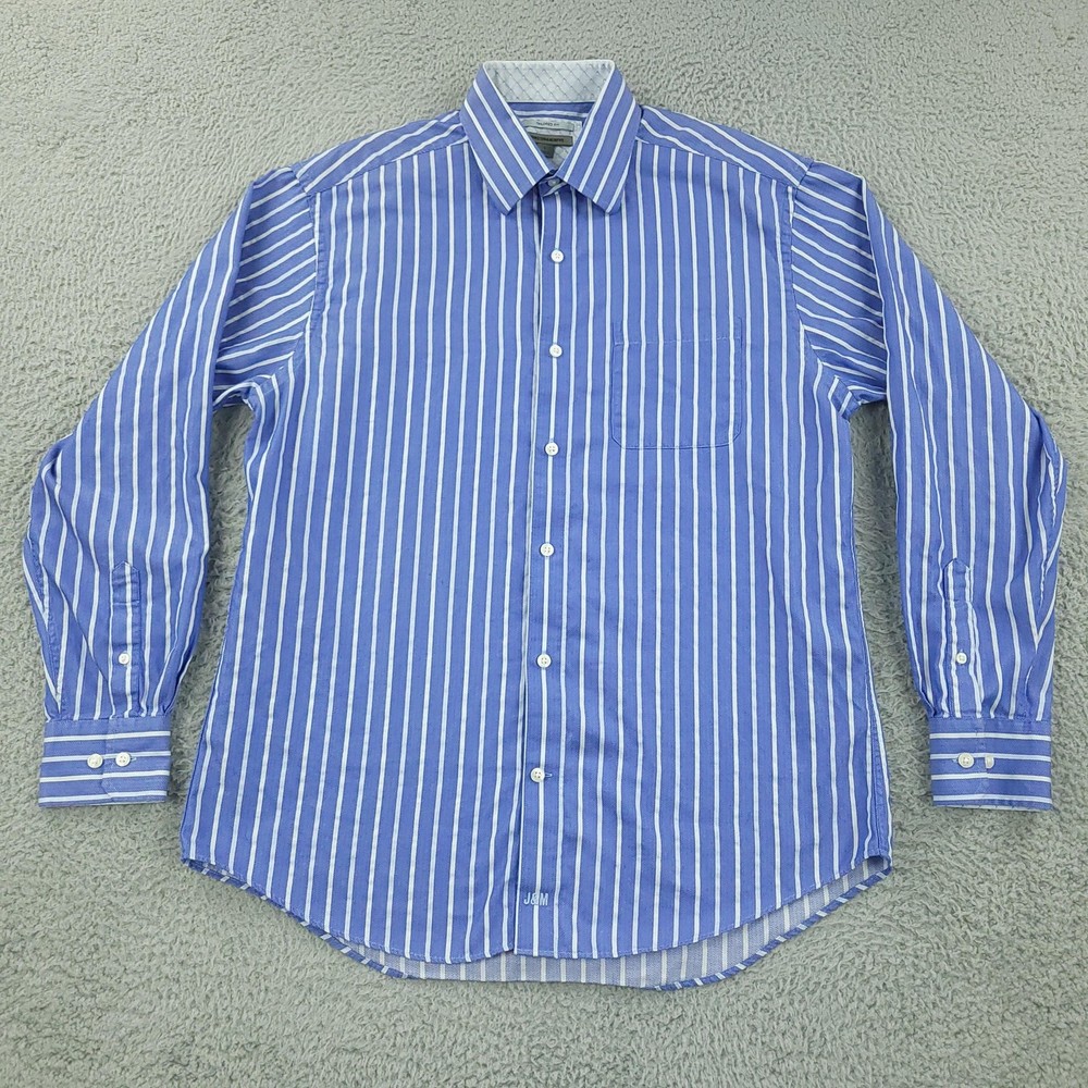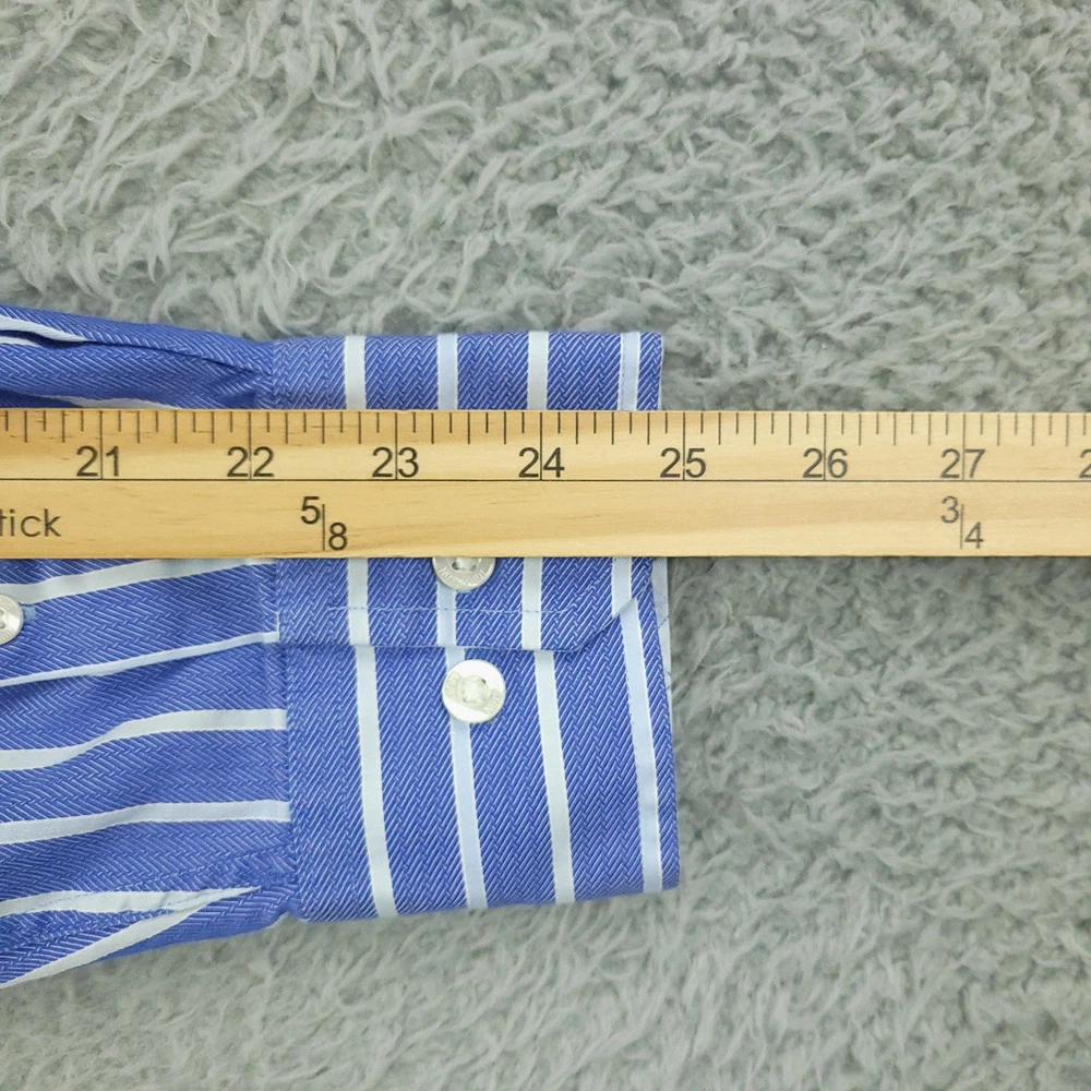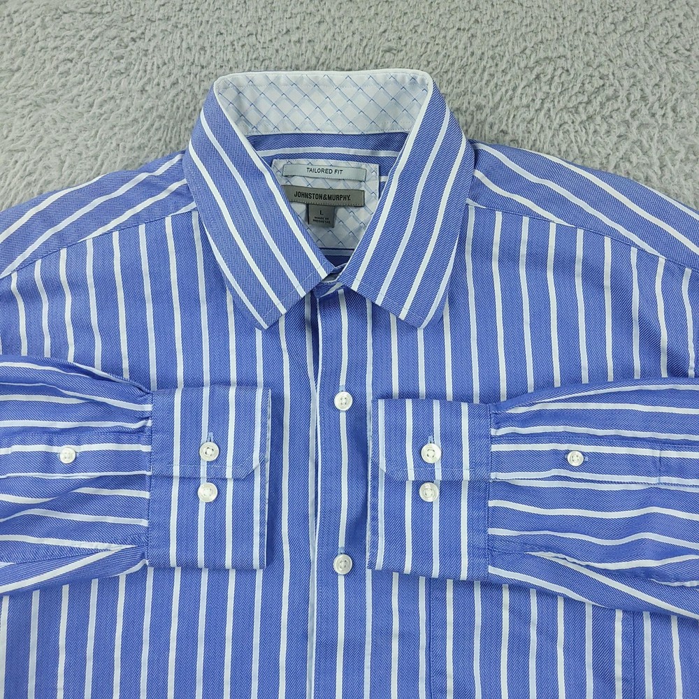Brand: Johnston & Murphy Style: Mens long sleeve button-front dress shirt in a tailored fit with vertical blue and white stripes and subtle herringbone texture. Color: Blue with white stripe pattern; contrast inner collar and cuffs feature a light blue diamond check design. Material Cotton Size on tag: Large (L) Details: Point collar, front button closure, single chest pocket, adjustable button cuffs, curved shirttail hem with small "J&M" embroidery near the front hem. Made in Indonesia. Washed and dried with Fragrance Free Detergent & Dryer Sheets. Measurements are included in the photos, compare measurements with your item to ensure proper fit. (Measurements are done with the item lying flat). I ship next business day and all items include tracking. Items are added daily to my store Visit My Store Buy More & Save! Combined shipping for US customers - $1.99 for each additional item (Add items to shopping cart and discounts will automatically calculate during checkout)