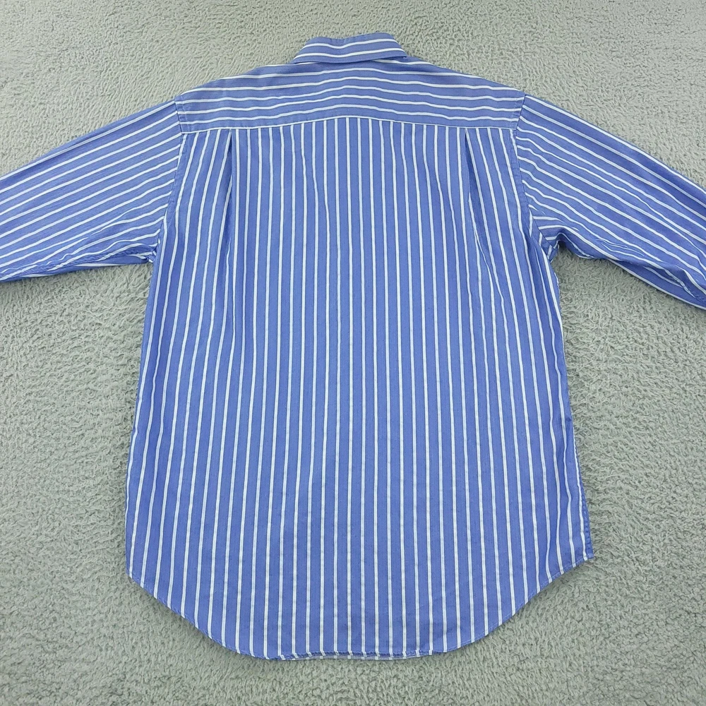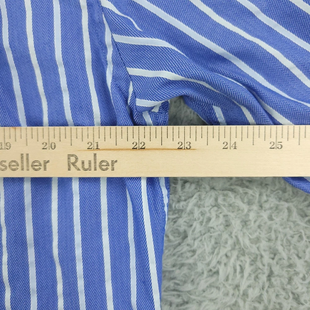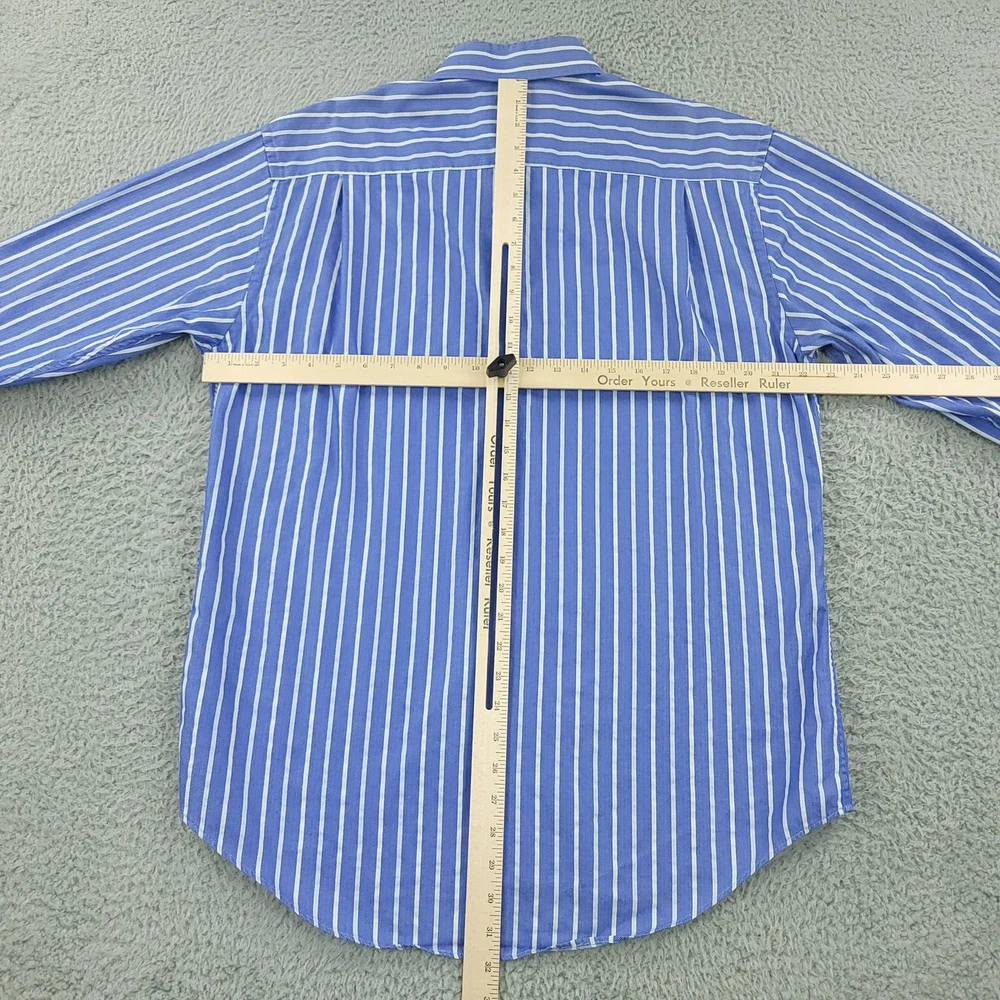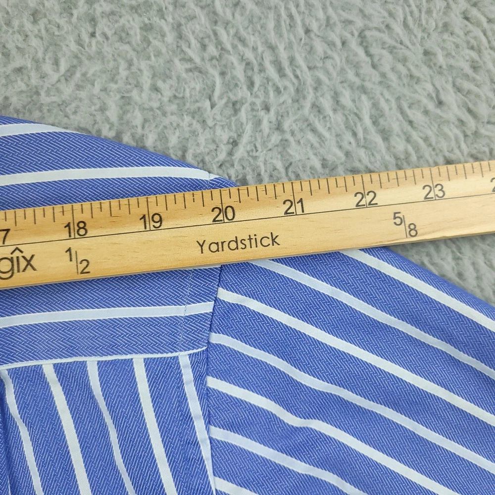 Brand: Johnston & Murphy Style: Mens long sleeve button-front dress shirt in a tailored fit with vertical blue and white stripes and subtle herringbone texture. Color: Blue with white stripe pattern; contrast inner collar and cuffs feature a light blue diamond check design. Material Cotton Size on tag: Large (L) Details: Point collar, front button closure, single chest pocket, adjustable button cuffs, curved shirttail hem with small "J&M" embroidery near the front hem. Made in Indonesia. Washed and dried with Fragrance Free Detergent & Dryer Sheets. Measurements are included in the photos, compare measurements with your item to ensure proper fit. (Measurements are done with the item lying flat). I ship next business day and all items include tracking. Items are added daily to my store Visit My Store Buy More & Save! Combined shipping for US customers - $1.99 for each additional item (Add items to shopping cart and discounts will automatically calculate during checkout)
