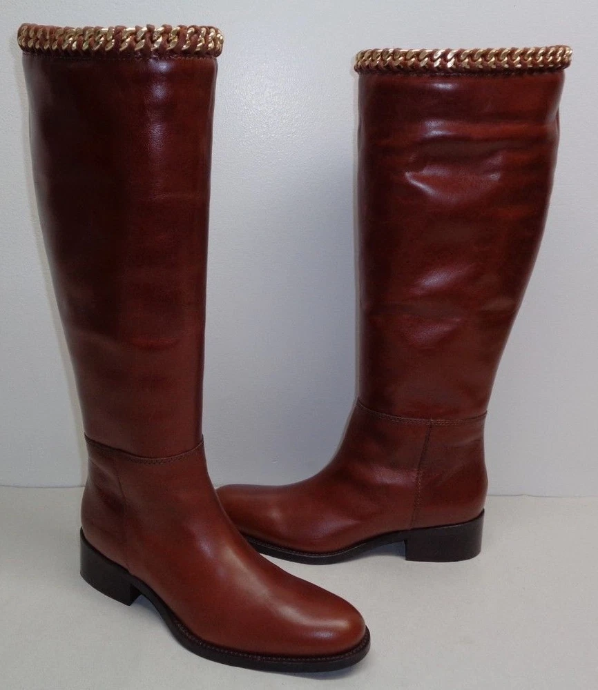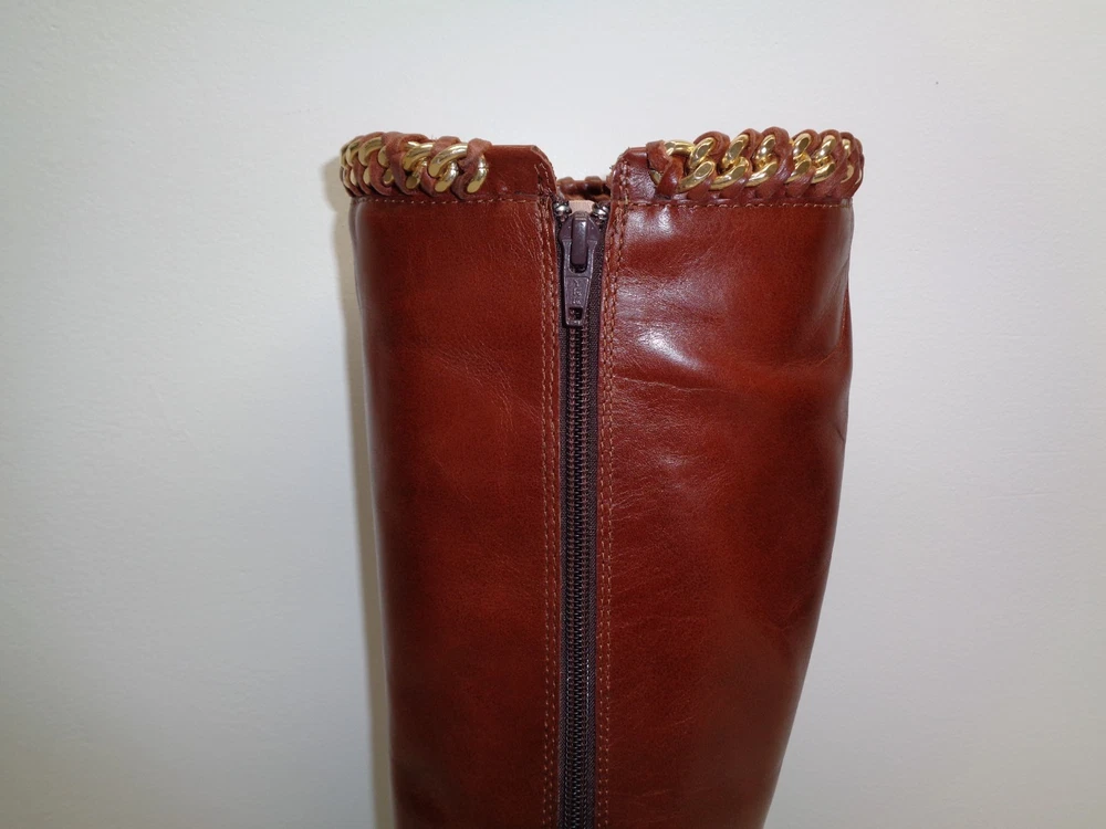 Johnston & Murphy Size 6 M SARI CHAIN Brown Leather Boots New Womens Shoes -Style: SARI, 78-51602 -Color: Roast Calf -Rich leather upper -Leather lining -Leather sole with rubber insert for extra flexibility -Full length inner shaft zipper -Leather and metal chain braiding at collar - Shaft height is approximately 15 inches -Heel height is approximately 1.5 inches -Top to bottom is approximately 16.5 inches -Boot opening is approximately 14.5 inches -Eur 37, JPN 22 and UK 4