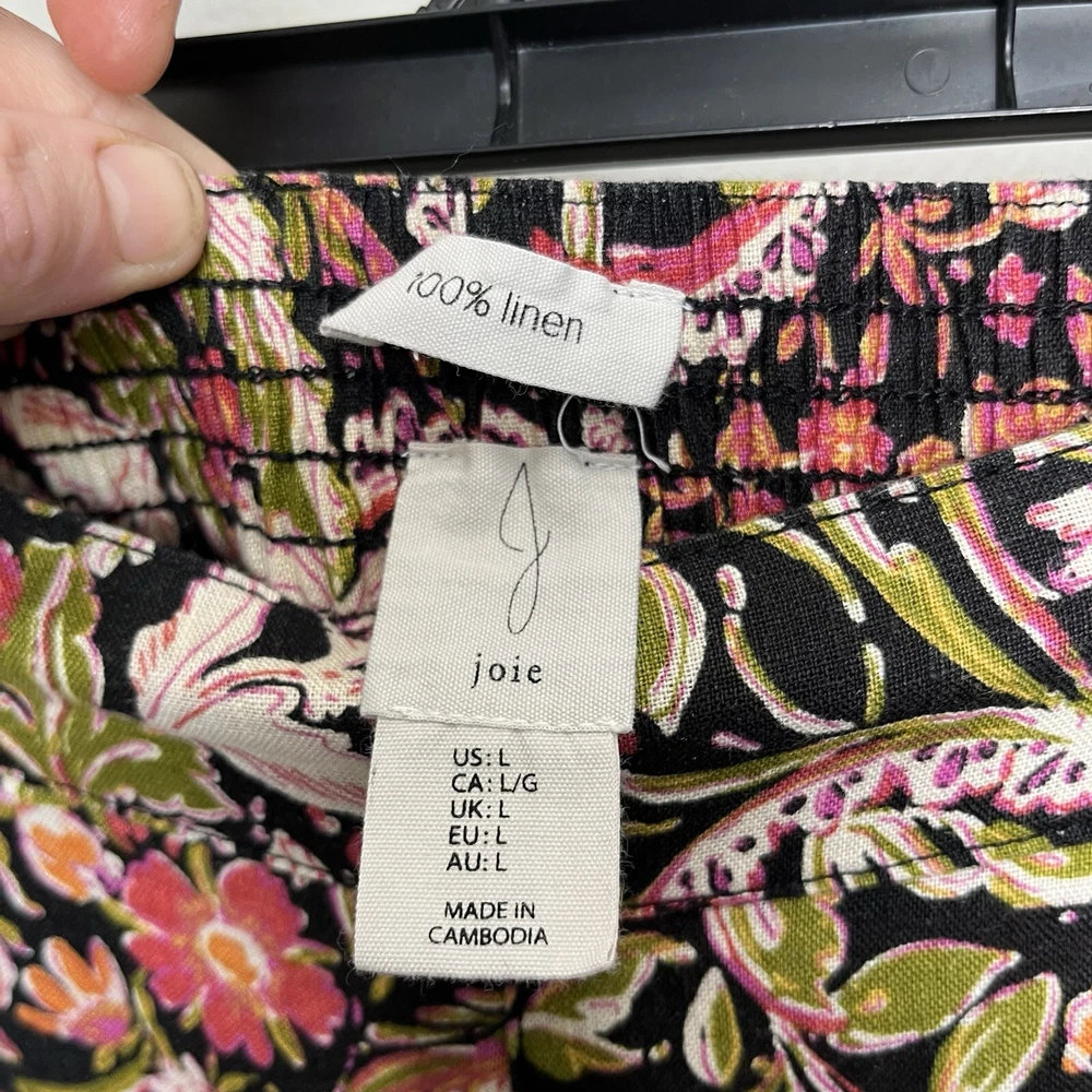 Get ready to embrace the bohemian spirit with these stunning Joie wide-leg pants. Made of 100% linen, these ankle-length pants feature a high-rise waist, flat front, and back elastic for a comfortable fit. The pull-on closure and multicolor dark floral pattern make them perfect for any casual or travel occasion. These pants are a must-have for any summer or spring wardrobe, with a relaxed fit and a 24-inch inseam. The linen fabric type ensures breathability and comfort, while the wide-leg style adds a touch of sophistication. Whether you pair them with a simple tee or a statement blouse, these pants will elevate any outfit. In excellent condition, look almost new Measures approximately 16” across waist laying flat with a 24” inseam and a 12.5” rise 4