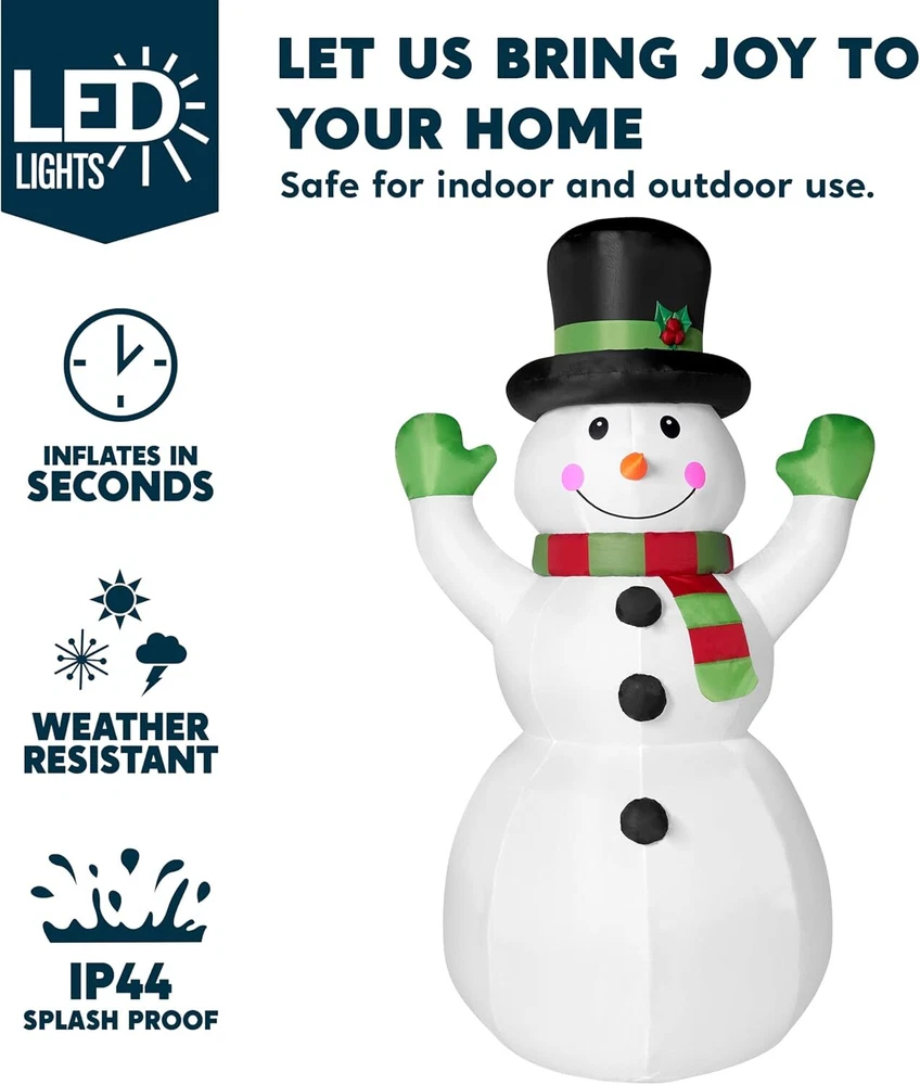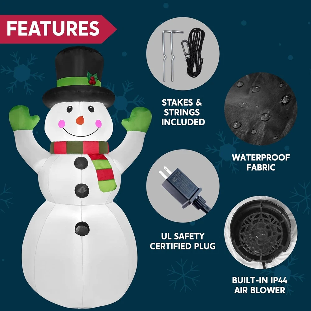 Joiedomi 6 FT Tall Christmas Inflatables Snowman Outdoor Decorations with Built-in LEDs, Xmas Blow Up Snow Man with Magic Hat for Christmas Party Outdoor Indoor Yard Garden Decoration Item Description OUTSTANDING DESIGN. This Christmas inflatable outdoor decoration features an adorable snowman with outstretched arms, appearing to welcome the Christmas season with joy. Its classic design adds a charming and festive touch to your holiday decor. Product size 4 x 3 x 6 feet. This inflatable comes with an extended cord, ground stakes, fastened ropes, built-in sandbags, and a plug with UL certification. POWERFUL FEATURES. Equipped with built-in LED lights, this snowman inflatable shines brightly, creating a warm and inviting holiday atmosphere. The energy-efficient LEDs ensure your display is eye-catching both day and night. UL CERTIFIED. Safety is our priority. This inflatable snowman outside decoration is UL certified, meeting rigorous safety standards. You can decorate with peace of mind, knowing this product is safe for use indoors and outdoors. VERSATILE USE. Perfect for a variety of settings, this blow up snowman is ideal for yards, gardens, patios, or even indoor spaces. Its design and festive lighting make it a versatile addition to any Christmas decor. EASY TO USE. Designed for convenience, this inflatable Christmas decoration is easy to set up and take down. It includes all necessary components for quick installation and deflation, allowing you to effortlessly create a festive display and store it away with ease after the holiday season. › See more product details Payment We accept payment only through PAYPAL Shipping We ship products worldwide through standard express courier service, it will reach within 7 to 10 days to abroad buyers, we ship the product after recieved clear payment and give full information about shipment to the buyer Return We accept product return within 7 to 21 days from delivery date but product should be in original position and not in damaged condition,the return shipping charges will be buyer responsibility