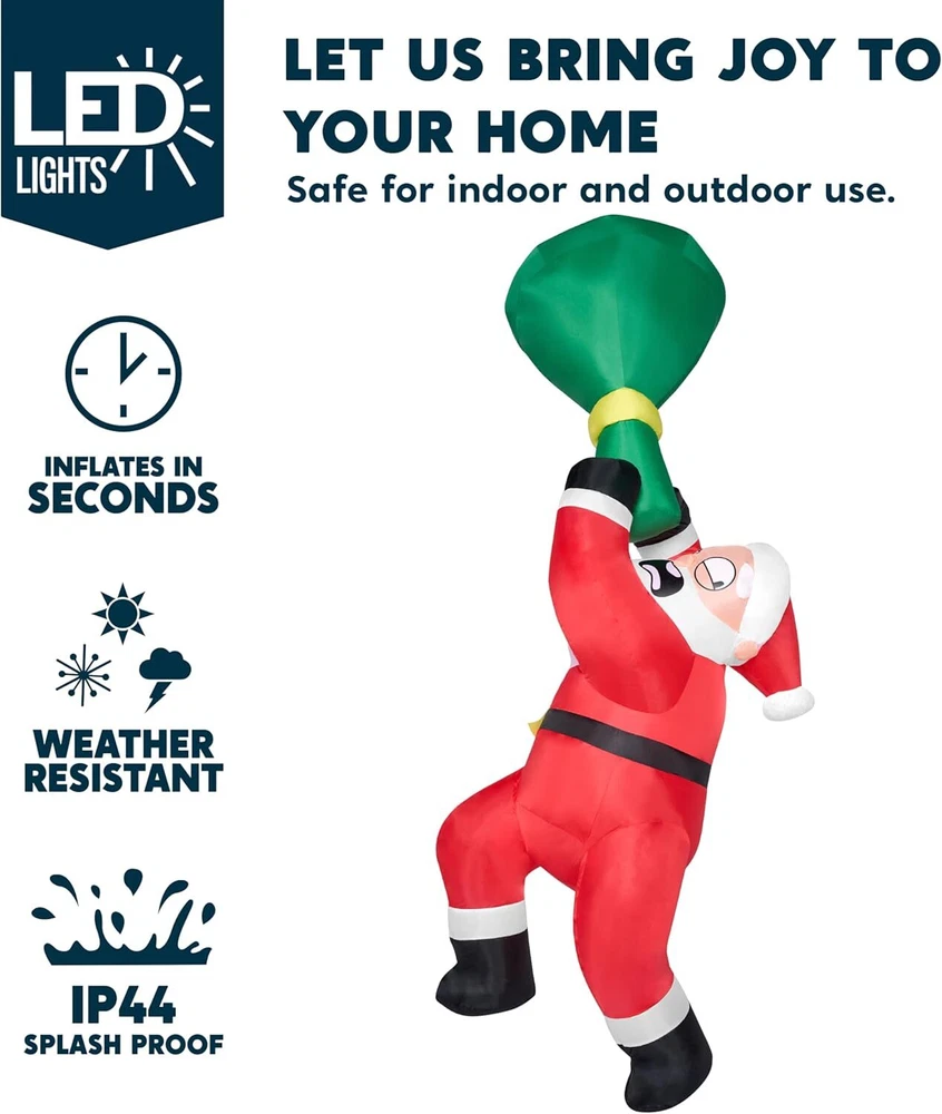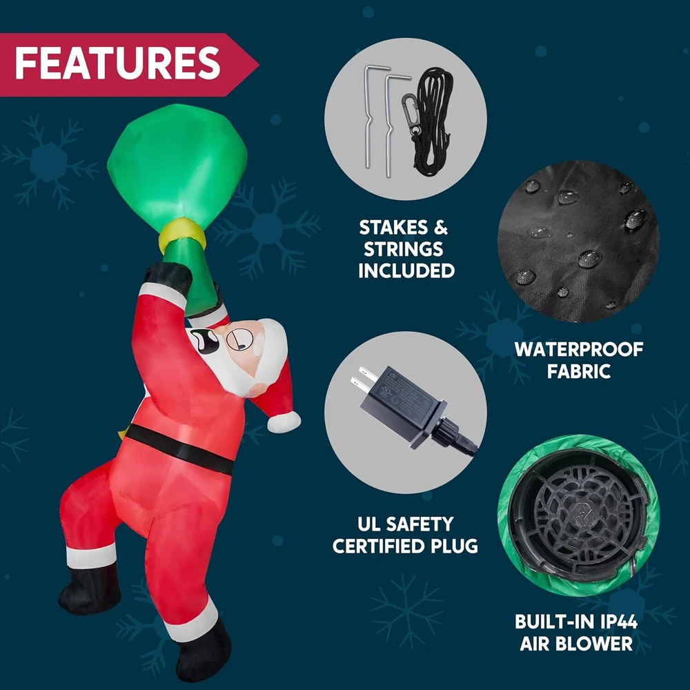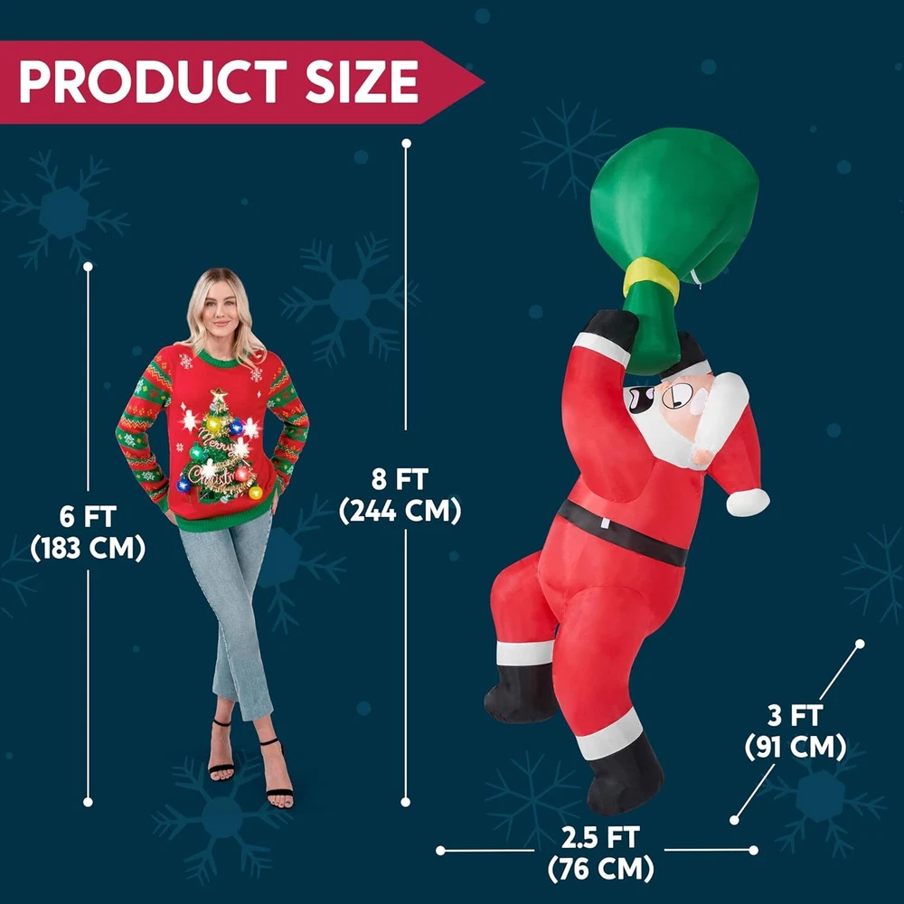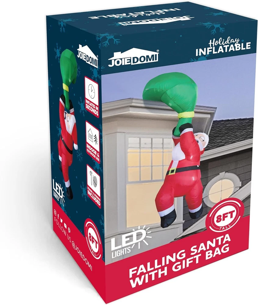Joiedomi 8 FT Tall Christmas Inflatable Falling Santa with Gift Bag, Blow Up Christmas Hanging Santa Inflatables Outdoor Decoration with Build-in LEDs for Xmas Party Outdoor Indoor Yard Garden Decor Item Description Outstanding Design. This inflatable decoration features a whimsical and humorous design of Santa in a falling pose with a gift bag, complete with a comically terrified expression. This unique and playful design will undoubtedly bring joy and laughter to your holiday setup, making it a standout piece in your Christmas decor. Product size 2.5 x 3 x 8 feet. This inflatable comes with an extended cord, ground stakes, fastened ropes, built-in sandbags, and a plug with UL certification. Powerful Features. Equipped with built-in LED lights, this falling inflatable Santa ensures your holiday display is bright and eye-catching. The energy-efficient LEDs provide a warm and festive glow, enhancing the charm of Santa's hilarious falling pose and making your decoration visible and appealing both day and night. UL Certified. Safety is our top priority. This blow up falling Santa decoration is UL certified, meaning it meets rigorous safety standards. You can enjoy peace of mind knowing that this product is safe for use in various environments, both indoors and outdoors. Versatile Use. Ideal for a variety of settings, this falling Santa inflatable is perfect for yards, gardens, patios, or even indoor spaces. Its charming and festive design, combined with its glowing lights, makes it a versatile addition to any Christmas decor theme, spreading holiday cheer wherever it's placed. Easy to Use. Designed for convenience, this Xmas inflatable decoration is easy to set up and take down. It comes with all necessary components for quick installation and deflation, allowing you to effortlessly create a delightful holiday display and store it away with ease when the season is over. › See more product details Payment We accept payment only through PAYPAL Shipping We ship products worldwide through standard express courier service, it will reach within 7 to 10 days to abroad buyers, we ship the product after recieved clear payment and give full information about shipment to the buyer Return We accept product return within 7 to 21 days from delivery date but product should be in original position and not in damaged condition,the return shipping charges will be buyer responsibility
