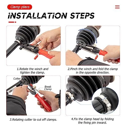 Return Policy Fast Delivery Trusted seller Joint CV Boot Clamp Pliers, Ear Clamp Banding Tool Kit, Automotive Hose Axle Pliers, Heavy Duty Universal Vacuum Hoses Clamping, Auto Repair Tools for Car ATV UTV Product Description 【Premium Material】: The pliers are made of high grade pressed steel and coated with a black coating. Heavy-duty pliers with non-slip plastic handles, high-quality steel jaws and shaped handles, making it more comfortable to use. 【Practical Function】: The 2pcs CV joint boot clamps pliers car banding tools kit set for fast and simple tensioning and securing of CV boot banding strap. With a built in cutter and winding mechanism the banding can be tightened and cut quickly and effectively. This tool is essential for fixing CV boots. Heavy-duty pliers with steel jaws and formed handles for ultimate comfort, less user fatigue, and more productivity. 【Crimping Tool】: Equipped with in-line jaws on the end, this axle boot clamp tool can perfectly crimp on clamp ears to prevent damage and offer a perfect crimp on clamp ears to prevent leakage. It's a must-have CV boot repair kit for repairing store. 【Large Compatibility】: The CV boot clamp pliers for ear-type clamp crimping or removal on for most vehicles in the market to crimp and flatten the clamp on ear-type constant velocity joint boot clamps, also be used for securing ATV UTV boot clamps. Also a good CV boot installation tool and hose grip pliers suitable for installation of certain clamps on fuel filters, water pumps and other cooling systems. 【What You Get】: The package includes 1x CV joint ear clamp banding tool and 1x CV boot clamp pliers, same as the pictures. Different clamp to meet your different needs. We focus on customer using experience and try our best to provide the best product and service for our customers. Shipping Returns Payment Shipping Shipping is FREE to all addresses other than APO/PO boxes in the lower 48 states. All our stock ships from US-based warehouses. Shipped via USPS or UPS (depending on location and package weight) Unless stated otherwise, all orders will ship within 24-72 hours of your payment being processed. Check our feedback to see the great reviews of FAST shipping we offer. Returns Seller does not accept returns Payment We currently accept payment via eBay managed payments only. Once payment is cleared, we will dispatch your shipment within 1-3 business days. Please refer to the "Shipping" tab for more information regarding shipping speed to your destination.