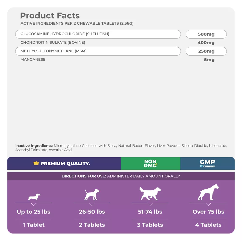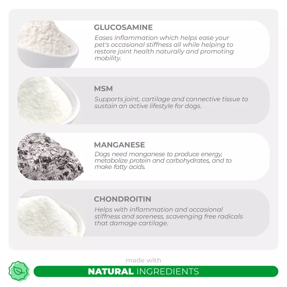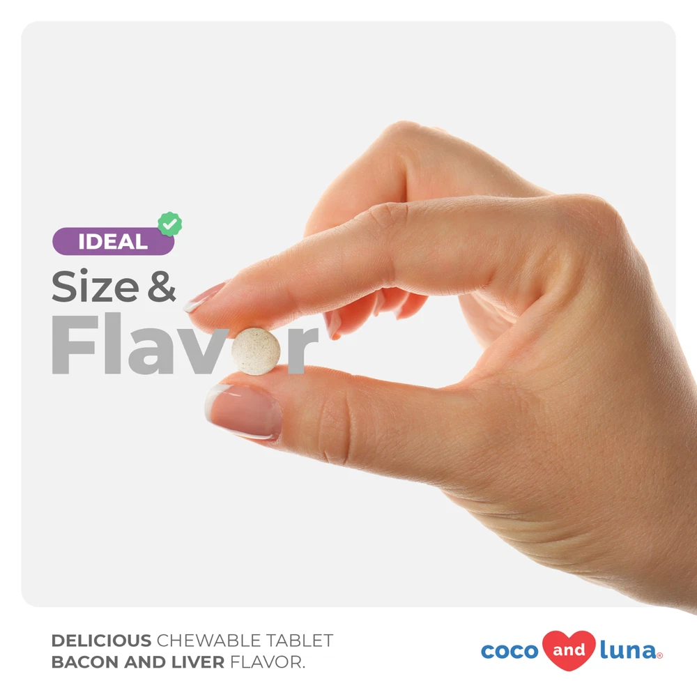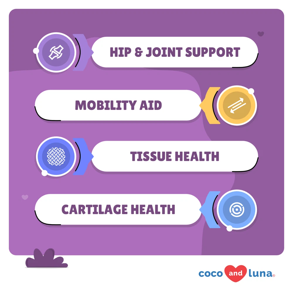 Premium Joint Supplement - Coco and Luna Hip and Joint supplement promotes joint health and joint lubrication while also diminishing arthritis pain through its anti-inflammatory effects. Powerful Formula - Our tablets contain Chondroitin which facilitates the absorption of nutrients and promotes cartilage synthesis, while also being an antioxidant and cell rejuvenator. For Dogs of All Ages - We make our tablets with glucosamine that is perfect for dogs of all ages by helping preserve the integrity of joints and averting deterioration of bone and cartilage. Joint Supplement for Dogs - Coco and Luna Hip and Joint supplement for dogs promotes joint health and joint lubrication while also diminishing arthritis pain through its anti-inflammatory effect. Powerful Formula - Our dog joint supplements contain Chondroitin which facilitates the absorption of nutrients which promotes cartilage synthesis, while also being an antioxidant and cell rejuvenator. For Dogs of All Ages - We make our tablets with glucosamine that is perfect for dogs of all ages by helping preserve the integrity of joints and averting deterioration of bone and cartilage. A Brand You Can Trust - We understand how much your pet’s health and wellbeing mean to you, so our joint supplements for dogs are manufactured in FDA-registered facilities that are NSF and GMP-certified in the USA. Made in the USA from US and Globally Sourced Ingredients - All our products are made in the USA and are veterinarian approved as well as hypoallergenic. Our supplement may help with arthritis pain relief for dogs and may help with overall joint care for dogs.