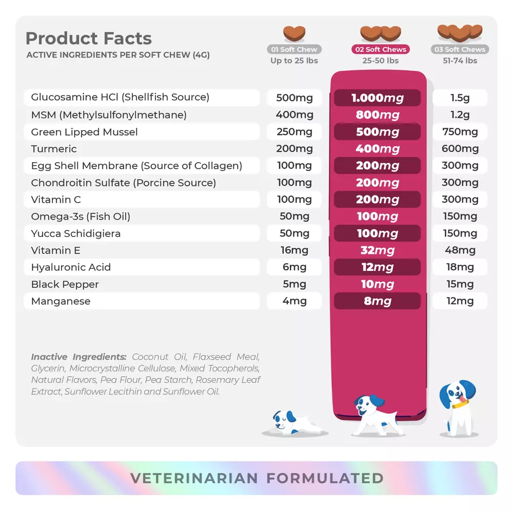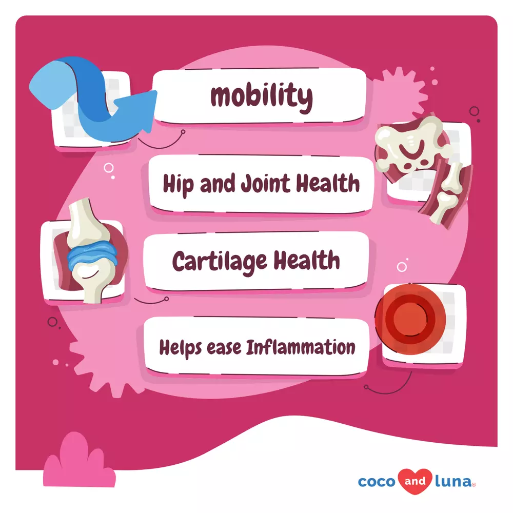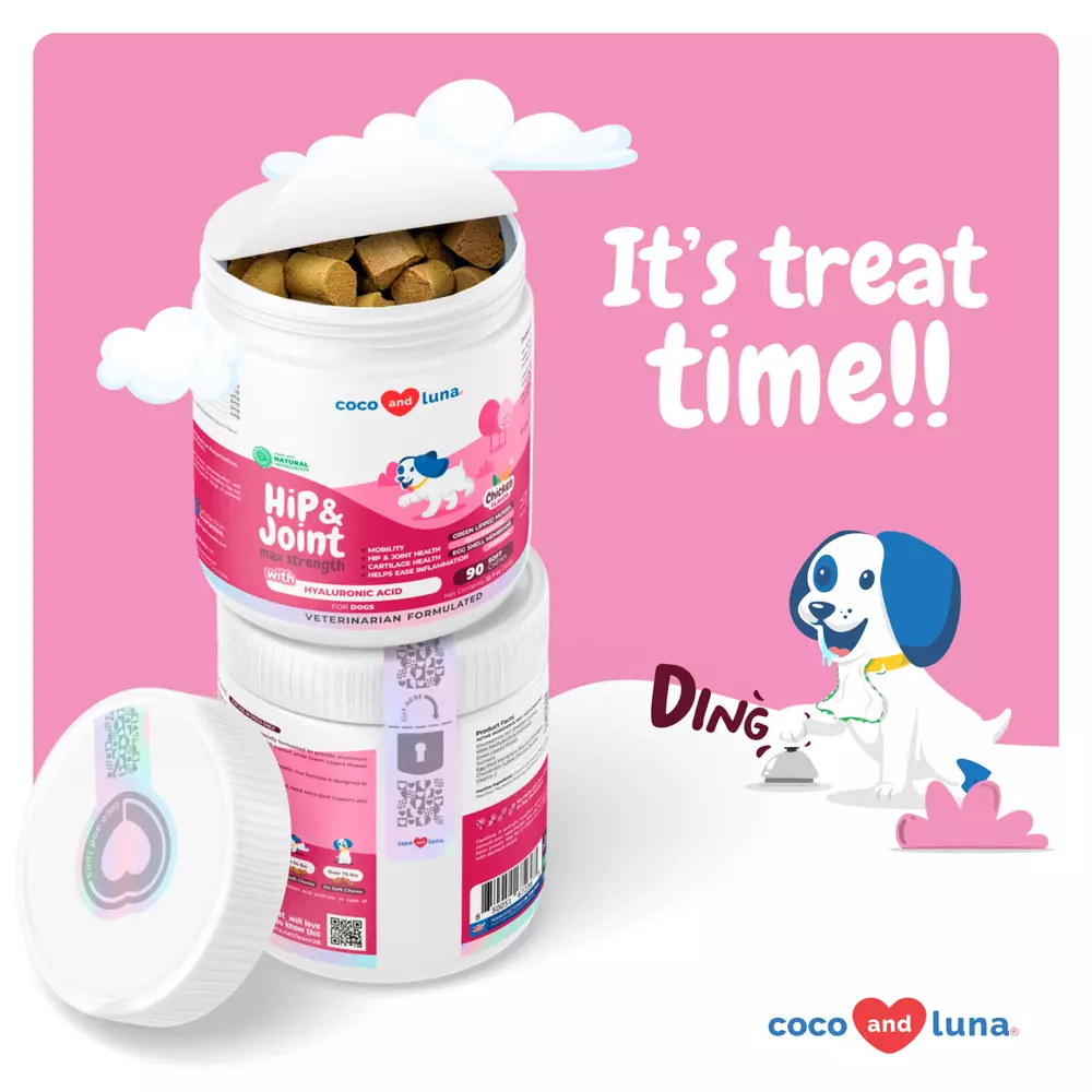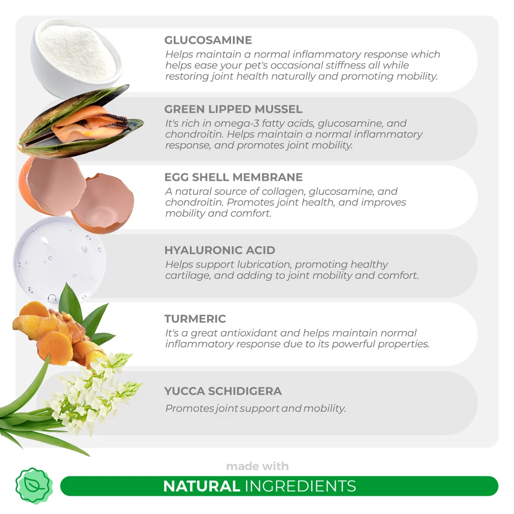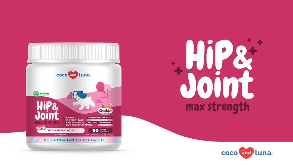 Maintaining healthy hips and joints is crucial for enjoying an active and pain-free life. Coco and Luna Hip and Joint Supplement contains Glucosamine HCL, chondroitin and MSM which support normal joint function and comfort by diminishing inflammation for optimal daily activity. Our featured ingredient of Hyaluronic Acid is a major component of synovial fluid, a thick, viscous fluid that lubricates and cushions the joints. In dogs with joint issues, the synovial fluid can become thinner and less effective at lubricating the joints. Hyaluronic Acid supplements help restore the viscosity and lubricating properties of synovial fluid, reducing friction between joint surfaces and promoting smoother joint movement. Hyaluronic Acid helps protect and preserve cartilage by promoting the production of key molecules that make up cartilage, such as proteoglycans and collagen. Our product is Veterinarian Formulated and is free from Palm Oil, Corn, Soy Derivatives, Artificial Flavors, and Preservatives. Prioritize your dog's health the natural way. Our Hip and Joint Max Strength formula is specially formulated with Green-lipped Mussel rich in omega-3 fatty acids, particularly eicosatetraenoic acid (ETA), which has potent anti-inflammatory properties which may help minimize joint tenderness and promote mobility. Advanced Joint Health Formula: Our hip and joint support product for dogs combines powerful ingredients like Glucosamine, Green Lipped Mussel, and Egg Shell Membrane to maintain a normal inflammatory response, restore joint health, and promote joint mobility naturally. Our unique formulation with Green-lipped mussel and Omega 3 fish oils is a carefully crafted blend of components which synergize to optimize joint function and protect cartilage. Natural Antioxidant Blend: Featuring Turmeric and Yucca Schidigera, our formula not only promotes joint support but also aids in maintaining a normal inflammatory response, all while providing a potent antioxidant boost for your dog's well-being. Veterinarian Formulated - Our supplements are veterinarian formulated and are free from harmful ingredients like Palm Oil, Corn, Soy Derivatives, Synthetic Colors, or Artificial Flavors, prioritizing your pet's well-being. Made in the USA from US and Globally Sourced Ingredients - All of our supplement products are manufactured in the USA in FDA-registered facilities that are NSF and GMP-certified in the USA.