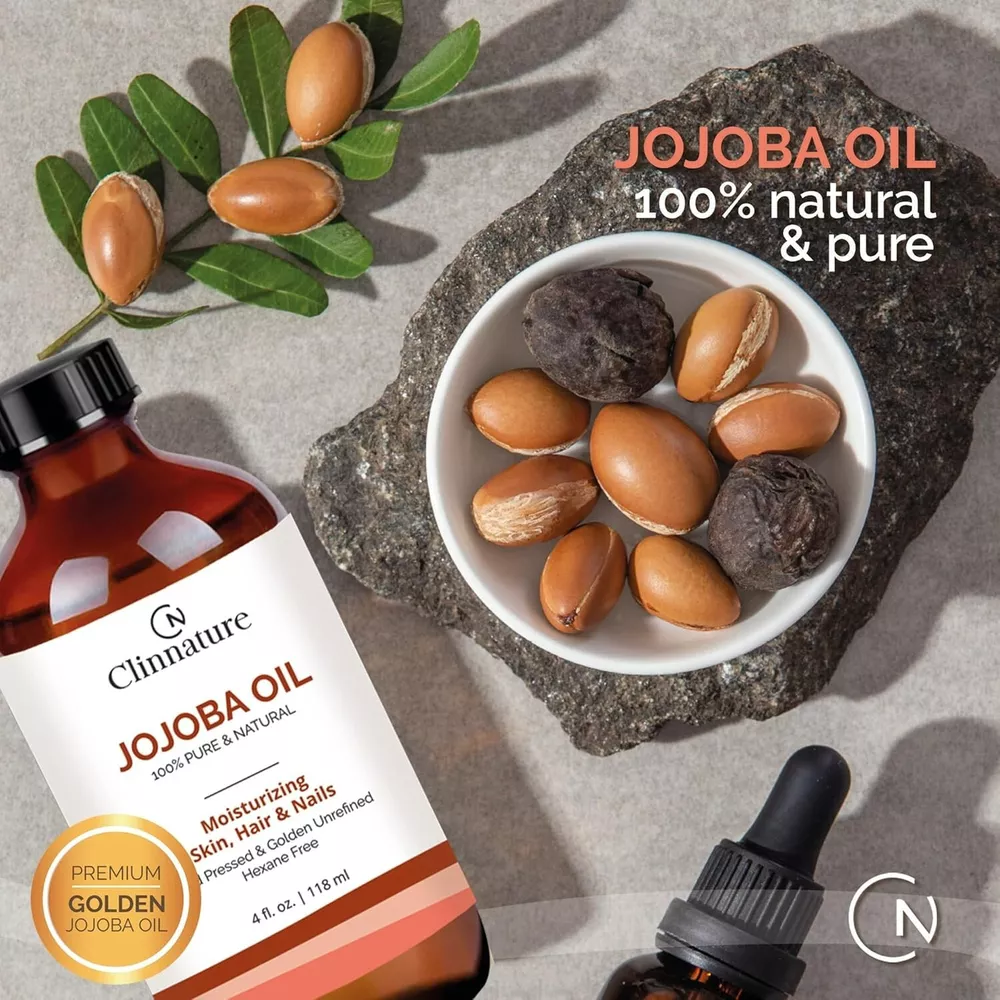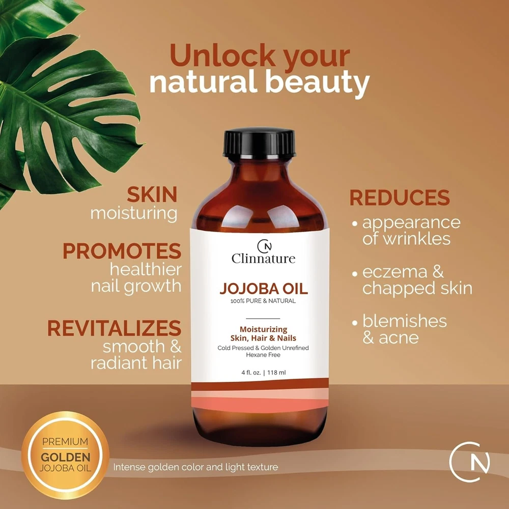 Jojoba Golden Oil 100% Pure & Natural | Cold Pressed | Hexane-Free | For Hair & Skin & Nails, Dermaplaning & Anti-aging 4 Fl. Oz. (118 ml) Glass Bottle | Includes Free Dropper. Brand CLINNATURE Item Volume 4 Fluid Ounces Item dimensions L x W x H 2 x 2 x 4.53 inches Age Range (Description) Adult Special Feature Not Tested On Animals, Travel Size, Aromatherapy, Natural Ingredients About this item ✅ 100% PURE JOJOBA OIL: Our Jojoba Golden Oil is 100% pure, providing the perfect facial oil for dermaplaning and enhancing natural beauty. A jojoba oil perfect for face care, moisturizing and nourishing your skin." ✅ COLD PRESSED AND HEXANE-FREE: Our Jojoba Golden Oil cold pressing process ensures that the oil retains its nutrients. It is hexane-free, unrefined, making it a safe and pure Jojoba Golden Oil for your skin and hair care regimen." ✅ MOISTURIZING & NOURISHING: This skin jojoba oil provides intense hydration, promoting healthier, smoother skin. " ✅ IDEAL FOR DERMAPLANING: This dermaplaning face oil helps create a smooth surface for flawless makeup application. It's also a dermaplaning oil for the face, which helps remove dead skin cells and reveals a youthful glow." ✅ ANTI-AGING FACE OIL: These are the perfect facial oils for facial anti-aging, reducing the appearance of fine lines and wrinkles