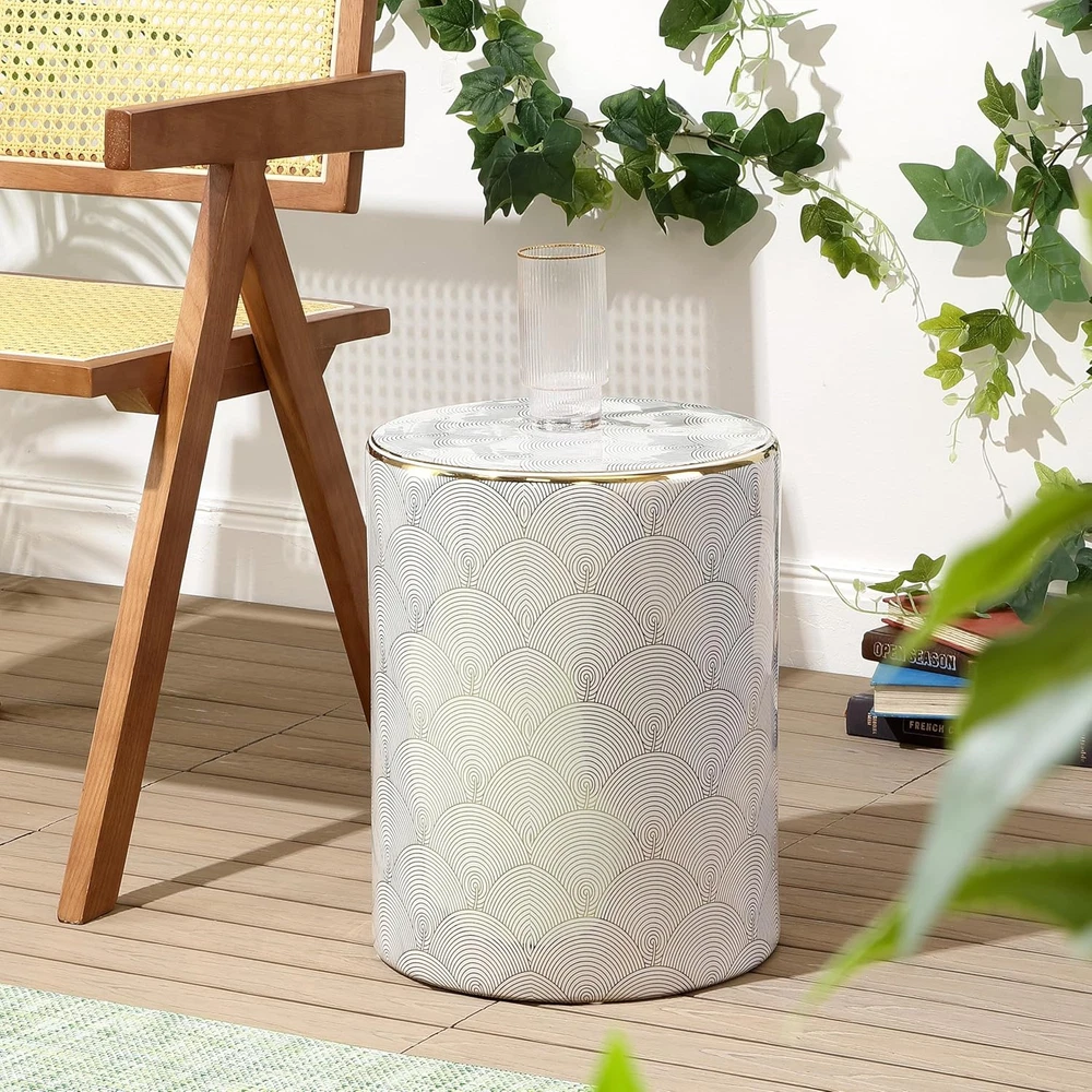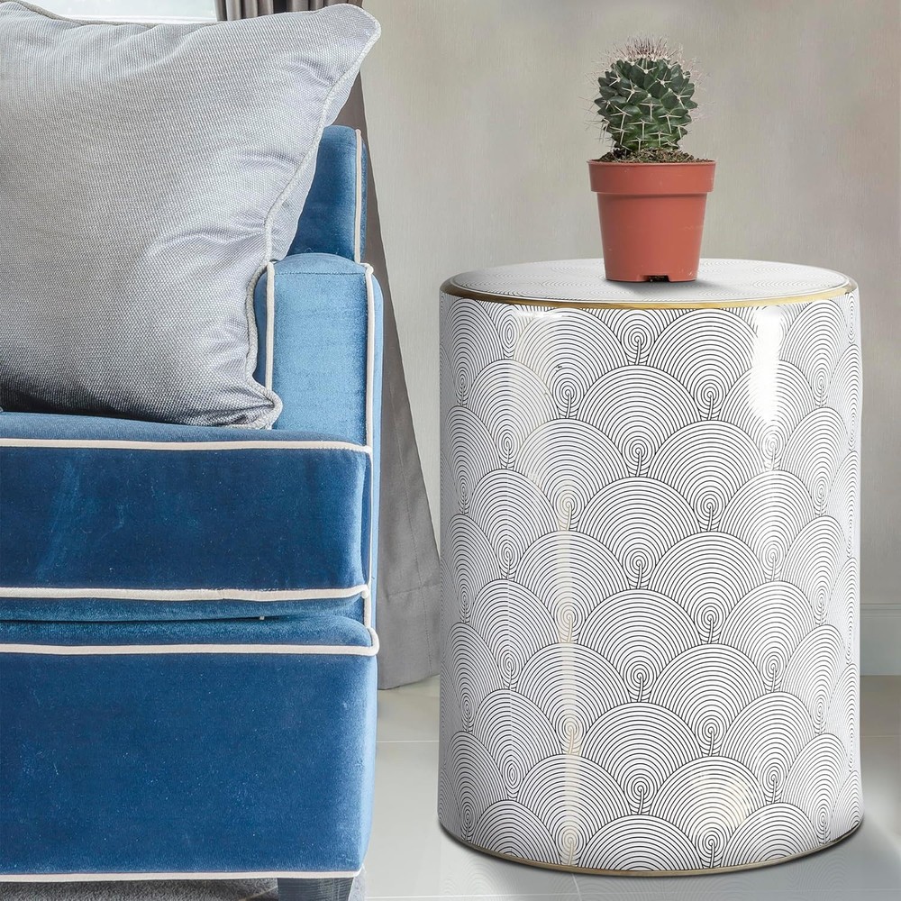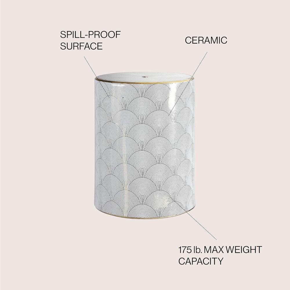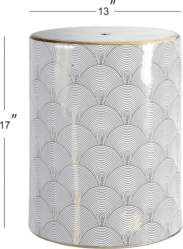 JONATHAN Y TBL1001A Fish Scale 17" Modern Ceramic 13*13*17 Inches, White/Gold Product Details Product Dimensions: 13"D x 13"W x 17"H Color: White/Gold Brand: JONATHAN Y Size: 13*13*17 Inches Style: Modern Furniture Finish: White Seat Height: 17 Inches Leg Style: Modern Seat Width: 17 Inches Maximum Weight Recommendation: 175 Pounds Product Care Instructions: Wipe clean Assembly Required: No Number of Pieces: 1 Item Weight: 19.8 pounds Manufacturer: happimess Item model number: TBL1001A Fabric Type: Ceramic Finish types: White / Gold Batteries required: No Included Components: Garden Stool Frame MaterialSeat Material Type: CeramicCeramic ShapeItem Weight: Round19.8 Pounds Ceramic INDOOR/OUTDOOR DURABILITY: Give your garden or living room an accentuating appearance by adding a robust accessory; Whether for outdoor or indoor use, this garden stool is flawlessly designed and built to last through several dry and damp conditions MULTI-PURPOSE: Expand your horizons with this garden stool; can be used as a side table to hold books, a stool to support your feet, or a stand to hold your drinks or plants; this stool can also be used as extra seating for visiting company; Use this ceramic stool indoors or on the patio The ceramic glaze finish is spill-proof, ready to hold a cool drink or potted palm. A black-on-white line drawing in a fish-scale pattern gives this chic little garden stool a modern, artistic touch. The ceramic cylinder is a stylish update to the small drinks table. Gold edging and a glossy finish add a touch of glamour.