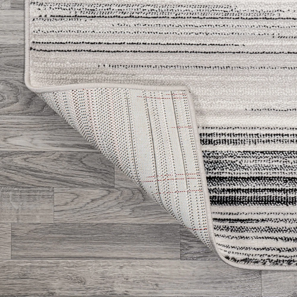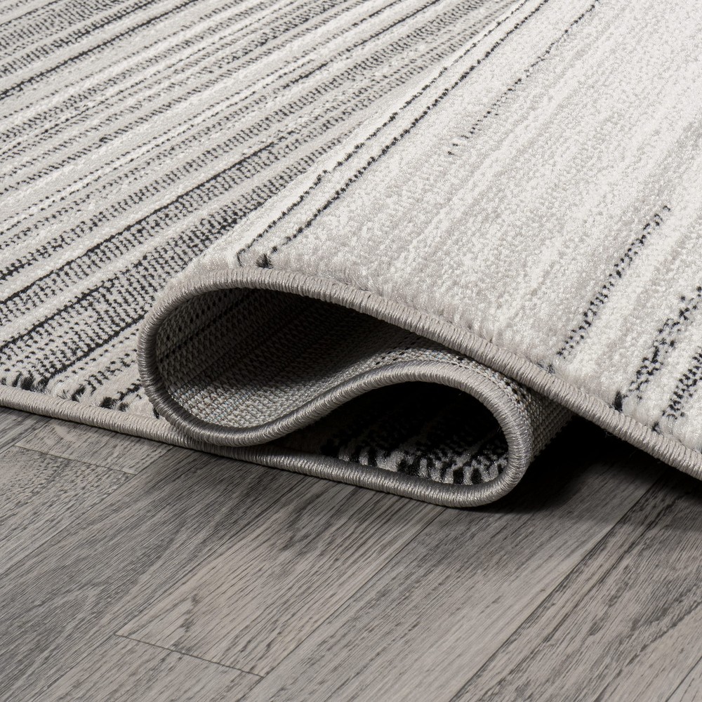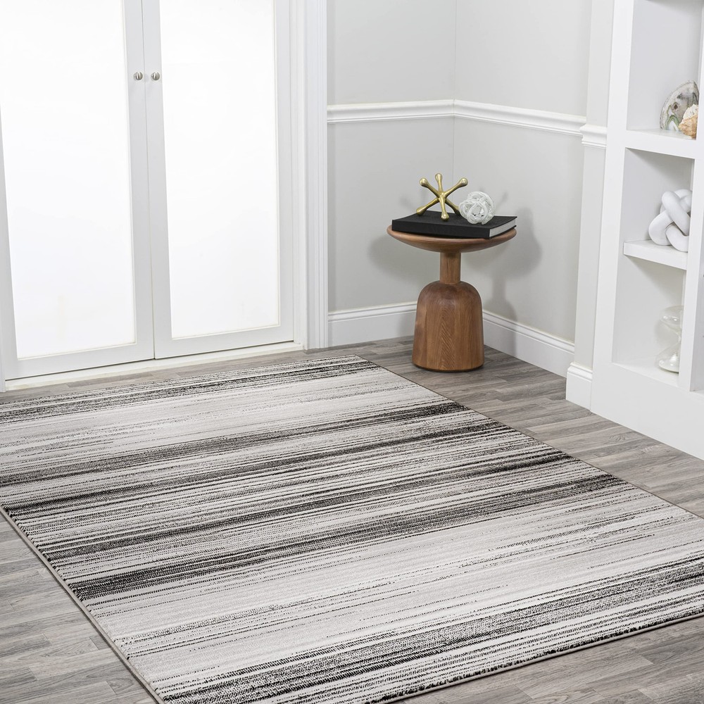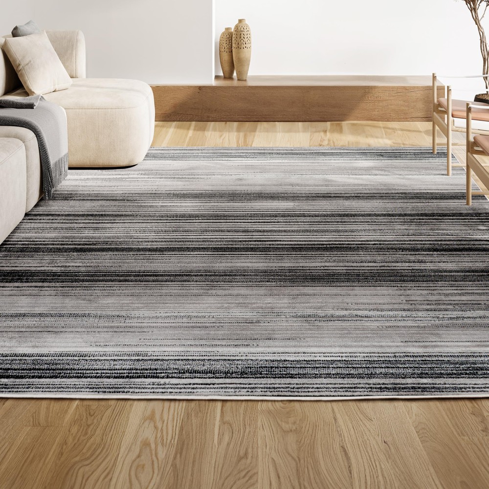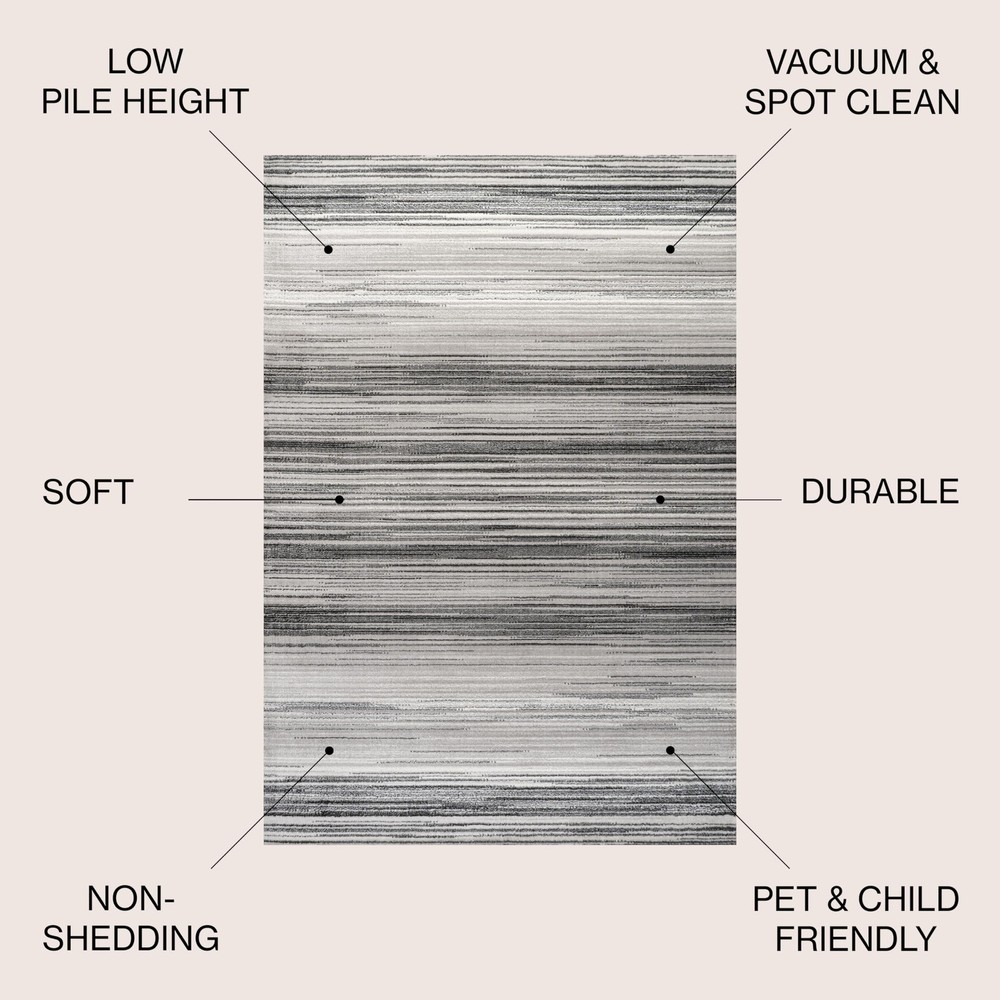 Mingled threads form a strié pattern to create a modern, linear stripe with industrial flair. This rug's unique gradient striped pattern makes it perfect for homes with kids and pets. It's perfect for the living room, bedroom or dining room in a contemporary, mid-century or minimalist interior. PET-FRIENDLY AND DURABLE: Durable for high-traffic areas, soft and comfortable area rug perfect for families with kids; Low-pile synthetic rug fibers won’t trap dirt and debris, so they’re pet-friendly and easy to clean STAIN-RESISTANT AND NON-SHEDDING: This rug is made from synthetic fibers that are water resistant, stain resistant; It’s been machine-woven so the rug fibers will stay put; When properly cared for, this rug won’t shed fluff into your home EASY TO CARE FOR: Vacuum regularly; Always raise or turn off the beater bars on your vacuum; Spot clean stains immediately with a mild detergent or carpet cleaning product, then rinse thoroughly and blot dry; Professional rug cleaning is recommended Power loomed from durable synthetic fibers, with a short 0.31" pile Deep charcoal against a soft gray and ivory background gives this rug a modern gradient-striped design