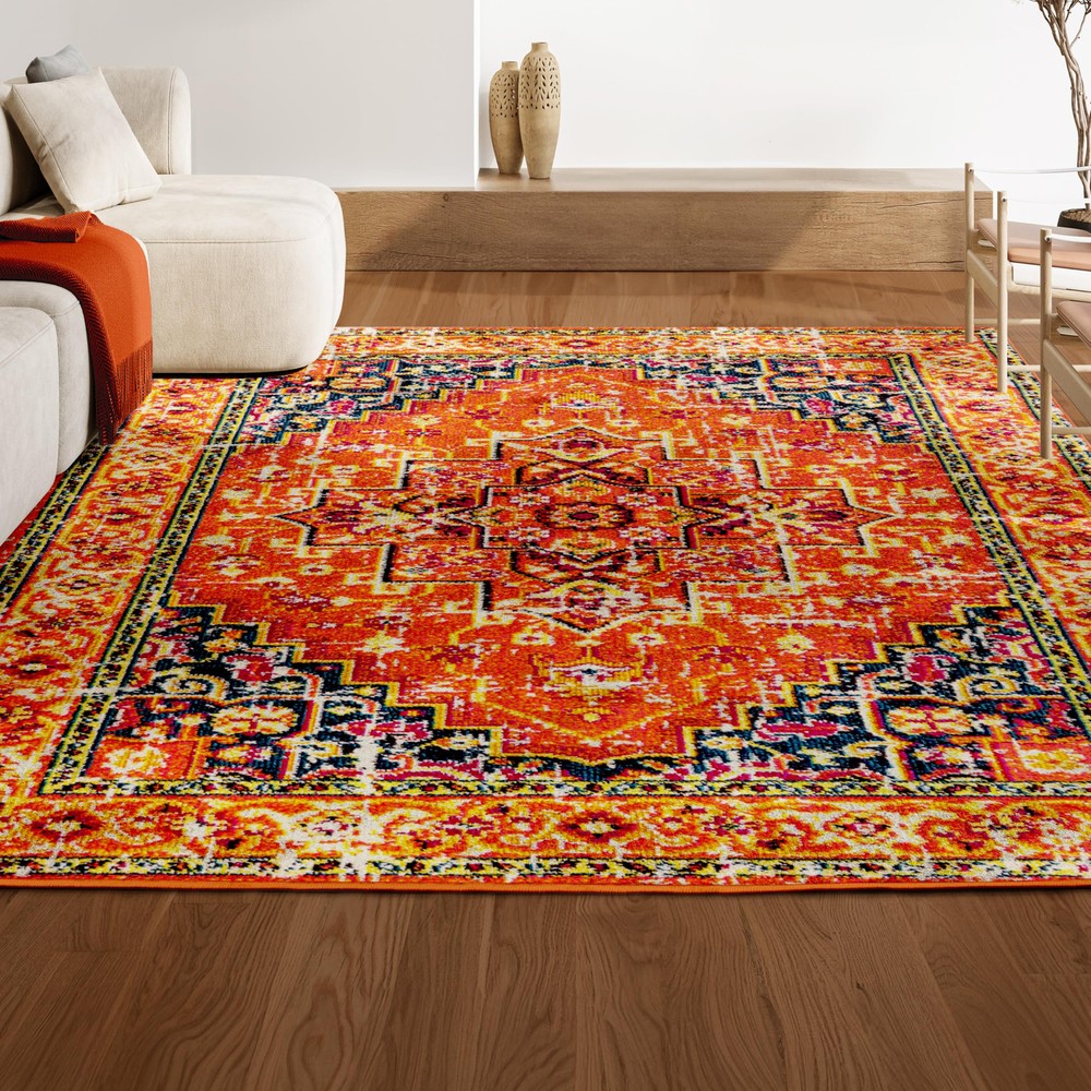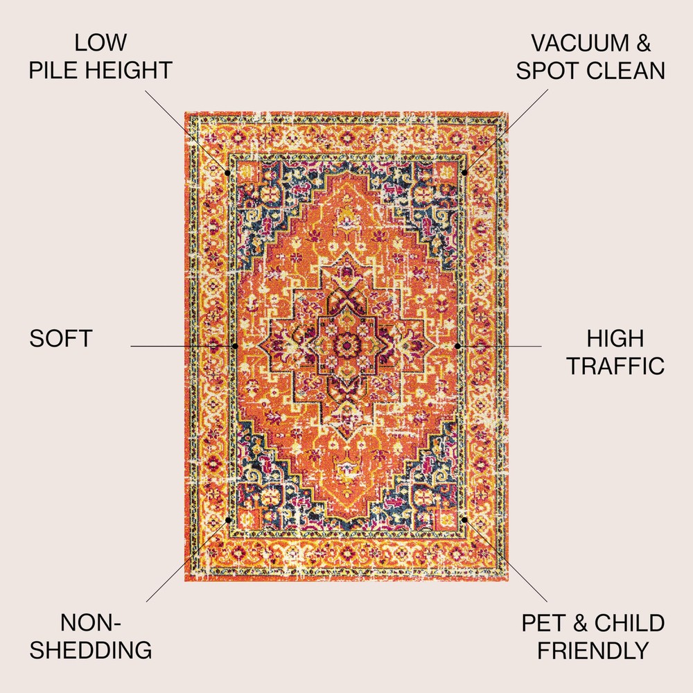 This rug's bright colors and vintage pattern add a Bohemian touch to your modern loft, Boho bedroom or colorful cottage. With its kid-friendly busy pattern, this rug is ideal for a kitchen, living room, den, bedroom or entry. An orange background, geometric central medallion, and bold color accents give this rug funky style. Actual Dimension: 7 ft. 9 in. x 10 ft. Color: Orange/Blue Thickness measures: 0.35 in. Vacuum regularly and spot clean as needed; avoid direct and continuous exposure to sunlight; use brushless vacuum; remove spills immediately; if liquid, blot with clean, undyed cloth by pressing firmly around the spill to absorb as much as possible; for hard to remove stains, professional rug cleaning is recommended; store in a dry, well ventilated area and rotate for consistent wear . The JONATHAN Y Rug Collection creates modern area rugs inspired by ancient rug traditions from around the globe. We believe that affordable rugs should be fabulous…. and the more choice, the better! Our trend-worthy designs are durable and easy-care, so they’re ideal for busy lifestyles. Whether you love Boho-chic colors or Minimalist neutrals, we’ll style your floors at a price you’ll love. PET-FRIENDLY AND DURABLE: Durable for high-traffic areas, soft and comfortable area rug perfect for families with kids; Low-pile synthetic rug fibers won’t trap dirt and debris, so they’re pet-friendly and easy to clean STAIN-RESISTANT AND NON-SHEDDING: This rug is made from synthetic fibers that are water resistant, stain resistant; It’s been machine-woven so the rug fibers will stay put; When properly cared for, this rug won’t shed fluff into your home EASY TO CARE FOR: Vacuum regularly; Always raise or turn off the beater bars on your vacuum; Spot clean stains immediately with a mild detergent or carpet cleaning product, then rinse thoroughly and blot dry; Professional rug cleaning is recommended Power loomed from durable synthetic fibers, with a short 0.31" pile This rug's bright orange background features bright accents of navy, gold, fuchsia and teal