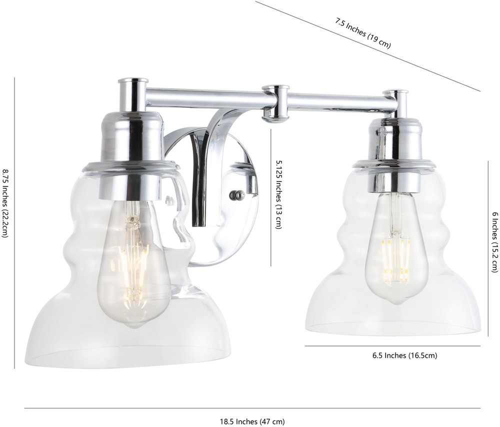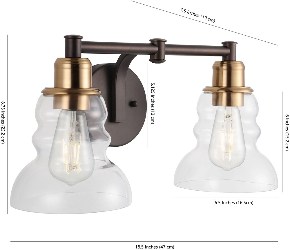 Number of Bulbs: 2 Pattern: Refer to Item Photo Type: Vanity Lighting Item Width: 18.5 Country/Region of Manufacture: China Brand: JONATHAN Y Lighting Item Length: Unspecified Bulb Shape Code: Medium (E26) Model: JYL3545 Light Color: 2700K Features: JONATHAN Y Lighting JYL3545 Manhattan 2 Light 19" Item Height: 8.75 Voltage: 120 V Material: Glass, Iron