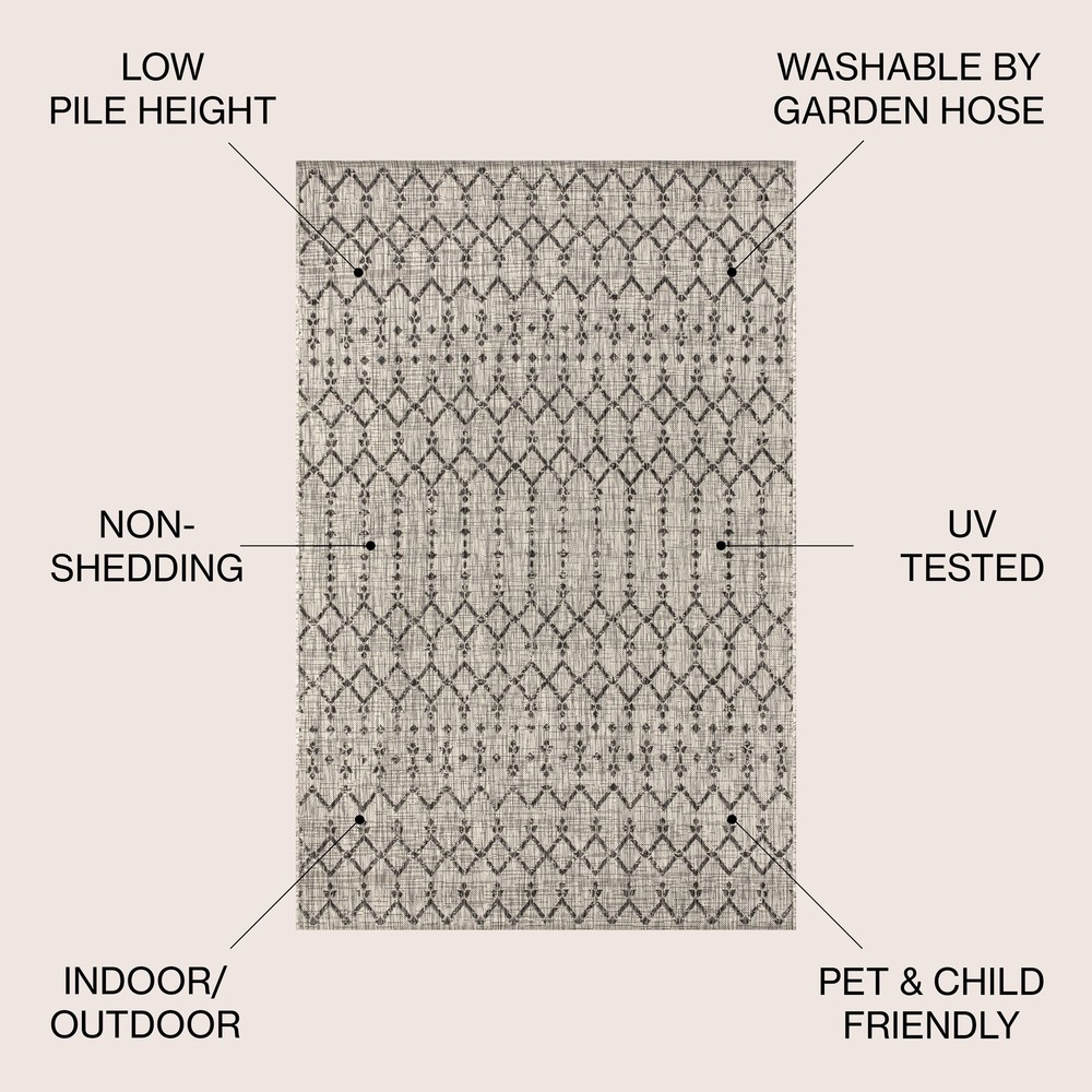 1. This rug instantly elevates my outdoor space with its gorgeous Moroccan-inspired design! The light gray and black geometric pattern adds just the right amount of vintage charm to my patio. I love how durable and easy to clean it is—perfect for high traffic areas. The quality is impressive, especially for the price, and it feels surprisingly soft underfoot. It's held up beautifully against weather and foot traffic while maintaining its vibrant colors. The perfect blend of style and function for any outdoor area!