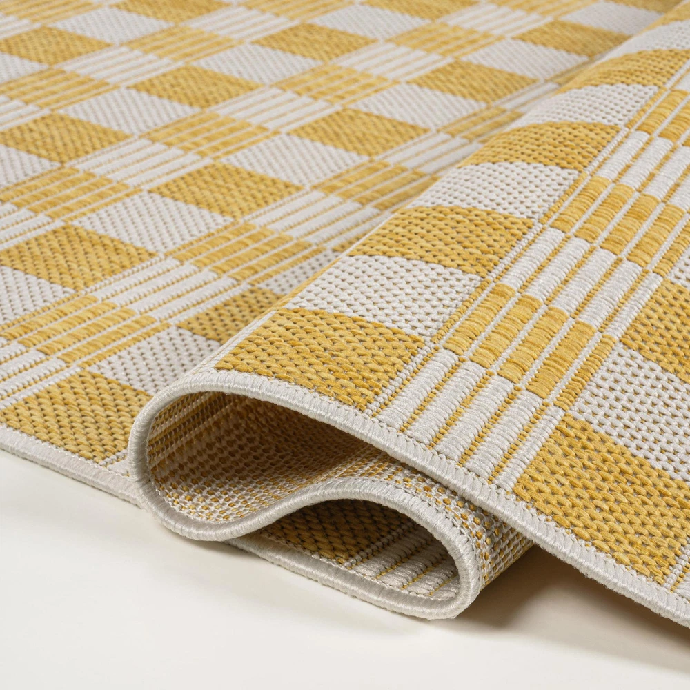 1. This rug is a game-changer for both indoor and outdoor spaces! The beautiful salmon and cream plaid pattern adds a cozy, rustic charm, while the polypropylene material makes it super durable and easy to clean. Perfect for high-traffic areas, it looks great on my patio but would work just as well in a living room or bedroom. The colors are vibrant, and the texture is soft yet sturdy. Such a stylish and practical choice—love it!