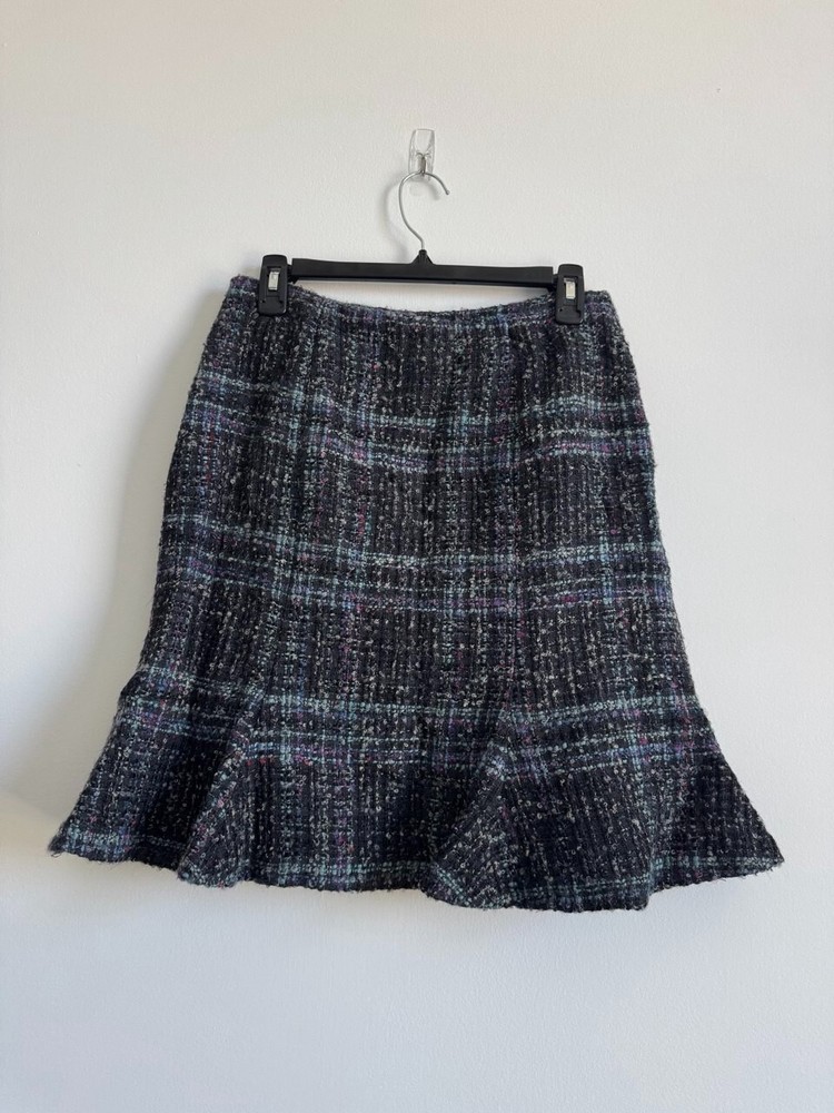 This Jones New York Wool Black Tweed Tulip Skirt in size 6 is a versatile and stylish addition to any woman's wardrobe. The skirt features a classic black color with a tweed fabric type, making it perfect for casual, workwear, or business occasions. It has a mid-rise and a midi length, featuring a tulip style that is both flattering and chic. The skirt is lined and should be dry cleaned only to maintain its quality. Made in Thailand, this skirt is a timeless piece that can be worn in winter, fall, and spring.