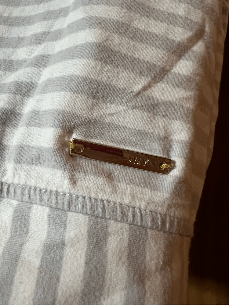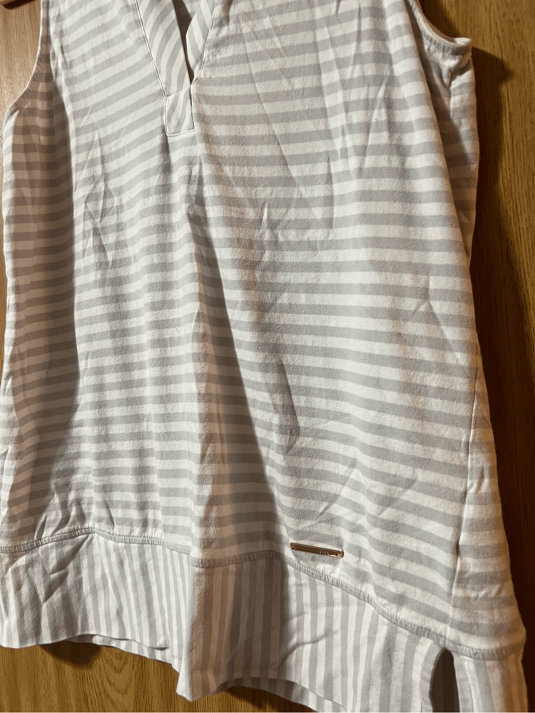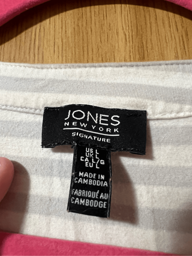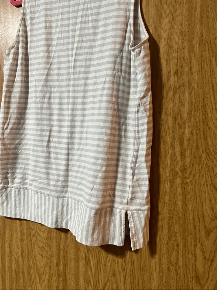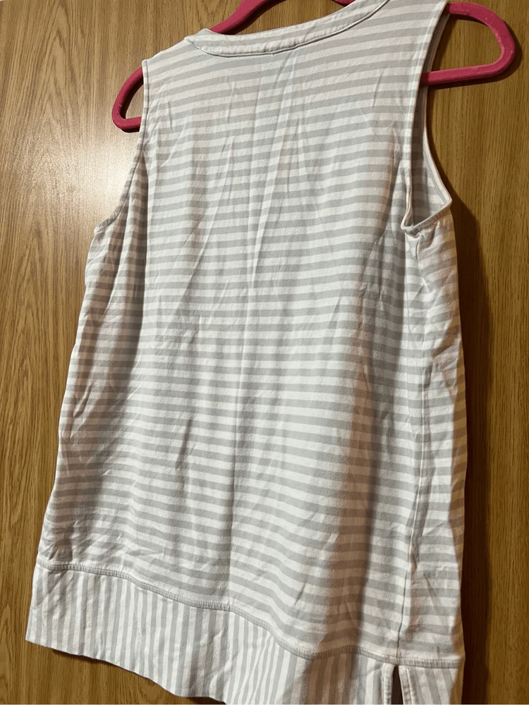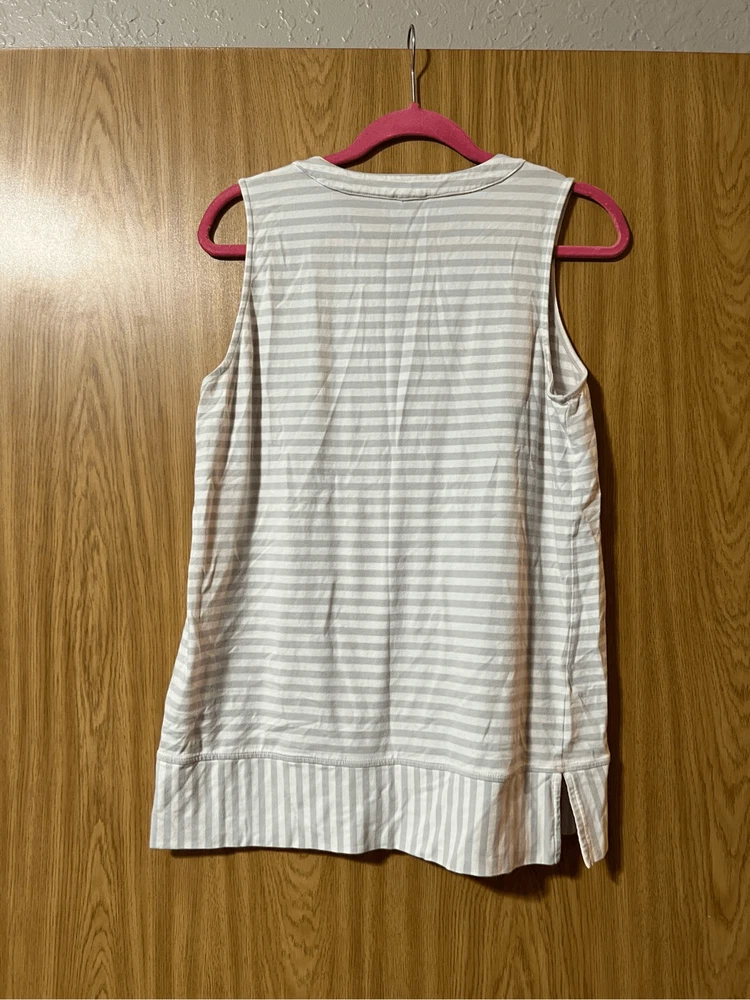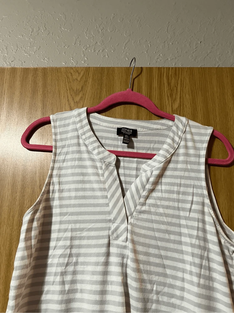 Jones New York grey & white striped v-neck tank top. Woman’s size large. Item is preowned and may have small flaws that I missed Color may very in person as my phone changes the colors sometimes Offers always welcome Check out our other listings! All items are cross posted.