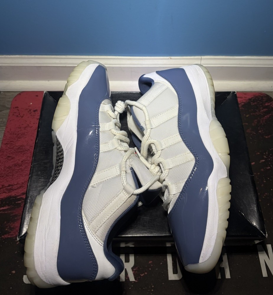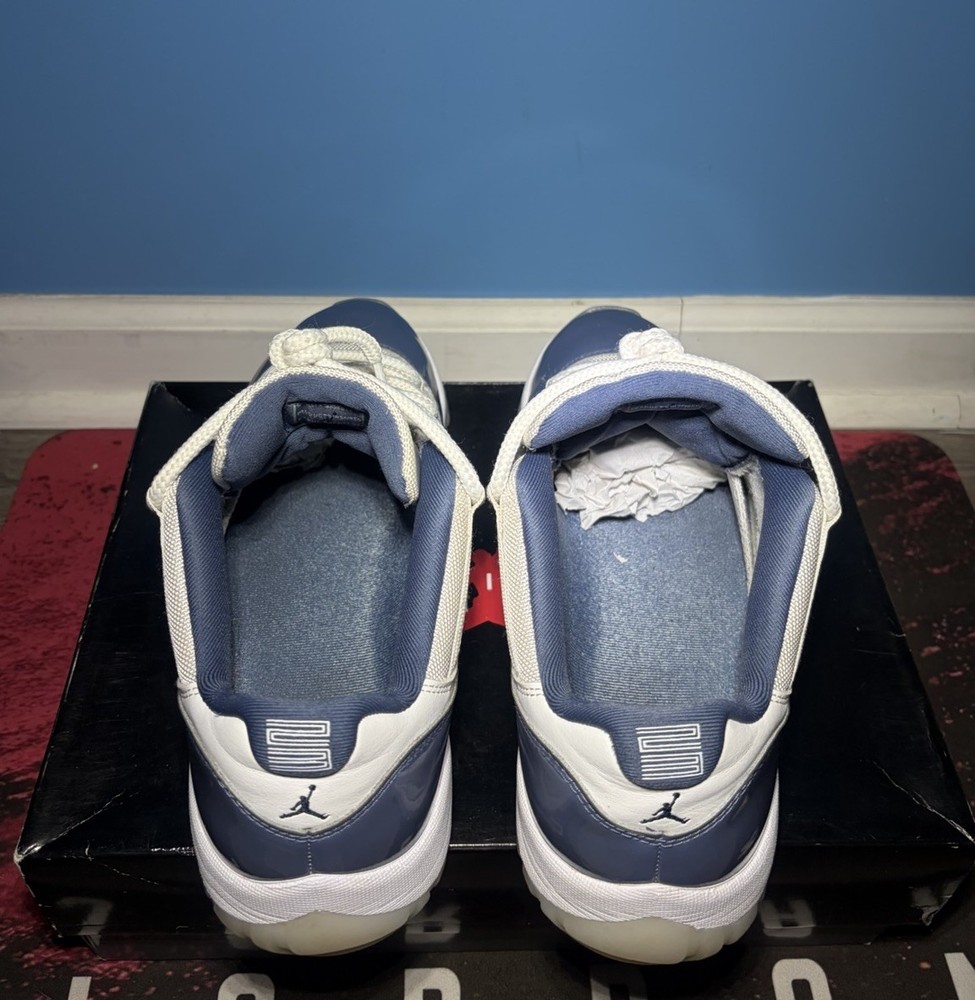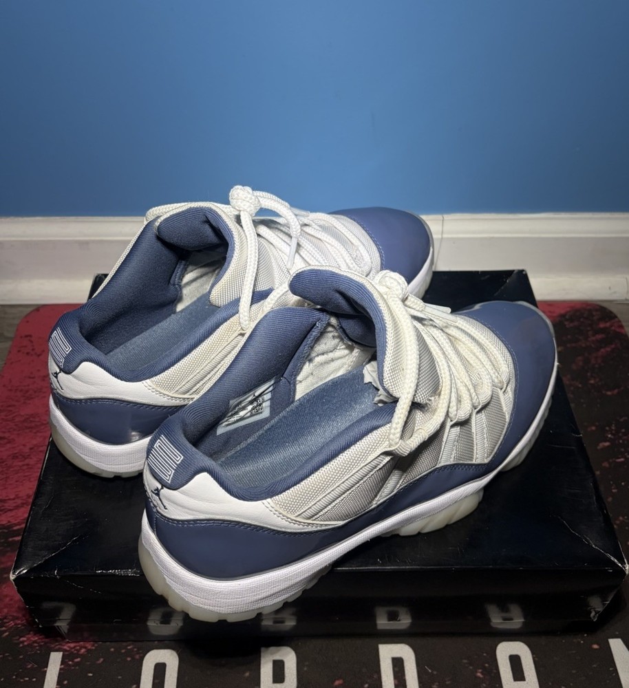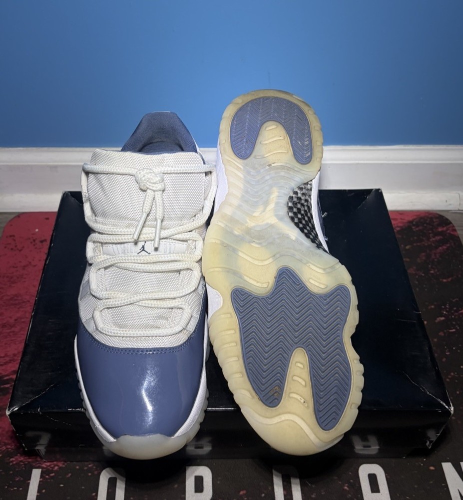 The product is a pair of Jordan 11 Low “Diffused Blue” sneakers in size 11. These athletic shoes feature a lace-up closure, rubber outsole, and comfort insole made of foam. The low-top design is perfect for activewear, with a retro theme and solid blue color that is great for the spring season. The original box adds to the authenticity of this Air Jordan 11 model, making it a desirable choice for basketball enthusiasts and sneaker collectors alike.