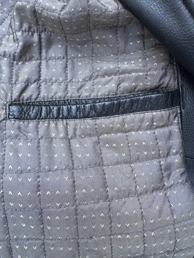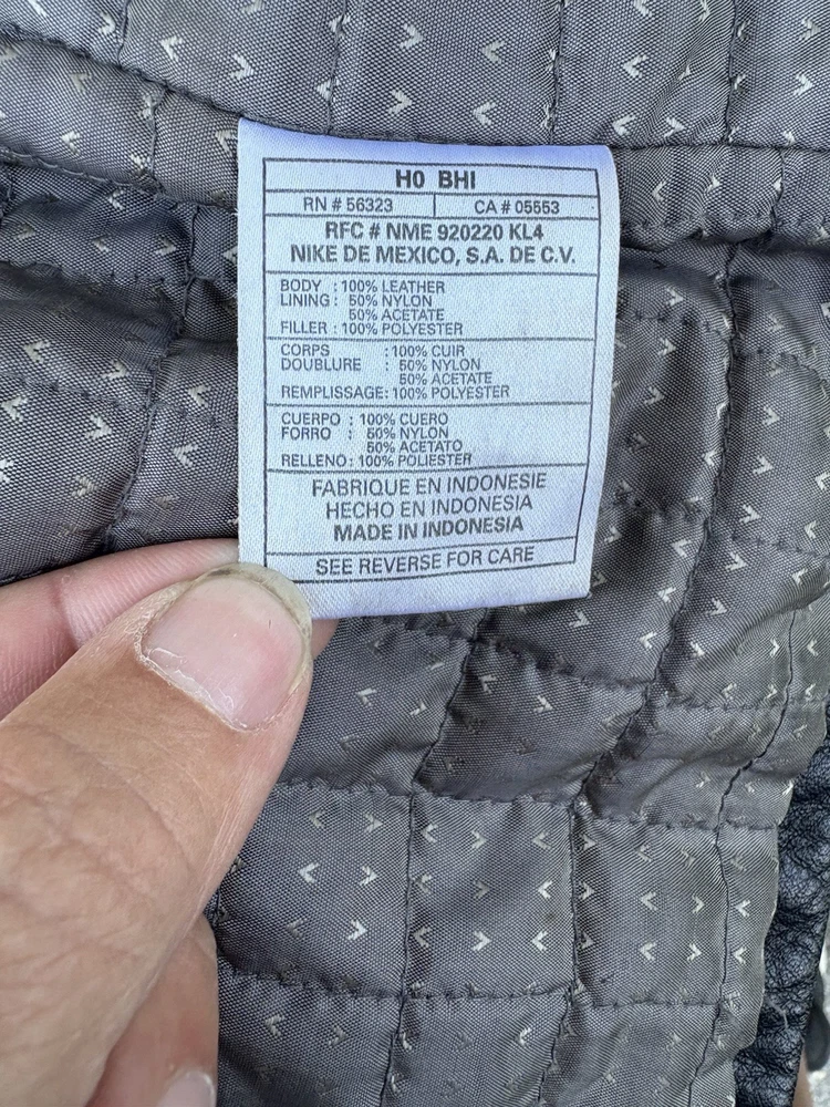 The product is a Jordan 23 Black Leather Jacket in size 2XL. Made with high-quality leather, this jacket features the iconic Jordan brand logo and is designed for men. The sleek black color adds a stylish touch to any outfit, making it a versatile and fashionable addition to any wardrobe. Perfect for those looking for a combination of luxury and streetwear fashion. Note fraying in the inside of jacket. Also the two front pockets have holes in them. Made in Indonesia.