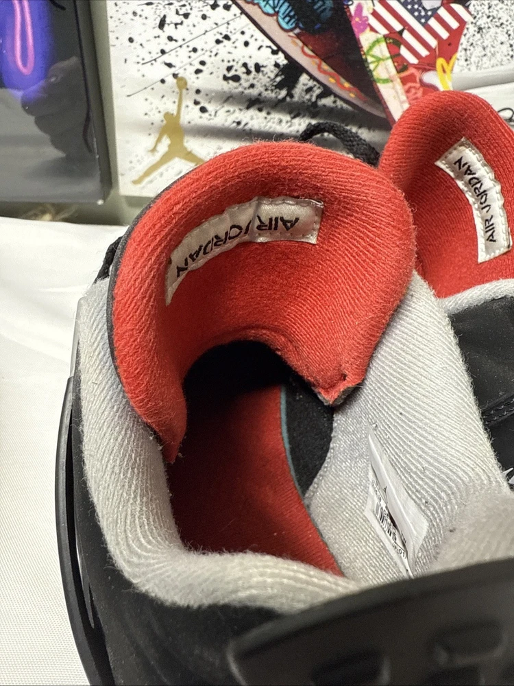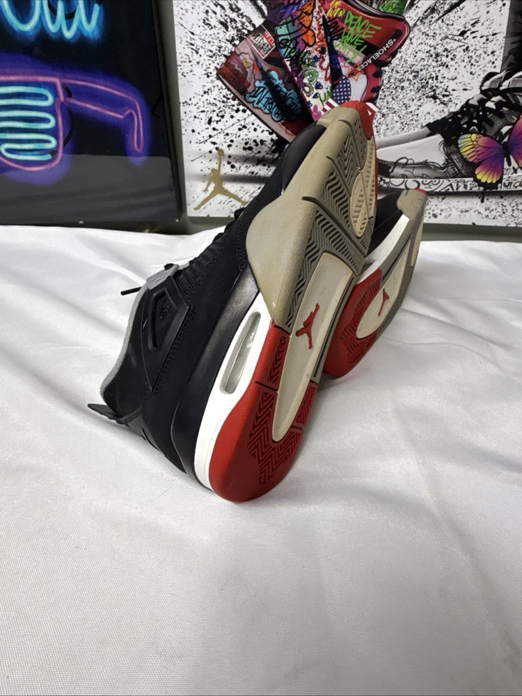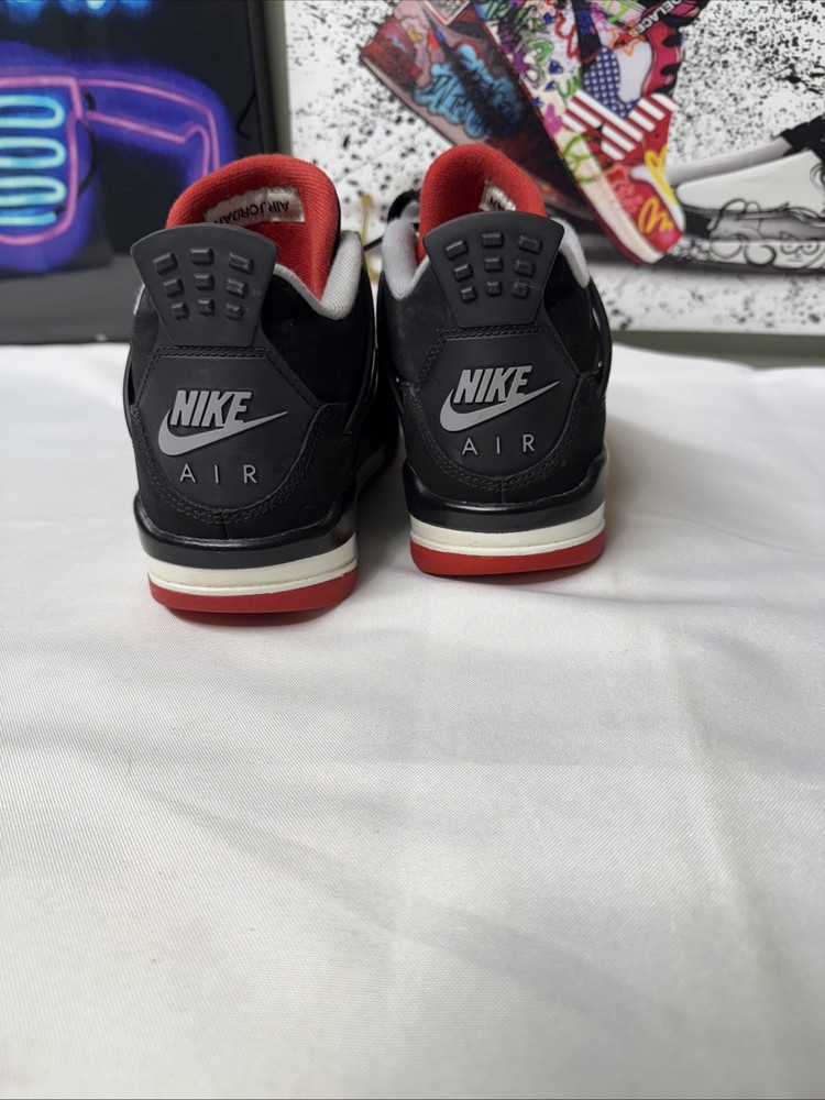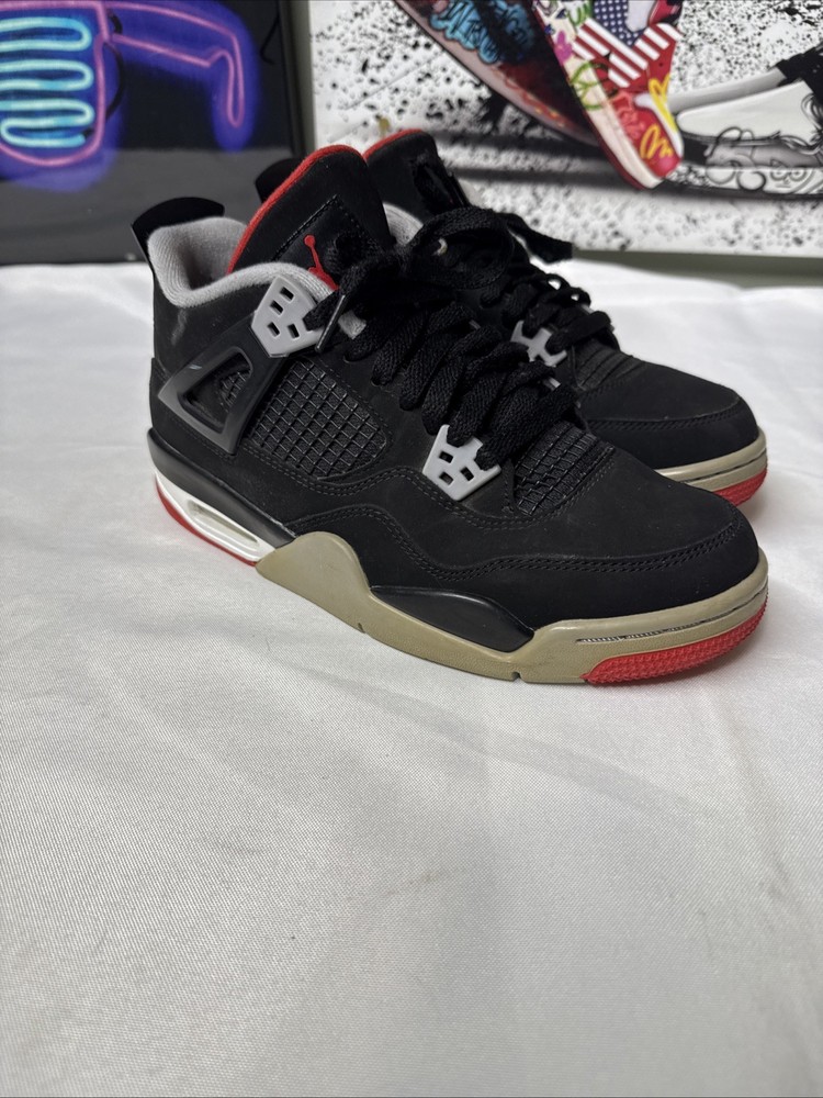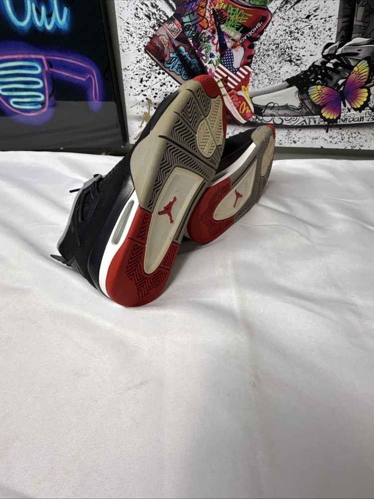 The product is a pair of Jordan 4 Retro Bred sneakers in size 6Y for boys. These athletic shoes are designed with a retro theme in black color, featuring the iconic Jordan brand. While they are used and come without the original box, they still hold value for collectors or fans of the brand. Perfect for active boys who want to rock a classic sneaker style.