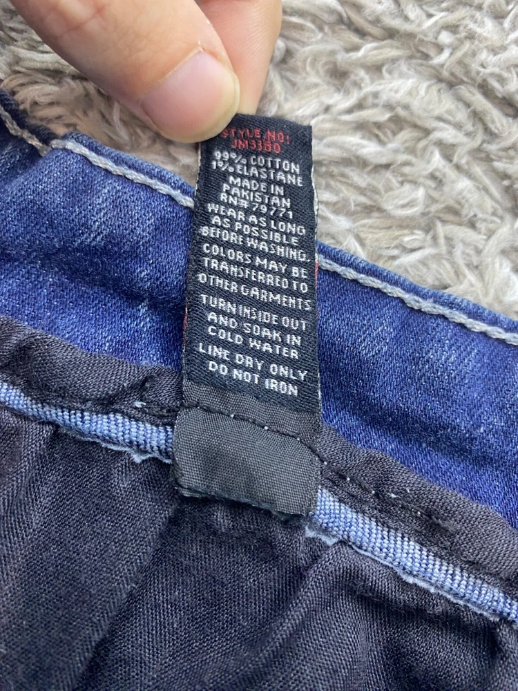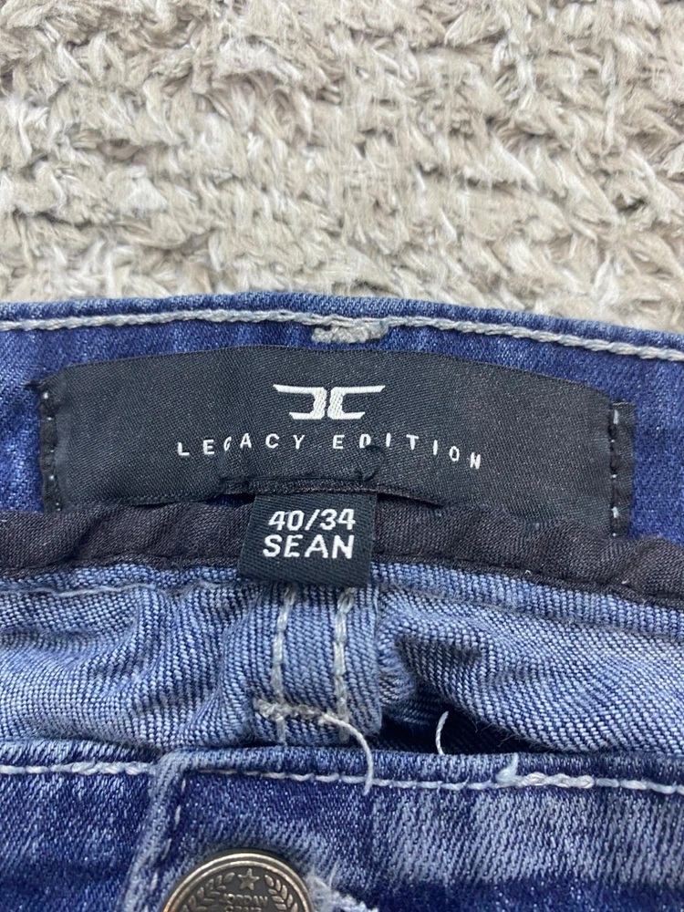 Accents: Button, Logo, Zipper Style: Straight Size Type: Regular Rise: Mid (10-12 in) Size: 40 Fit: Regular Inseam: 34 in Material: Cotton Garment Care: Machine Washable Features: Distressed Pattern: Striped Waist Size: 40 in Fabric Type: Denim Color: Blue Theme: Grunge, Hip Hop Department: Men Pocket Type: 5-Pocket Design Brand: Jordan Craig Type: Jeans Fabric Wash: Dark Closure: Button, Zip