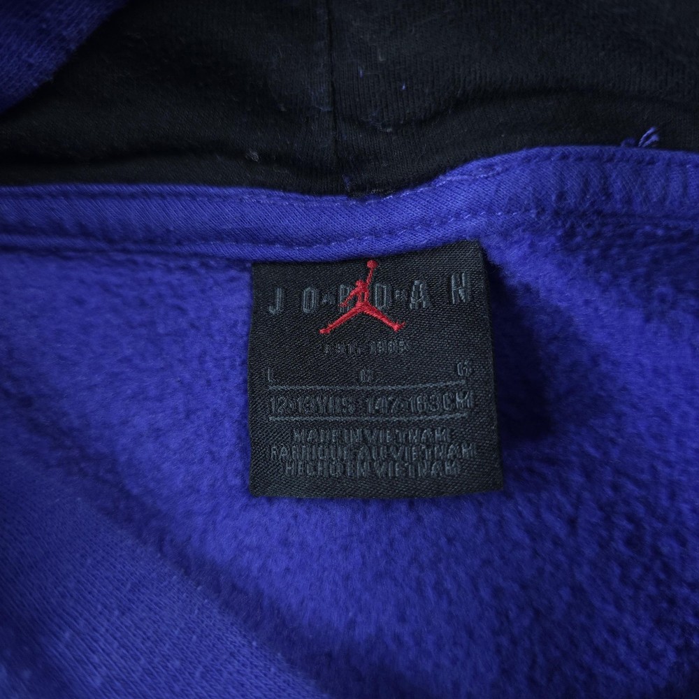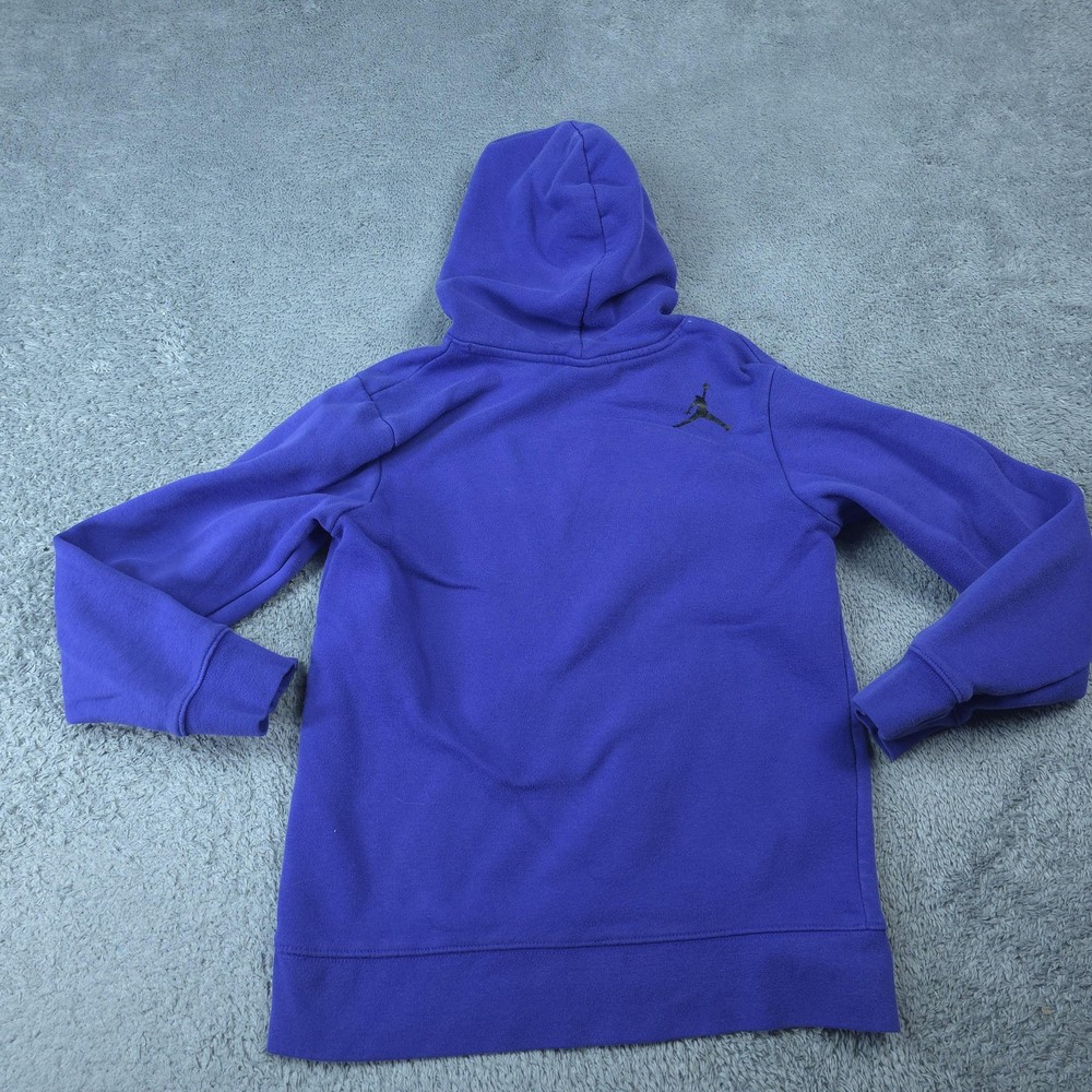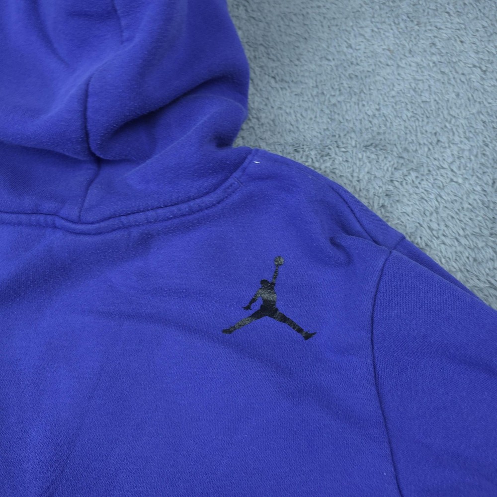 Brand: Jordan Item: Boys pullover hoodie sweatshirt Color: Blue with large white stylized JORDAN text and small NIKE lettering across the front Size on tag: L (Boys 12-13 YRS / 147-158 CM) Fabric: Soft fleece knit designed for warmth and everyday comfort Label details: Black woven Jordan neck label with red Jumpman logo; size L 12-13 YRS (147-158 CM); Made in Vietnam Design features: Pullover style with attached hood, front kangaroo pocket, ribbed sleeve cuffs and hem, and cozy brushed fleece interior Branding: Bold front Jordan Nike graphic on chest and small black Jumpman logo screen print on upper back shoulder Style: Casual sportswear hoodie ideal for basketball fans and everyday athletic-inspired wear Please review all photos to see the color, graphics, and overall style of the hoodie. Item is in gently worn pre-owned condition. Item may contain normal signs of wear, blemishes, discoloration, creases and/or other signs of distress. Photos depict the exact item you will receive including measurements . Please refer to photos for full details prior to purchasing. If need be please measure against a similar clothing item you own. Items are cleaned in accordance with eBay's policies and standards and stored in a smoke free weather controlled environment. Fast USPS Shipping - 30 Day Free Returns - Hats Ship in a Box