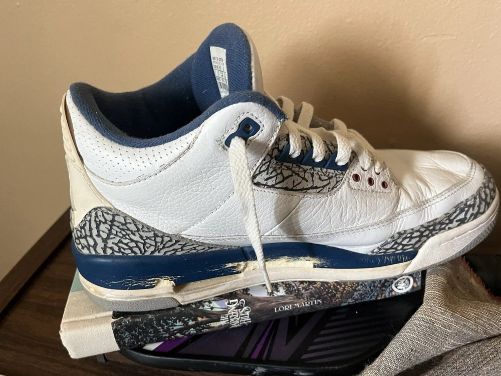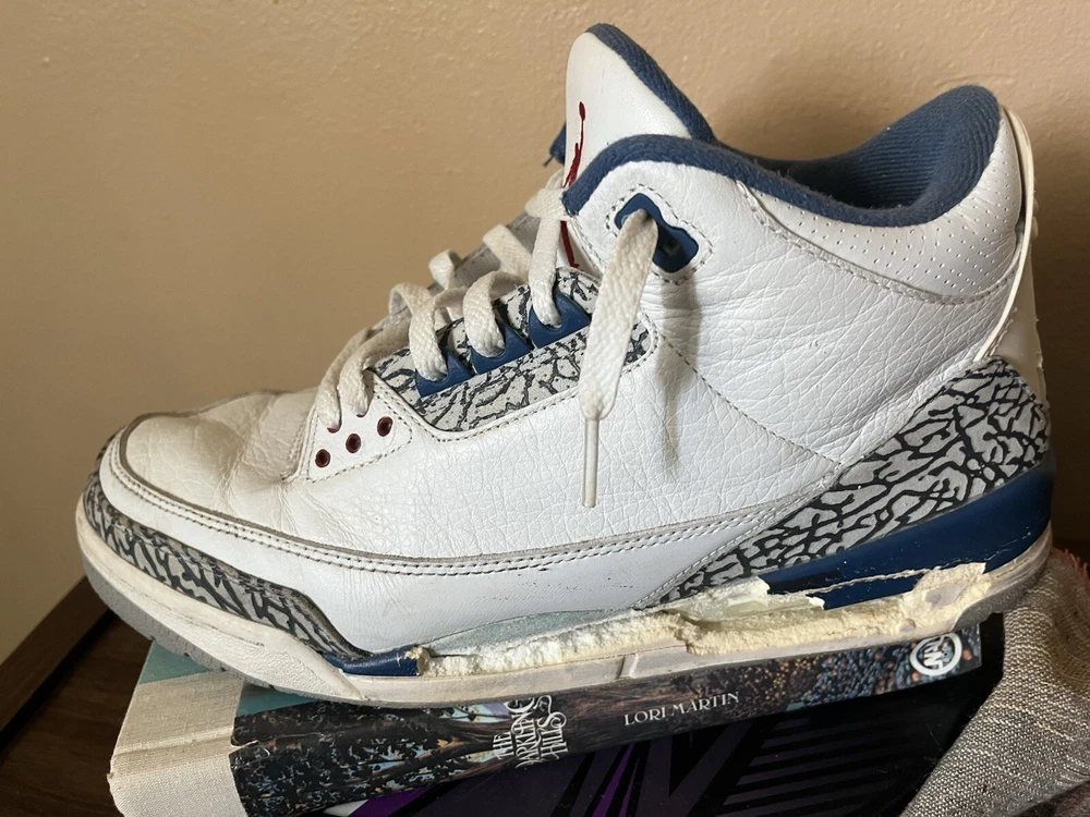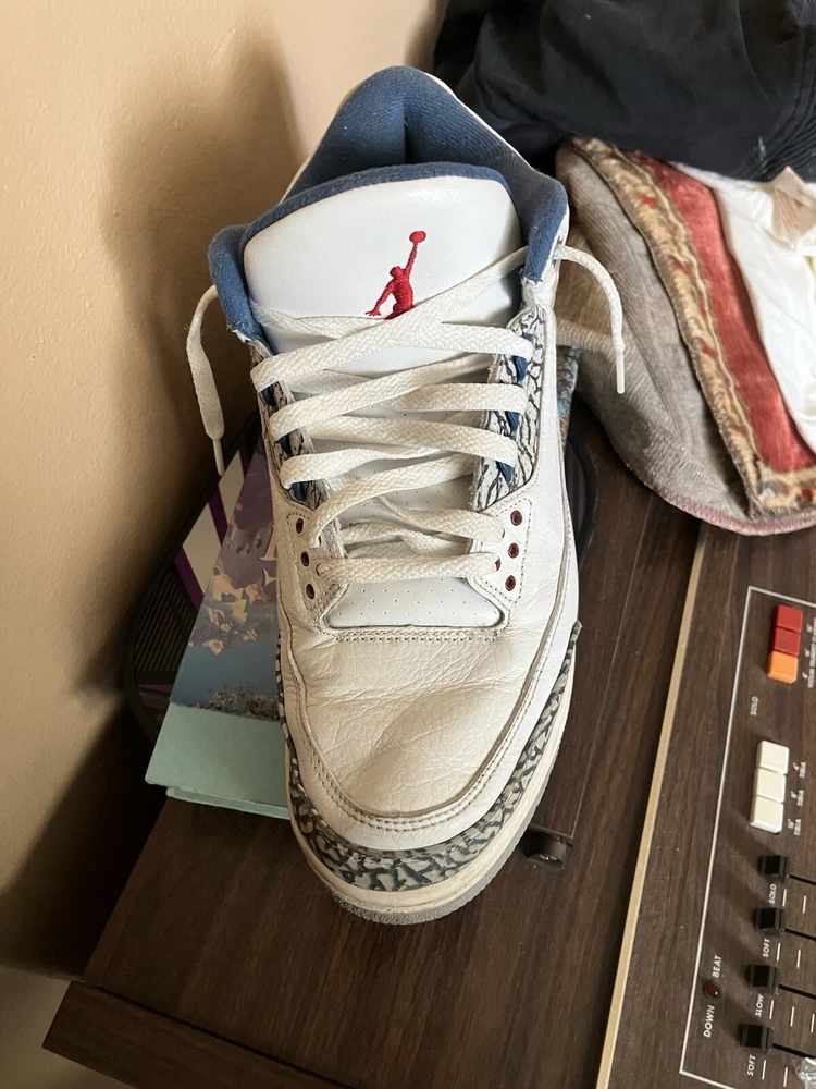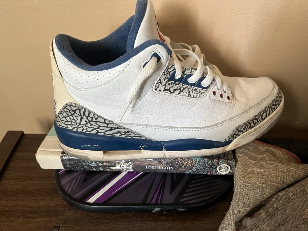 This is a pre-owned pair of Jordan Retro True Blue sneakers from 2001 in size 12 for men. They are part of the Air Jordan product line and feature a retro design. The sneakers are in the athletic style and bear the Jordan brand logo. They are not customized and are ideal for collectors or fans of vintage Jordan footwear.