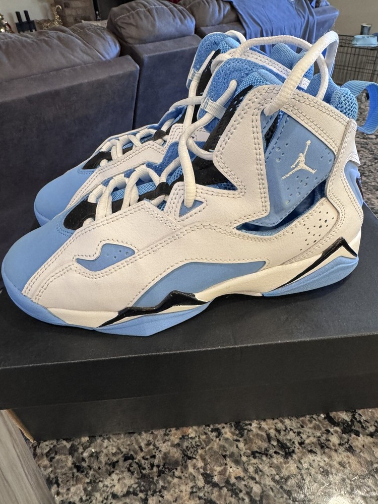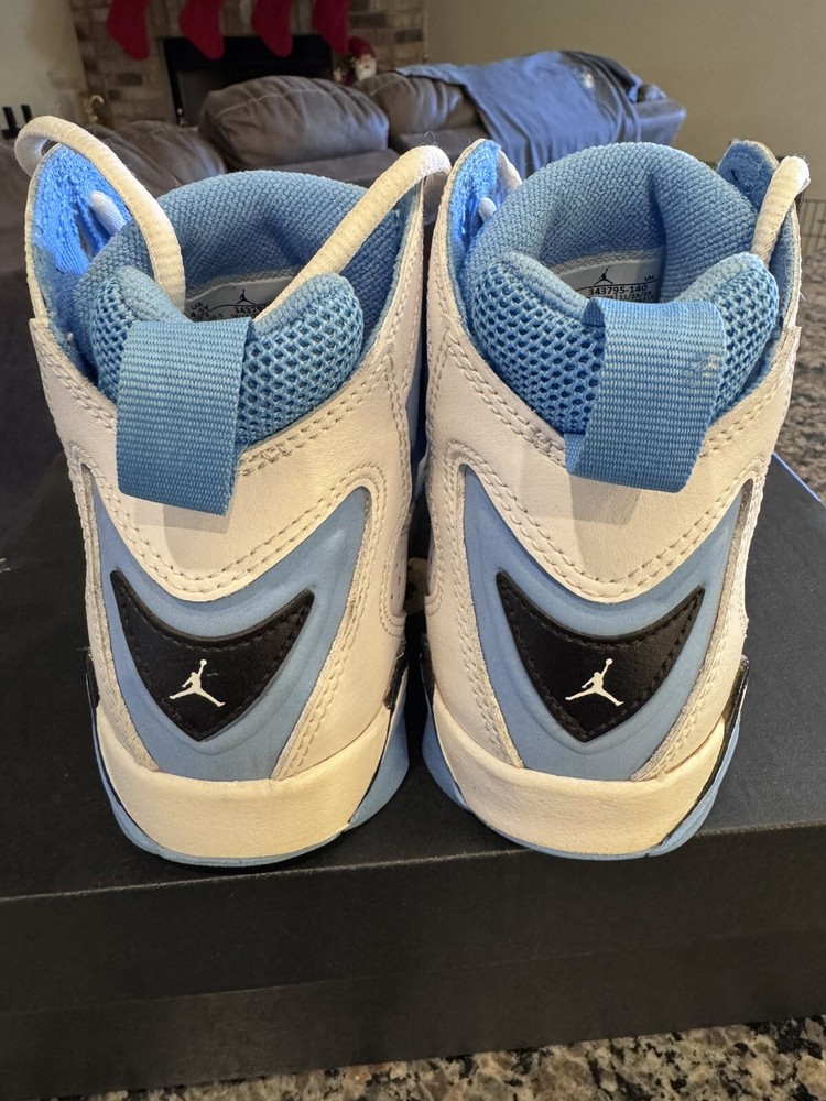 The product is a pair of Jordan True Flight sneakers in University Blue, designed for youth size 4. They feature the iconic Jordan brand and are inspired by university themes.