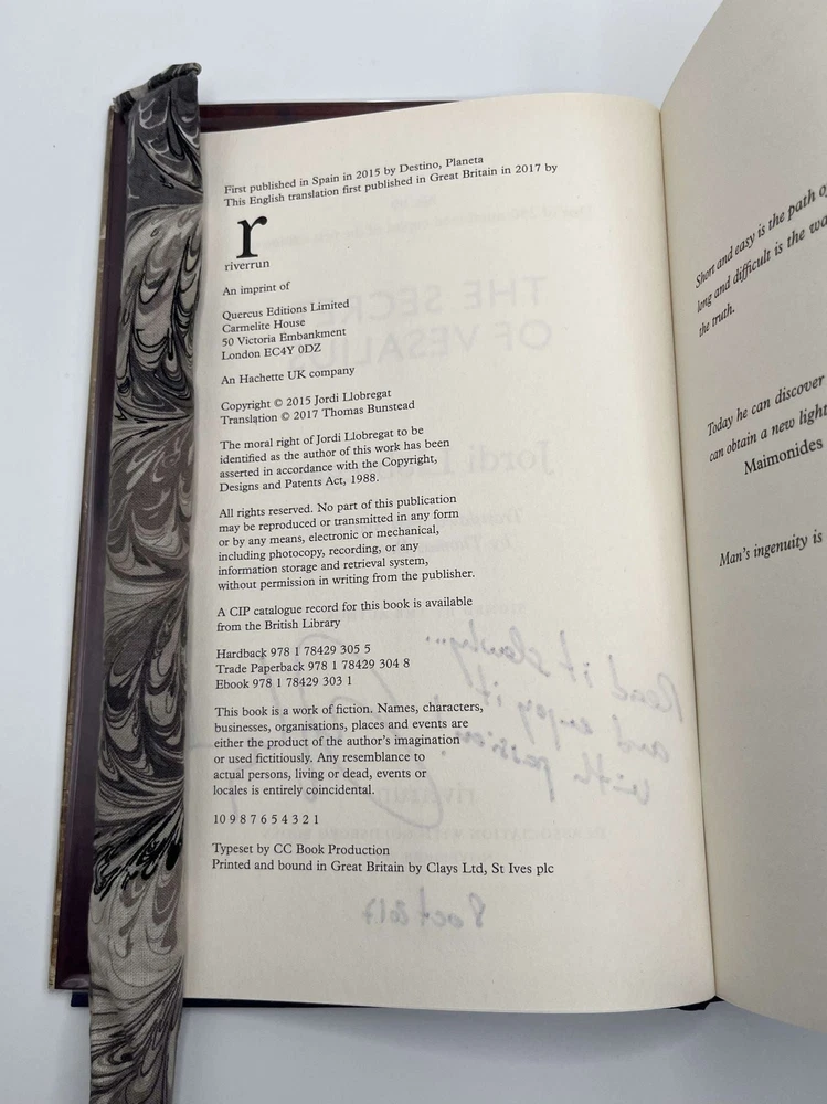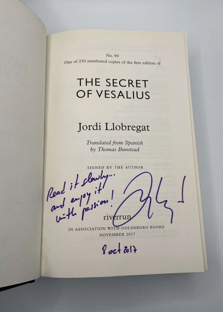 THE SECRET OF VESALIUS [Signed] Author: Llobregat, Jordi [Author]; Bunstead, Thomas [Translator] Title: THE SECRET OF VESALIUS [Signed] Publication: London, UK: Riverrun, 2017 Edition: Limited Edition #99/250 Description: Octavo, 582 pages. In Near Fine condition with Near Fine condition dust jacket. Spine is tan with dark red and black lettering. Dust jacket protected by mylar covering, price uncut: "£20.00" on front flap. Signed "Read it slowly...and enjoy it with passion!" and dated "8 Oct 2017" by Jordi Llobregat [Author] on tipped in publisher's limitation page. Shelved in hallway. Seller ID: 1391472 Subject: European History, Literature Welcome to the eBay store of Second Story Books! DC's Oldest Rare and Used Bookstore, Second Story Books operates two open shops in the Washington D.C. metropolitan area. We have an extensive internet presence and provide accredited appraisals member ASA. This listing was created by Bibliopolis.