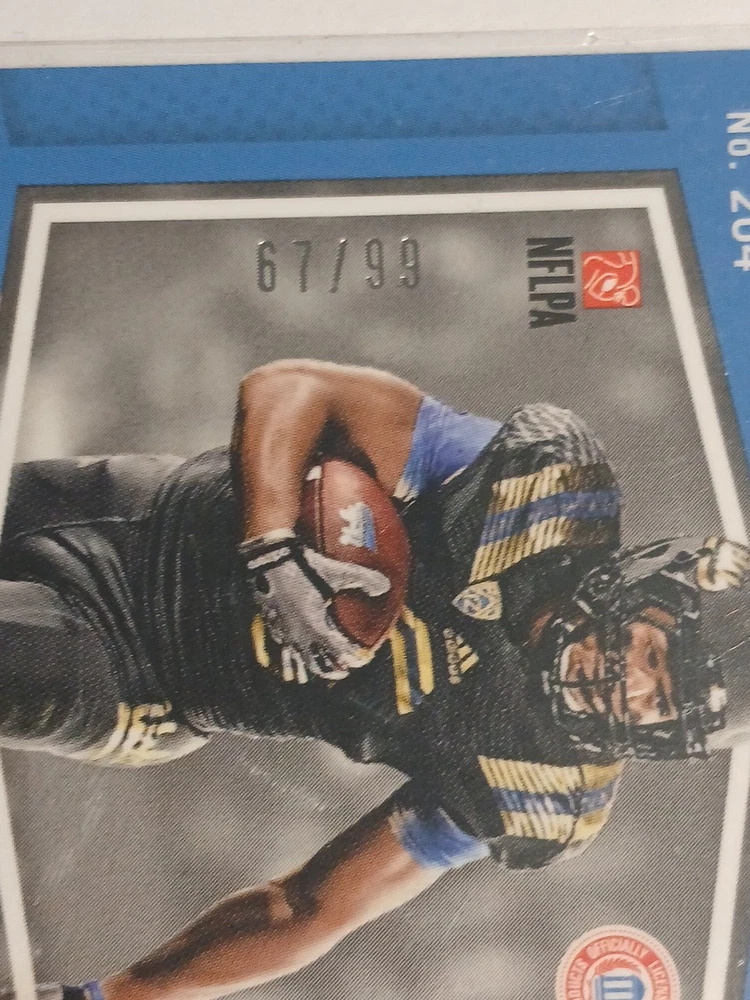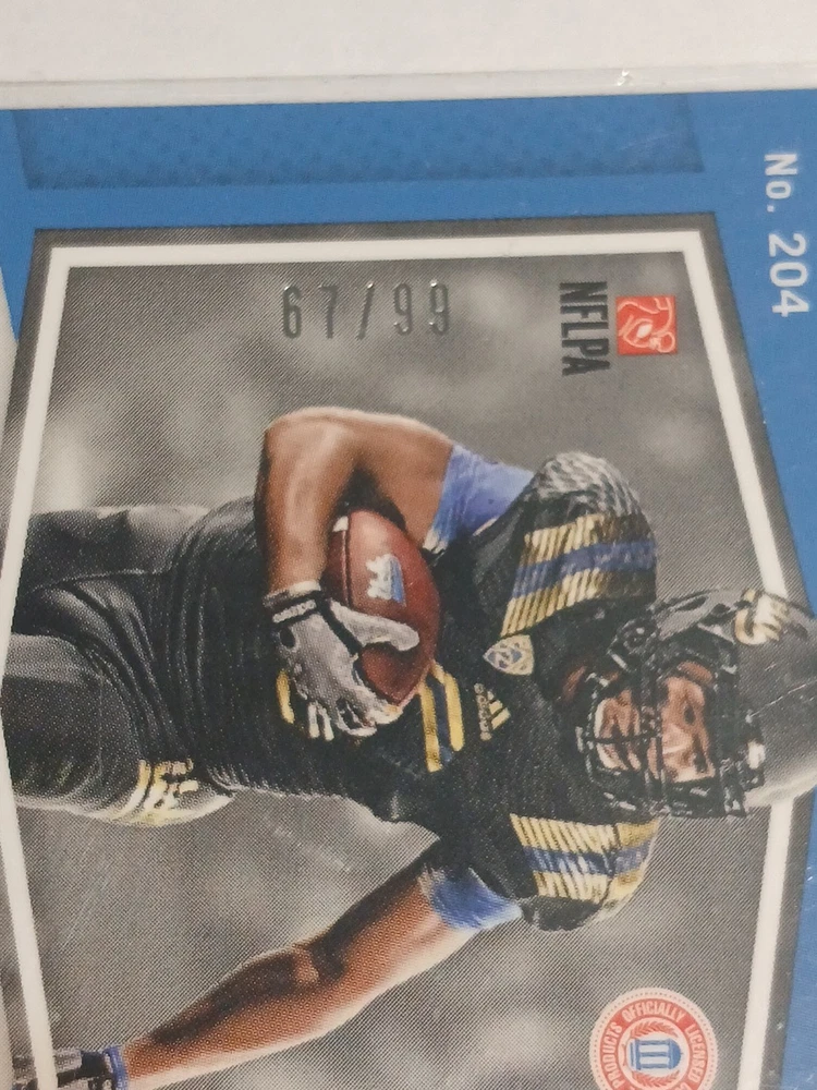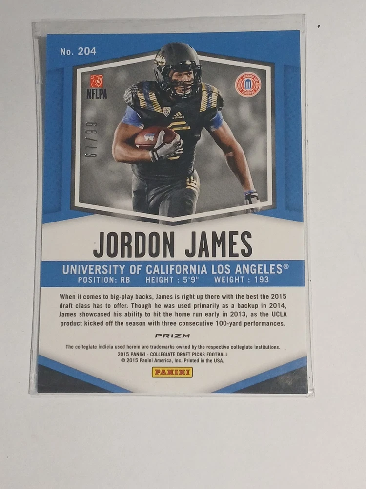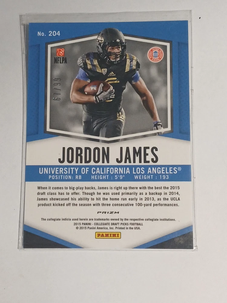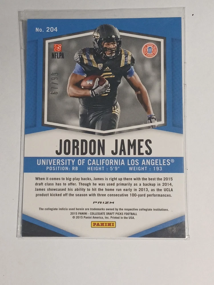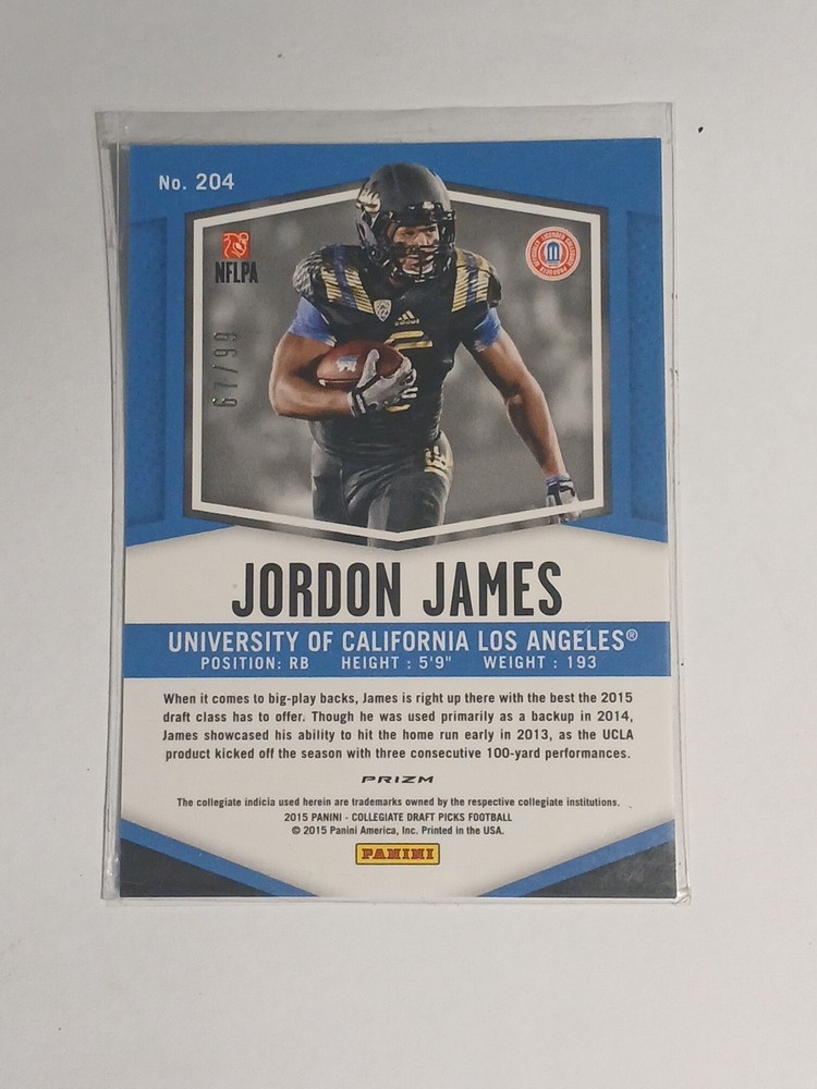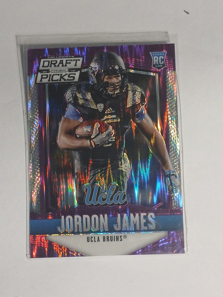 Elevate your collection with the Jordon James 2015 Panini Prizm Collegiate Draft Picks Purple Flash Rookie card. This limited edition piece, numbered to just 99, captures the essence of the UCLA Bruins football spirit. A must-have for any serious collector, it features the coveted Purple Flash parallel that shines among others in the set. The card, featuring player Jordon James, is a testament to his athletic prowess on the field during the 2015 season. As part of the esteemed 2015 Panini Prizm Collegiate Draft Picks series, card number 204 stands out with its serial numbering and rookie status, making it a prized possession for fans and collectors alike.